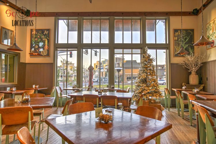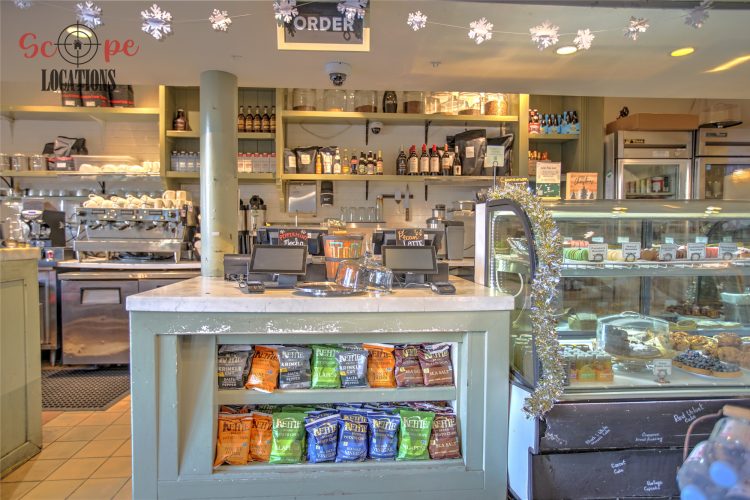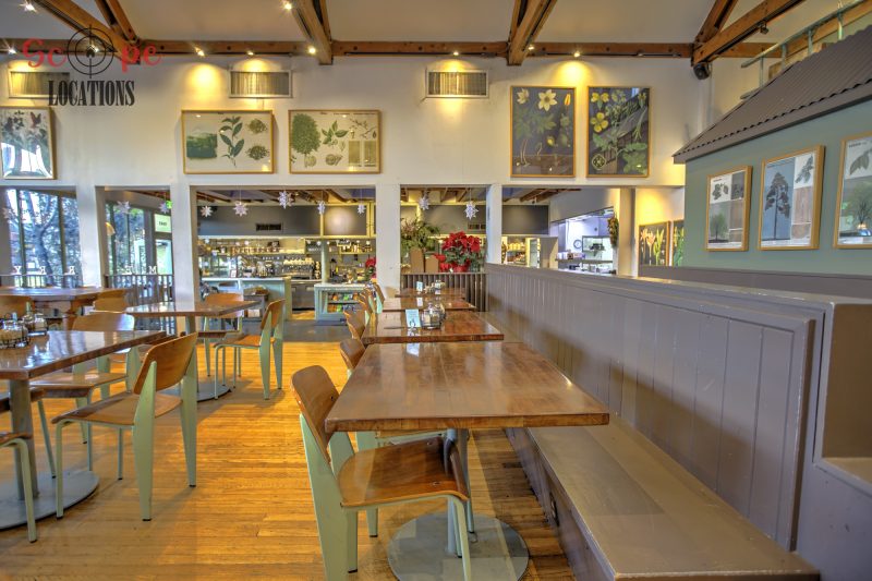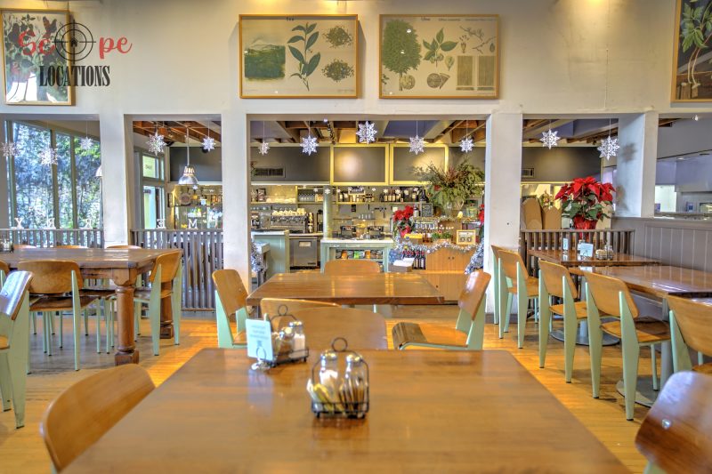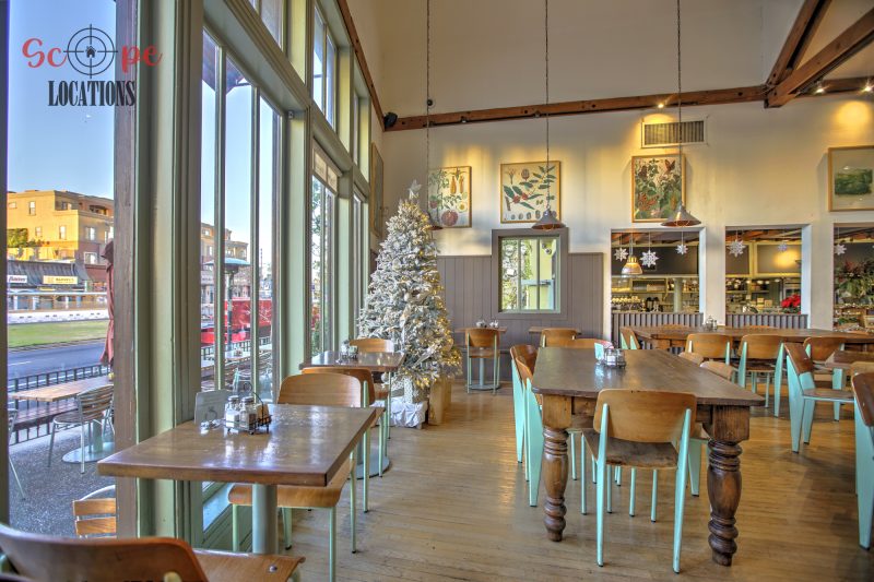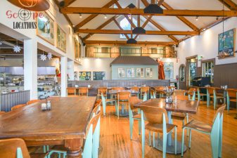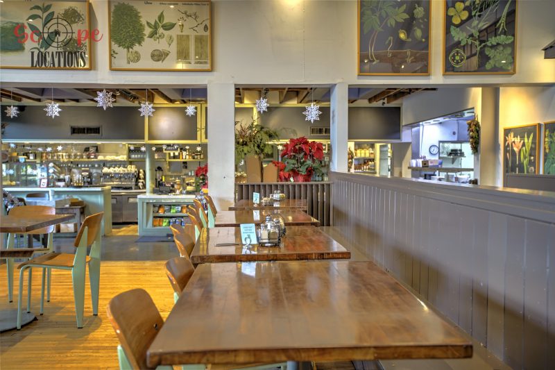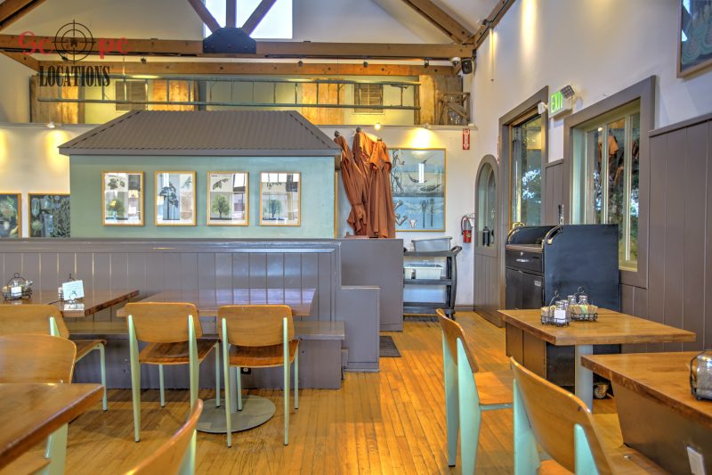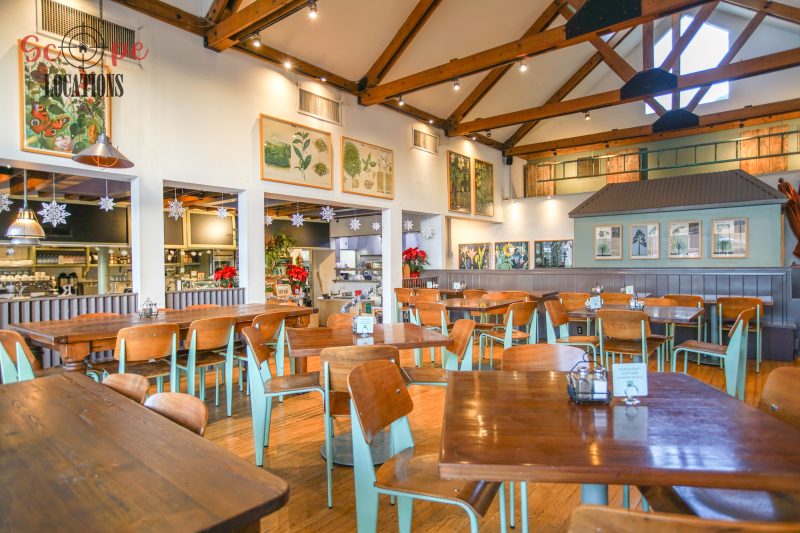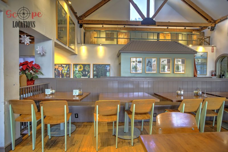 Welcome to this captivating filming location, a restaurant/cafe adorned with a cathedral-style ceiling accented by triangular wood beams that elegantly mirror the roofline’s pitch. Stepping into the venue reveals an open and airy dining area, boasting floor-to-ceiling windows that flood the space with natural light. With a rustic ambiance, wooden tables complemented by olive green and gray accents evoke a cozy yet stylish atmosphere.