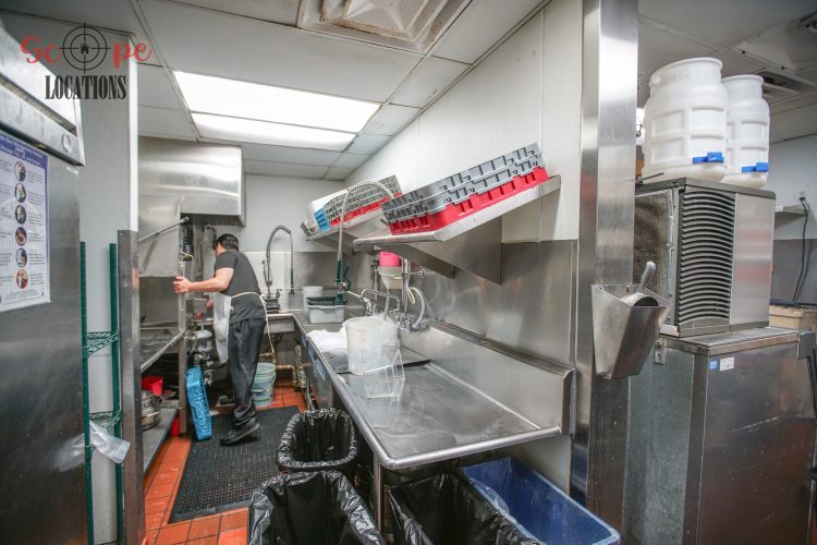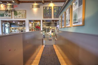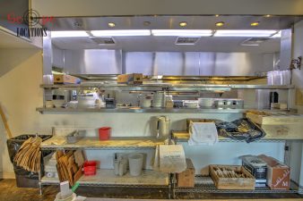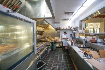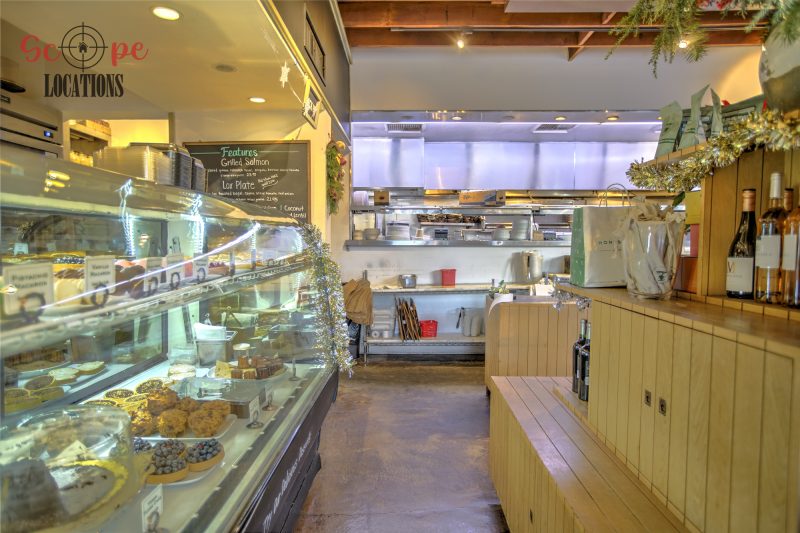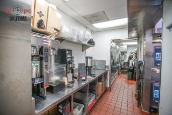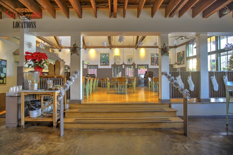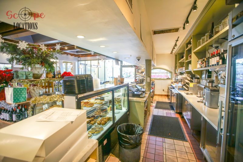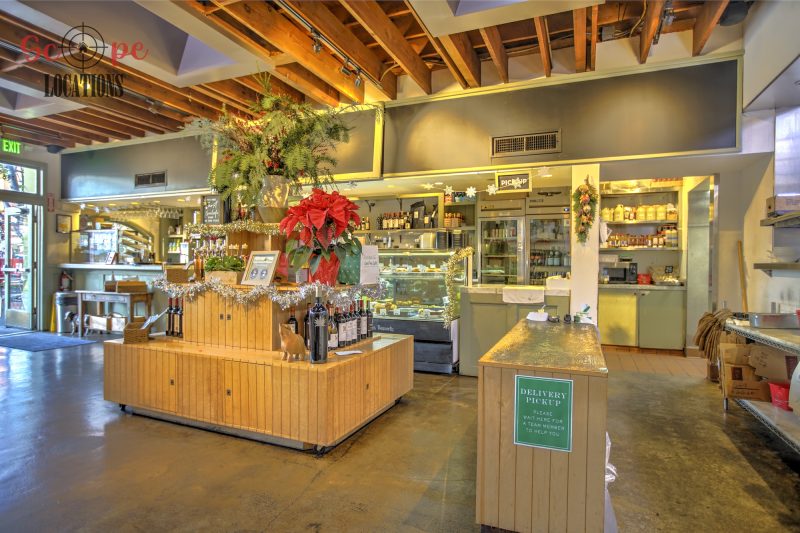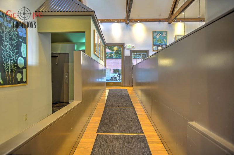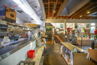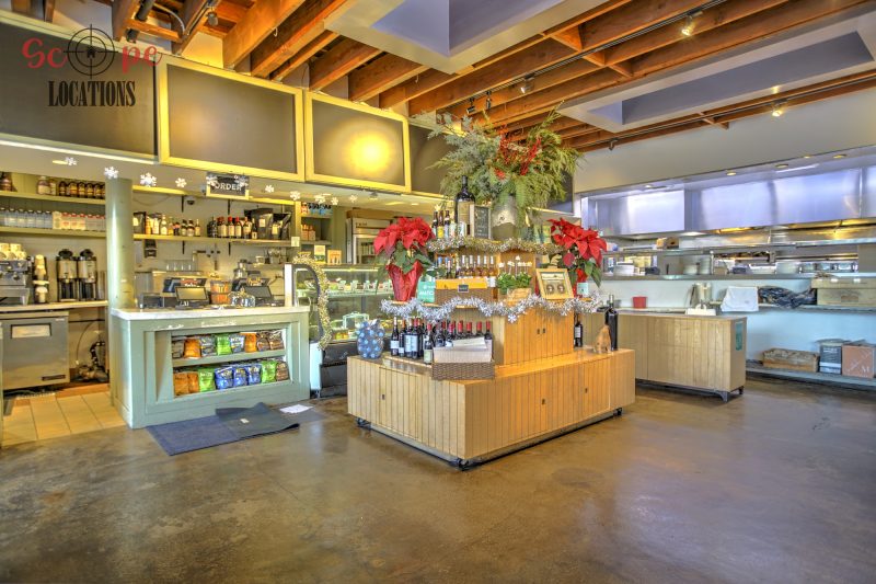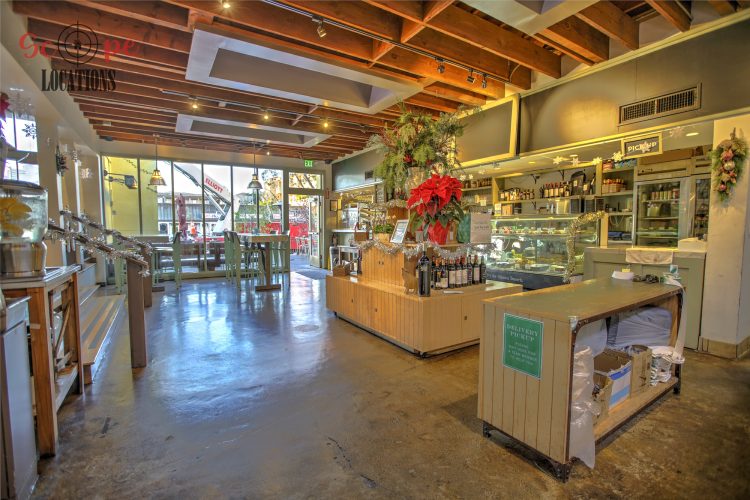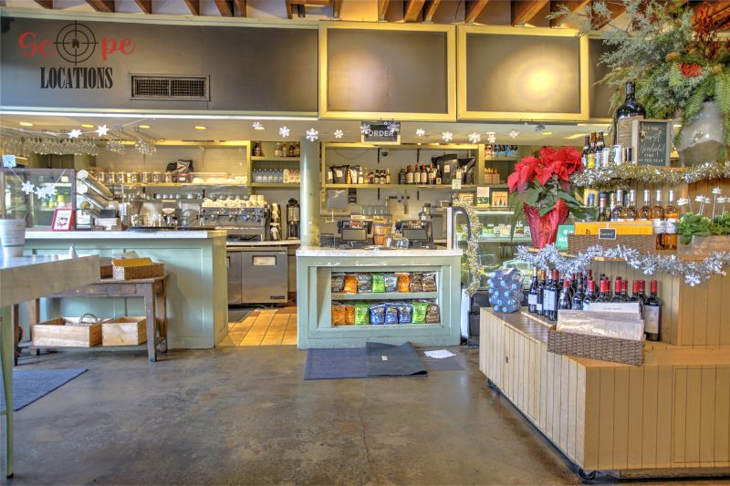 Welcome to this captivating filming location, a restaurant/cafe adorned with a cathedral-style ceiling accented by triangular wood beams that elegantly mirror the roofline’s pitch. Stepping into the venue reveals an open and airy dining area, boasting floor-to-ceiling windows that flood the space with natural light. With a rustic ambiance, wooden tables complemented by olive green and gray accents evoke a cozy yet stylish atmosphere.