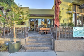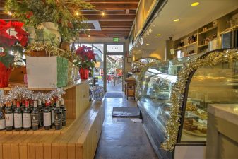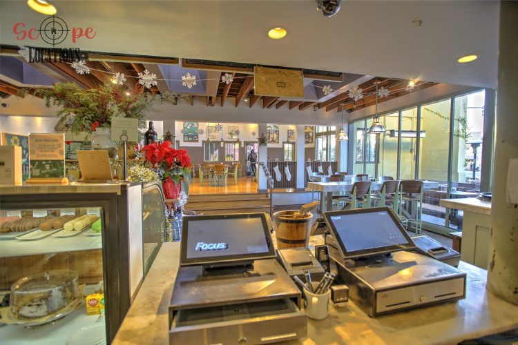 Transitioning a few steps down through rectangular openings seamlessly divides the dining area from the ordering/counter section, with an ADA ramp provided for accessibility. A charming wooden display showcasing wines and restaurant favorites sits in front of the ordering area, while a dessert display case, glass-doored stainless steel refrigerators, and a prominent espresso coffee machine adorn the counter area.