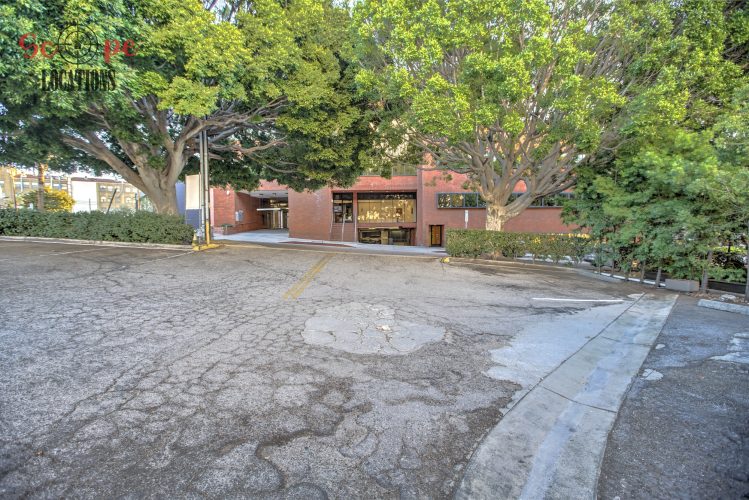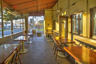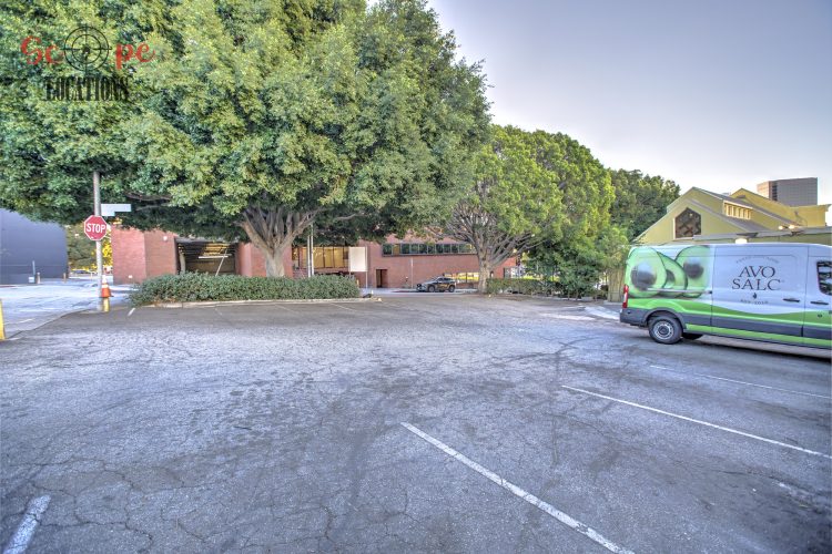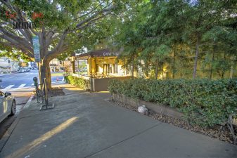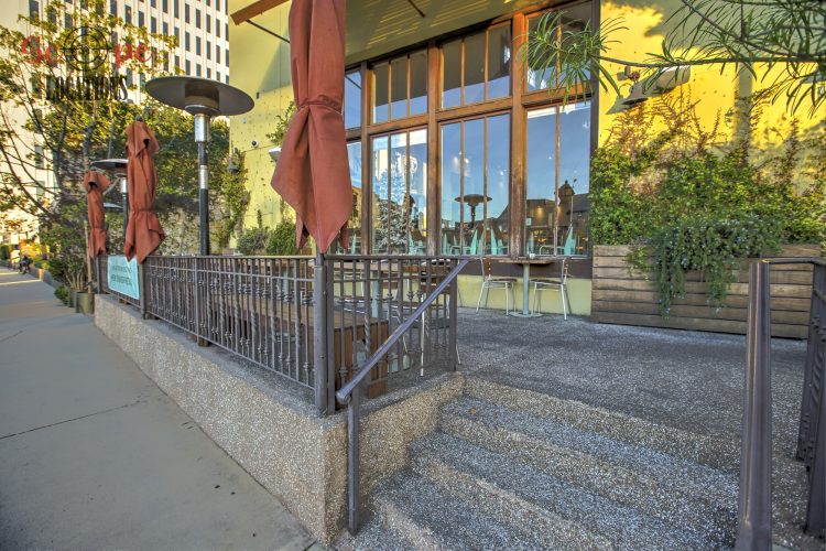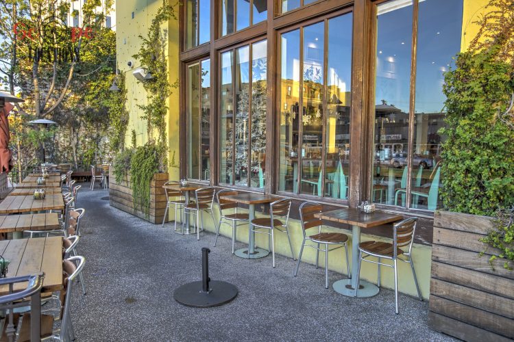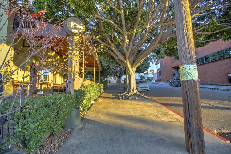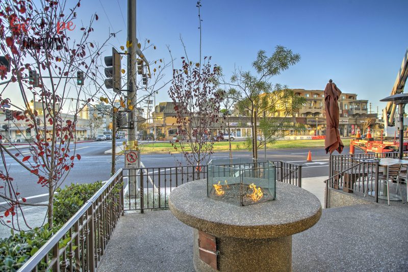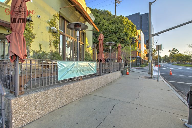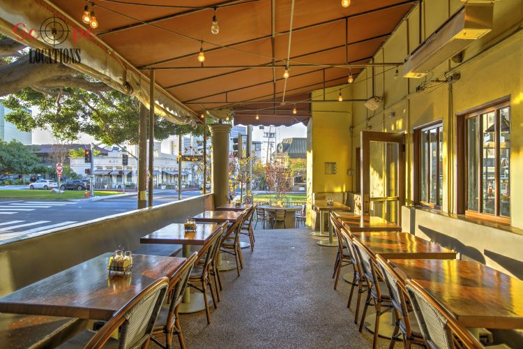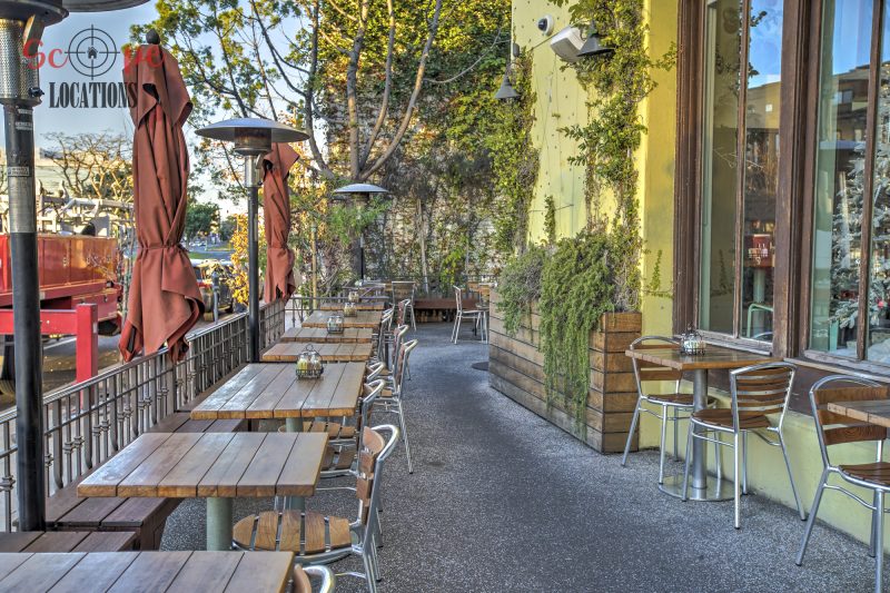 The ordering area features exposed ceilings that flaunt natural wooden beams, harmonizing with the natural-colored concrete floors that span the space. Outside, a spacious patio area offers a mix of bench-like seating and intimate two-seater tables, as well as a cozy circular firepit table for seating, creating an inviting al fresco dining setting. Across the way, a sizable park-like divider presents an ideal spot for camera placement, enhancing the versatility of this filming-friendly location.
