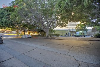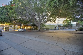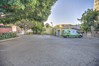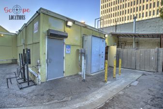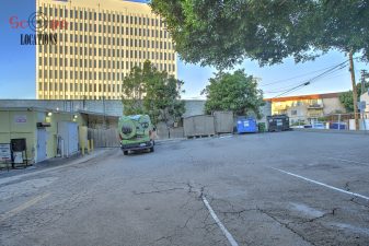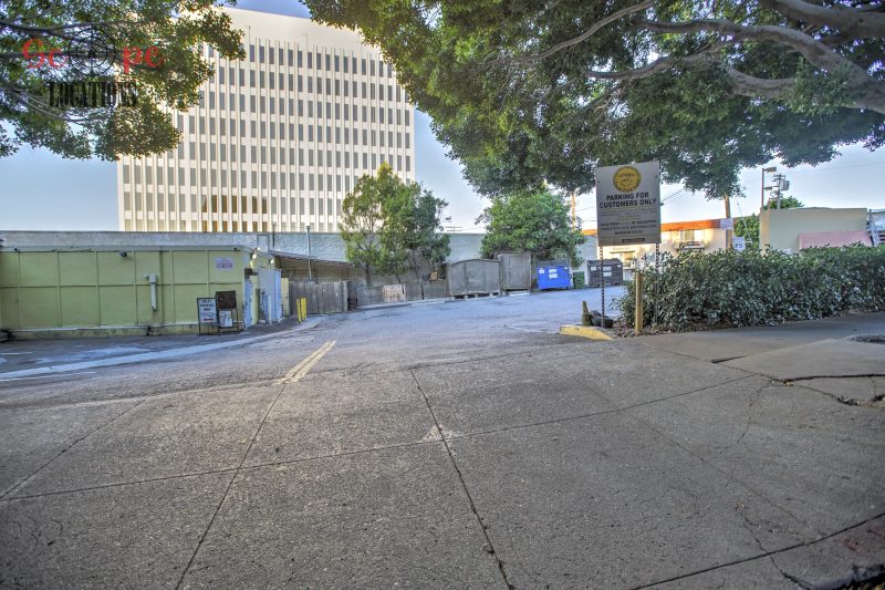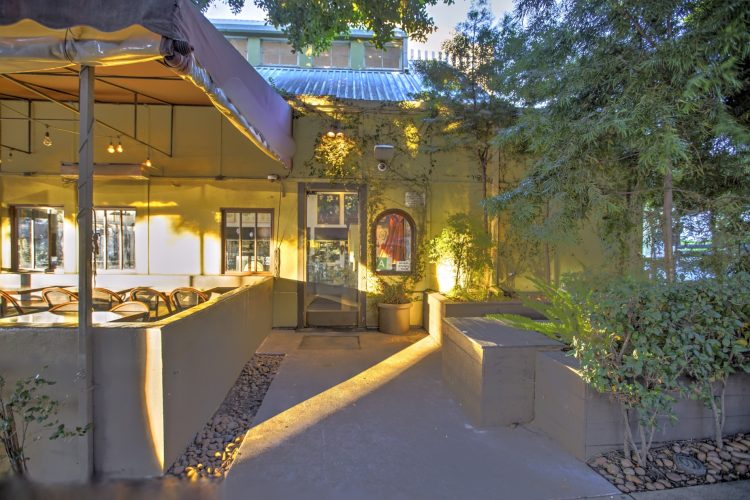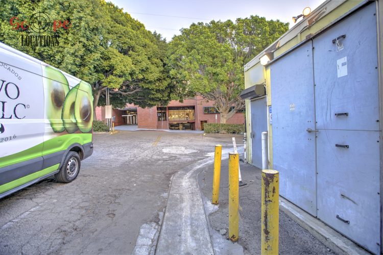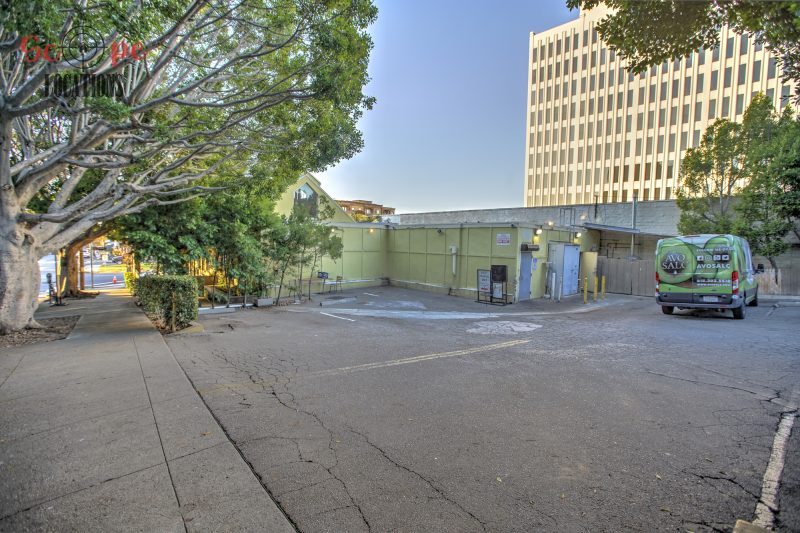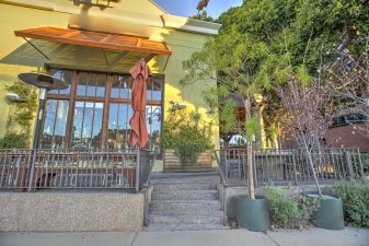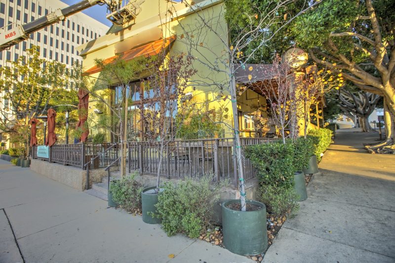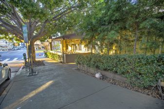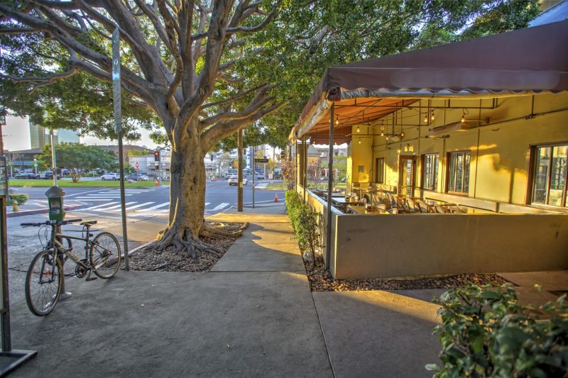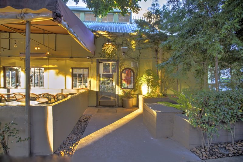 The ordering area features exposed ceilings that flaunt natural wooden beams, harmonizing with the natural-colored concrete floors that span the space. Outside, a spacious patio area offers a mix of bench-like seating and intimate two-seater tables, as well as a cozy circular firepit table for seating, creating an inviting al fresco dining setting. Across the way, a sizable park-like divider presents an ideal spot for camera placement, enhancing the versatility of this filming-friendly location.