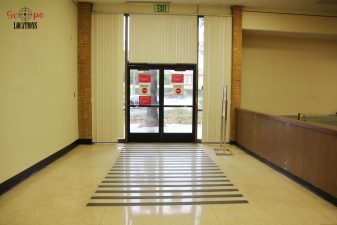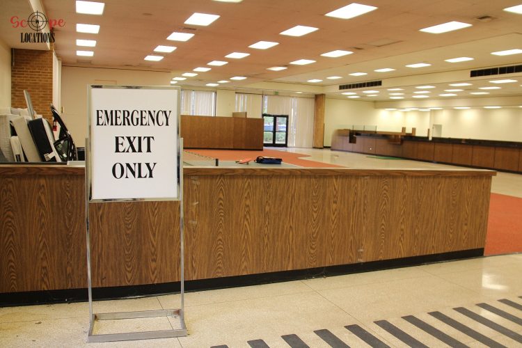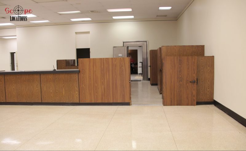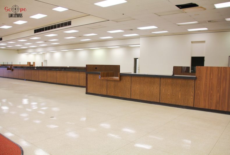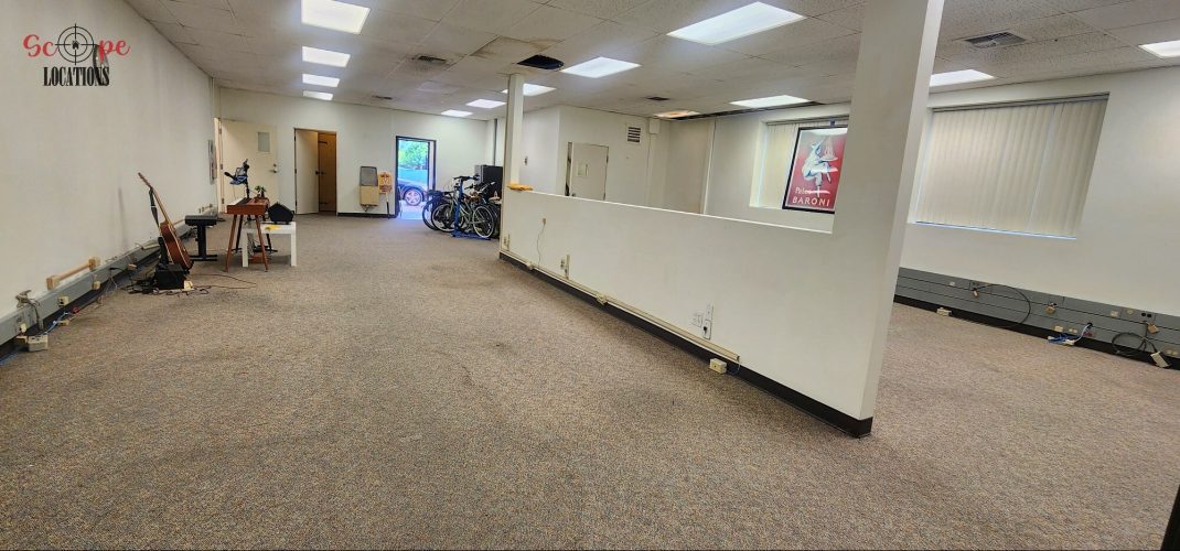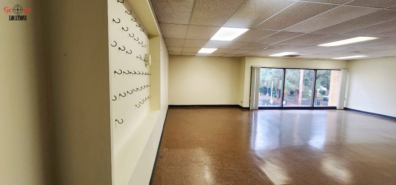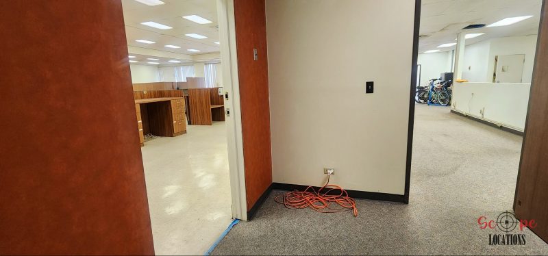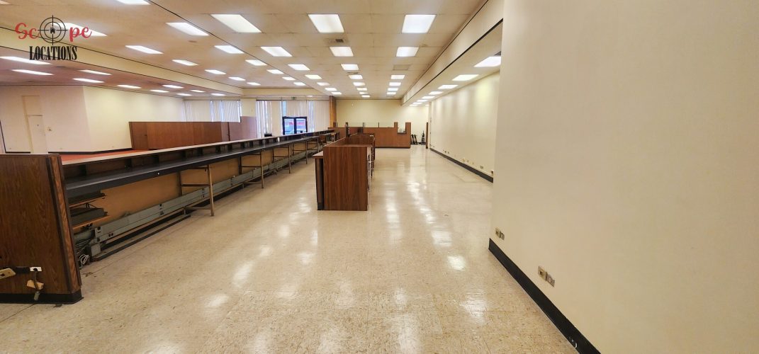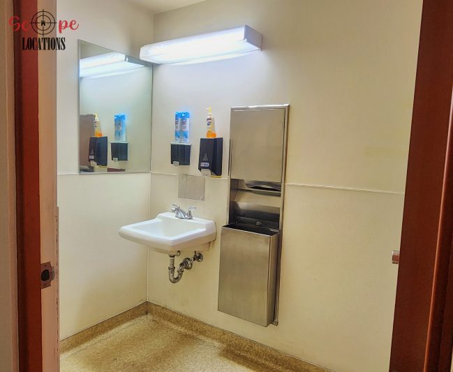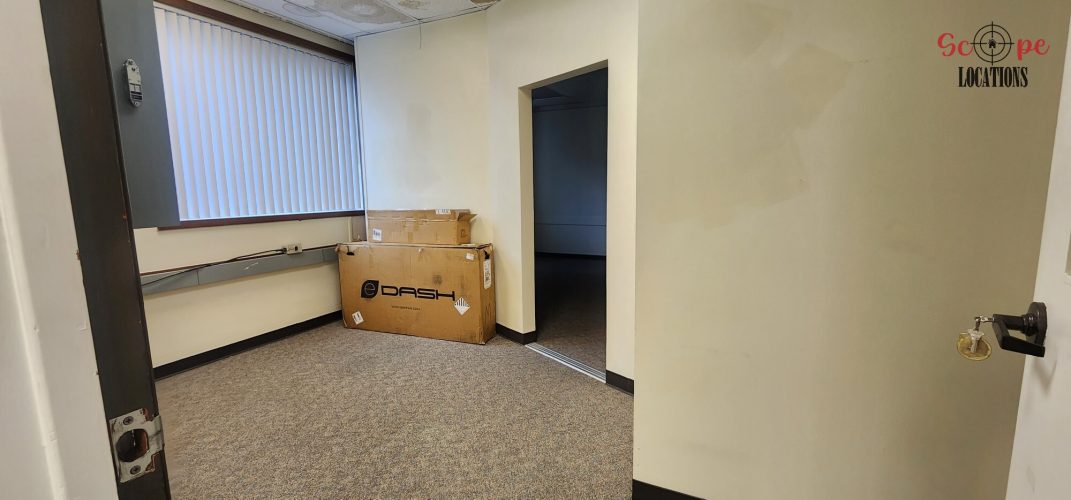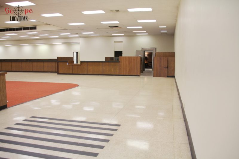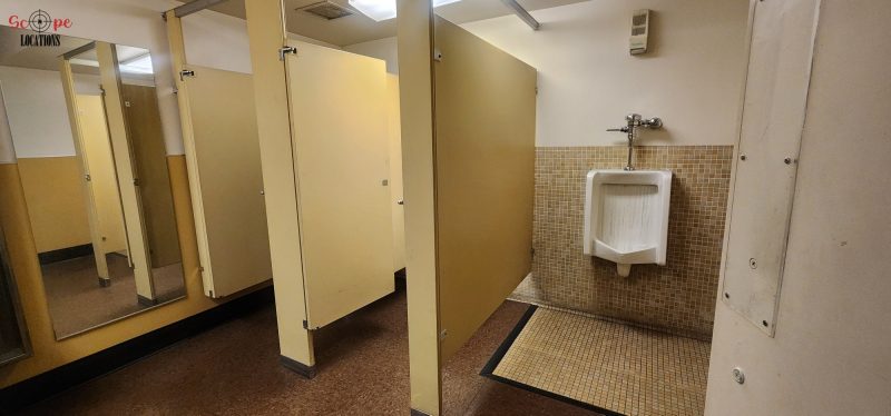 The first floor also comprises two generously-sized offices, bathrooms, and a spacious open area separate from the primary banking section, offering versatile potential for various filming setups. Ascending to the second floor, a large room devoid of windows at one end is complemented by another expansive common room at the opposite end, featuring a large floor-to-ceiling window that overlooks the entryway below. Nestled between these areas down a long windowless narrow hallway with flourescent lighting above are separate men’s and women’s restrooms, reminiscent of 1970s, 1980s style bathrooms with yellow metal partitions separating each stall, vinyl flooring in brown tones.