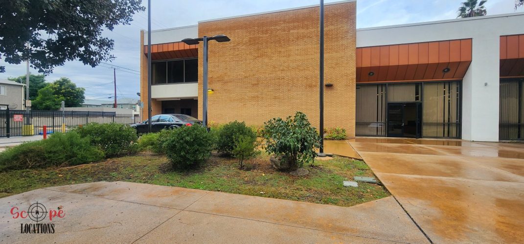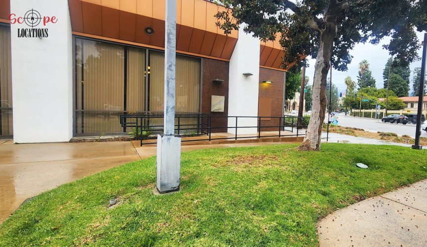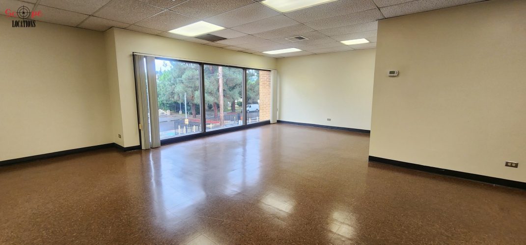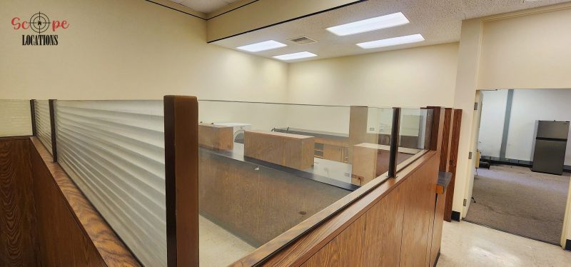 Situated conveniently close to major studios, this expansive 18,000 square foot, two-story vacant building previously operated as a bank, encapsulates the ambiance of a 1980s to 1990s financial institution. As you step inside, the interior features a blend of vinyl flooring and reddish-orange commercial carpeting harmonizing with the white walls that define the space. The main area boasts open banking teller counters constructed from darker compressed wood, reminiscent of the bank’s previous function.