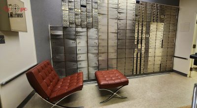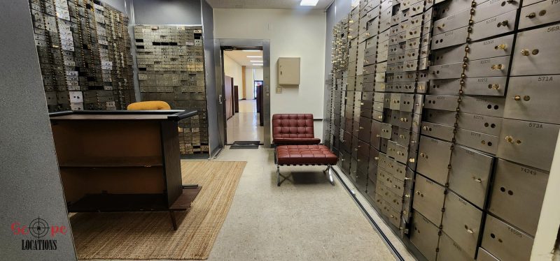 The building includes a substantial vault divided into two distinct rooms – one housing a collection of safety deposit boxes in various sizes, while the other room exhibits a pristine stark white appearance. The remnants of some cubicles with half walls still remain on the property, echoing the past functionality of the space.