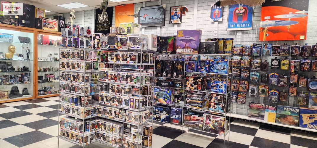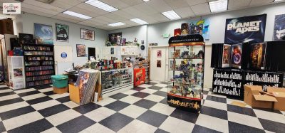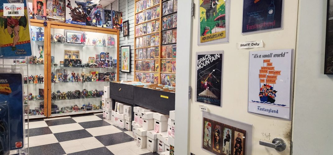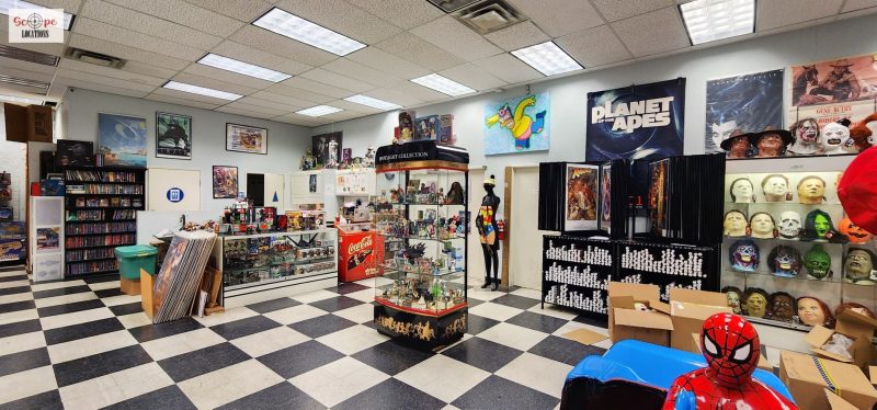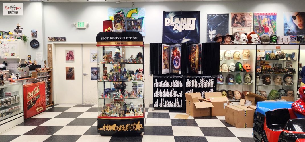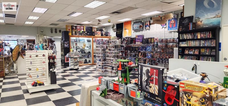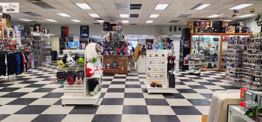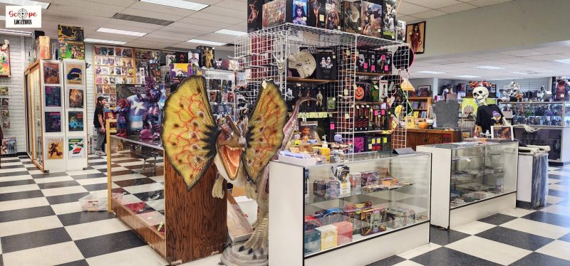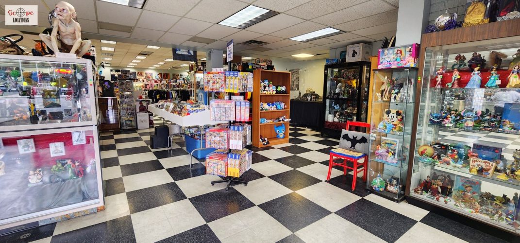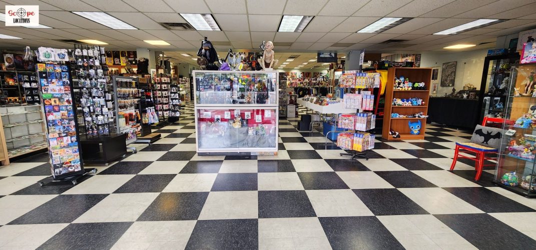 EXCLUSIVE: Welcome to this large movie, comic, and TV collectibles retail store nestled in the heart of Burbank! Step into this charming and vintage space featuring unique displays and an ambiance that transports you to another era. The black and white checkered vinyl flooring adds a touch of nostalgia, complemented by the warm glow of fluorescent lighting from the drop ceiling above.