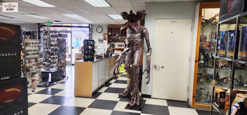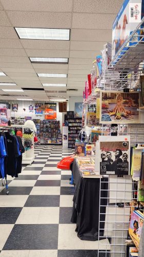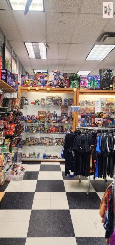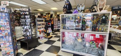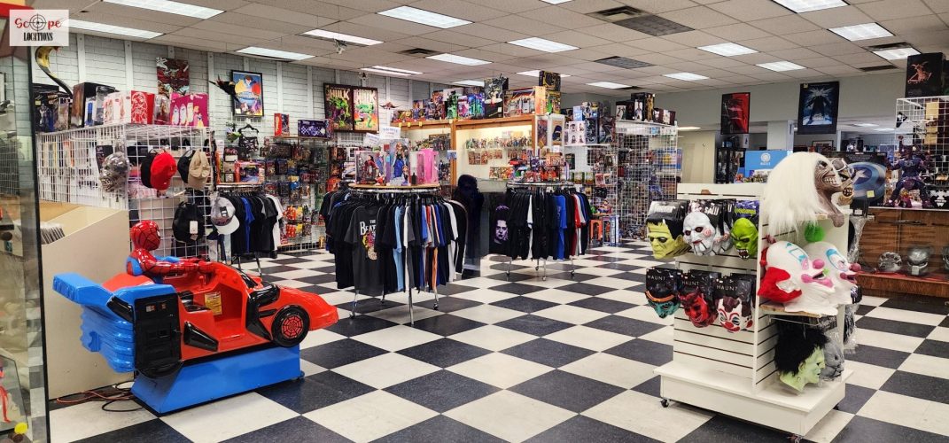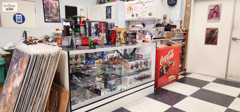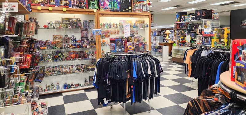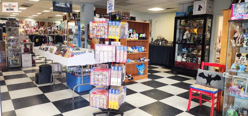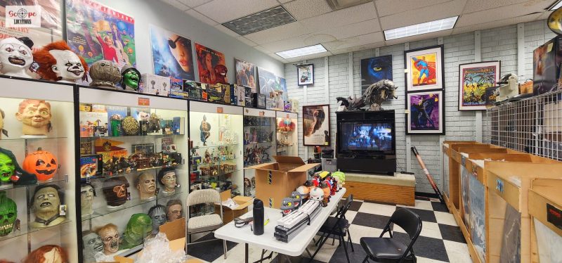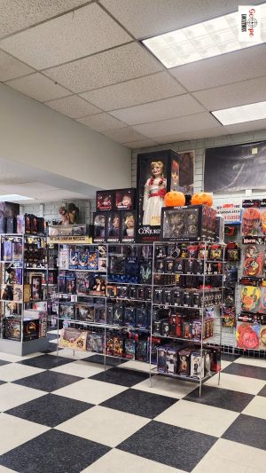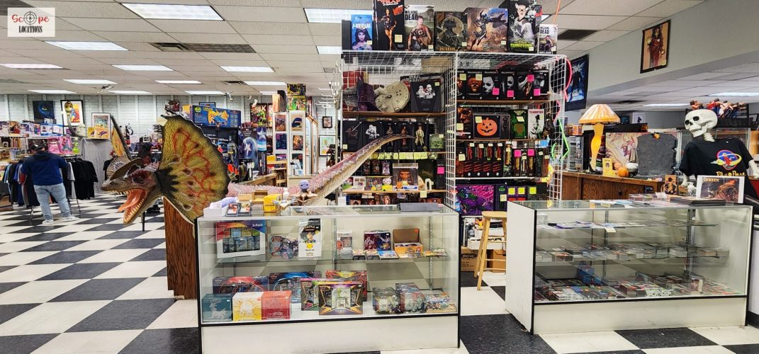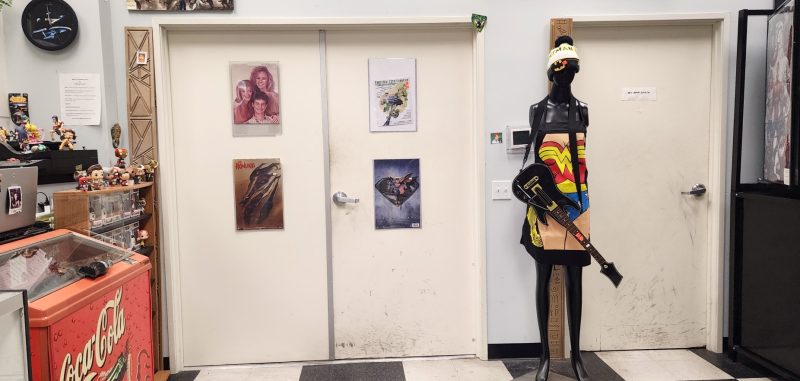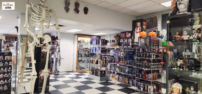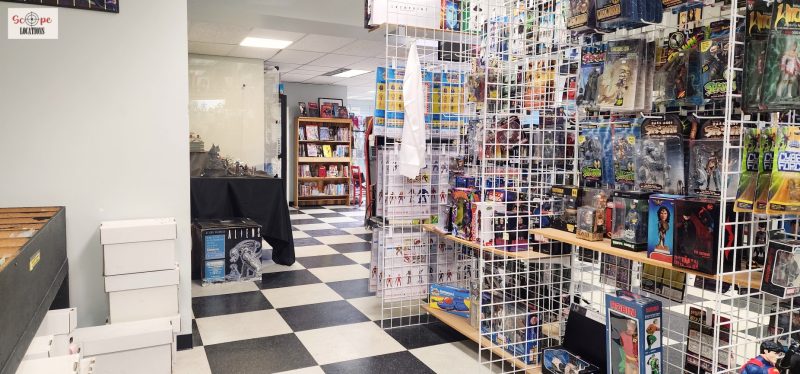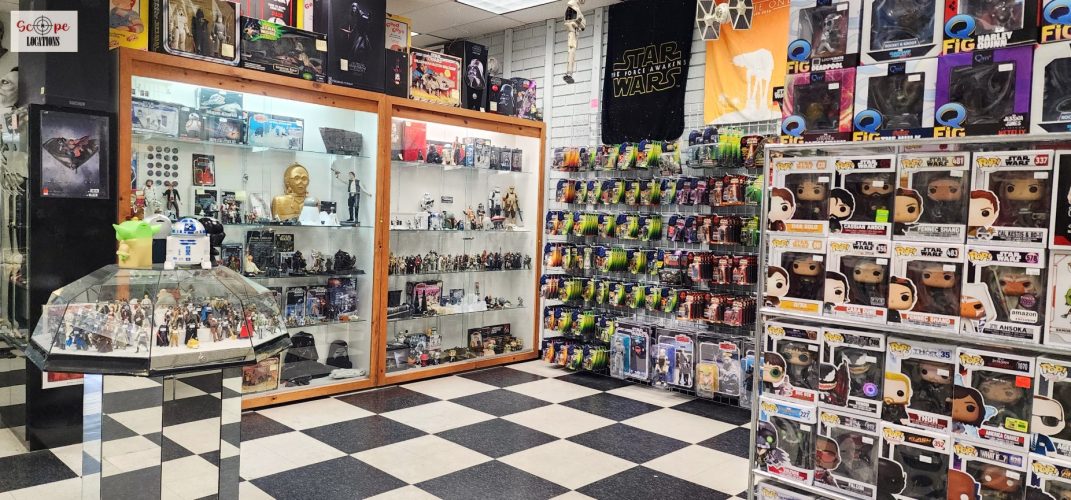 EXCLUSIVE: Welcome to this large movie, comic, and TV collectibles retail store nestled in the heart of Burbank! Step into this charming and vintage space featuring unique displays and an ambiance that transports you to another era. The black and white checkered vinyl flooring adds a touch of nostalgia, complemented by the warm glow of fluorescent lighting from the drop ceiling above.