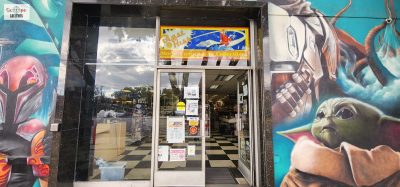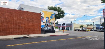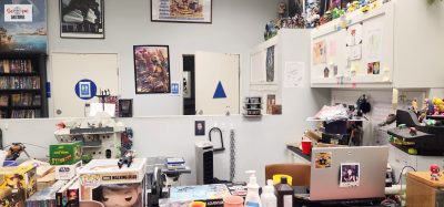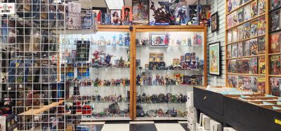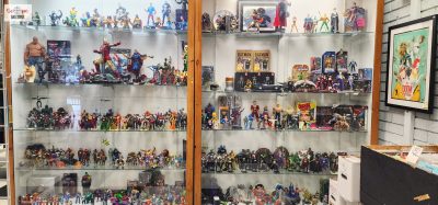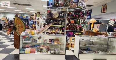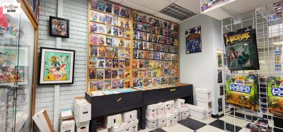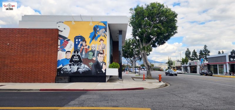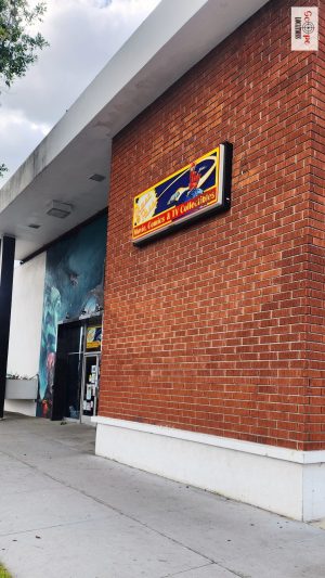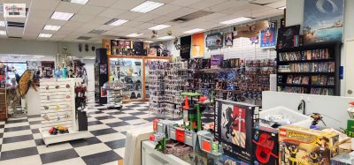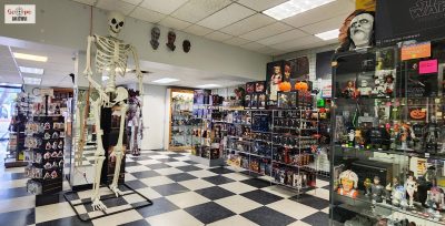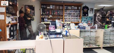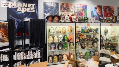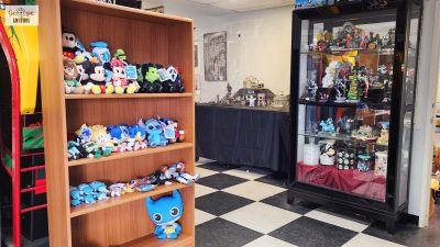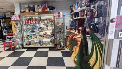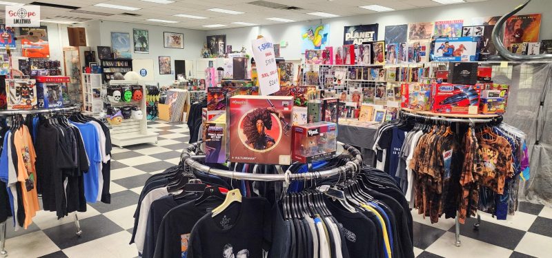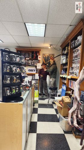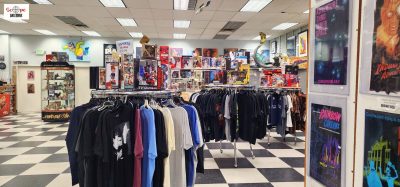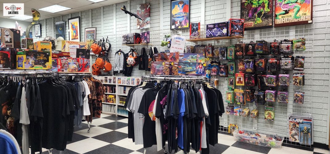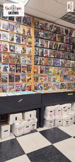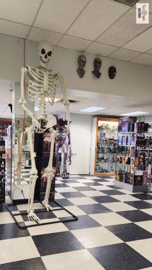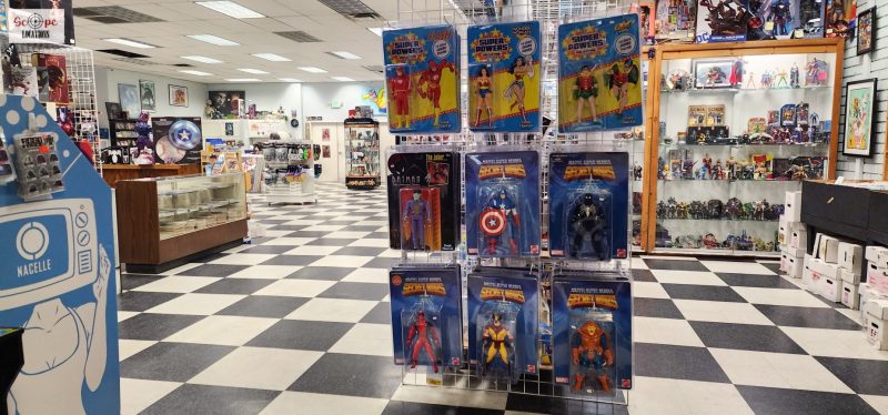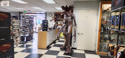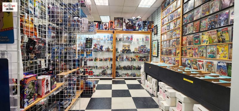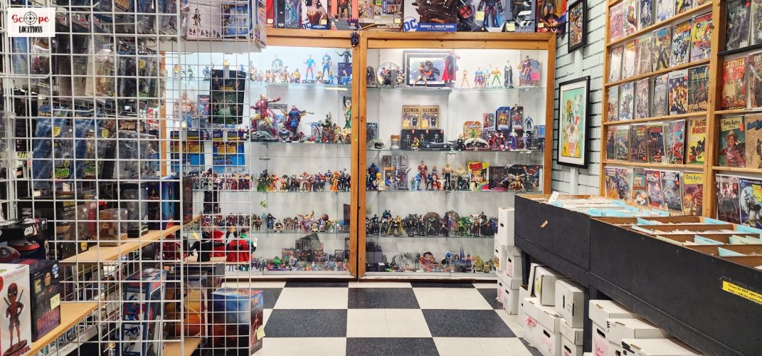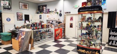 EXCLUSIVE: Welcome to this large movie, comic, and TV collectibles retail store nestled in the heart of Burbank! Step into this charming and vintage space featuring unique displays and an ambiance that transports you to another era. The black and white checkered vinyl flooring adds a touch of nostalgia, complemented by the warm glow of fluorescent lighting from the drop ceiling above.