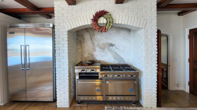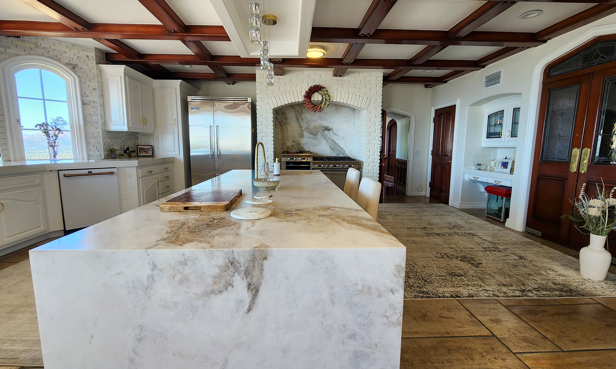 • Massive kitchen with large center island (sink & copper hood), indoor grill, huge walk-in pantry, and expansive countertops & cabinetry.
