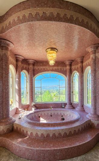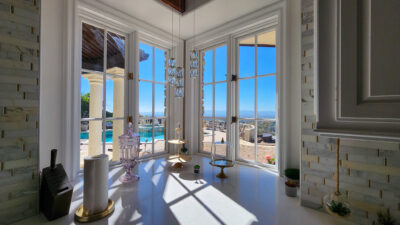 • Main floor secondary suite with fireplace, French doors to pool & views, en-suite with jacuzzi tub, separate shower, and custom mosaic tile (award-winning).