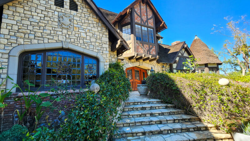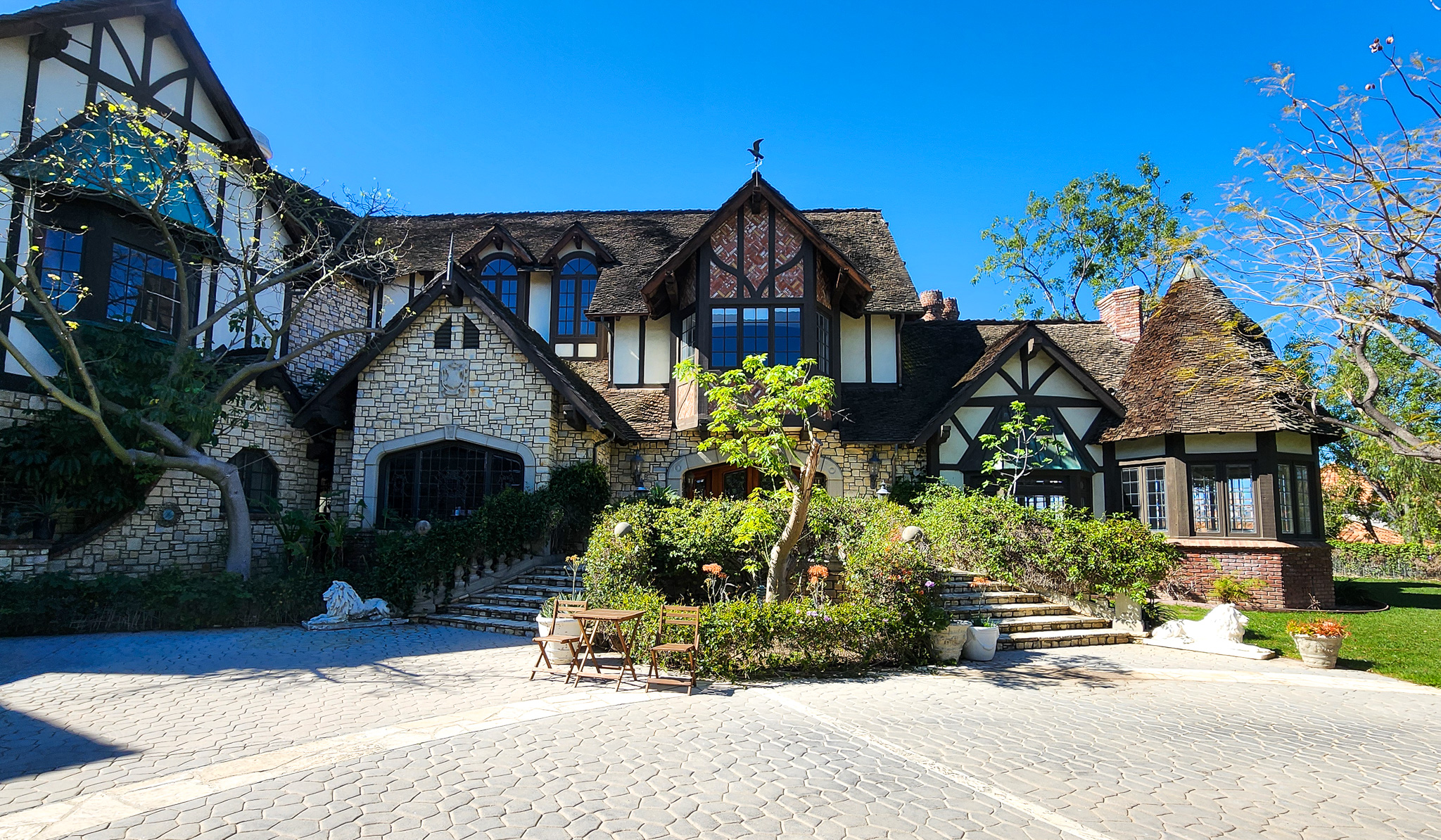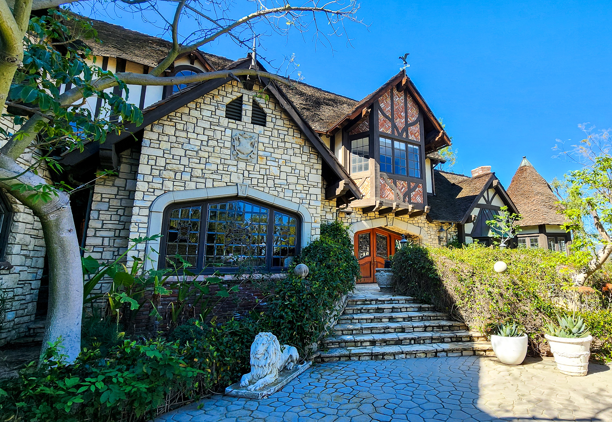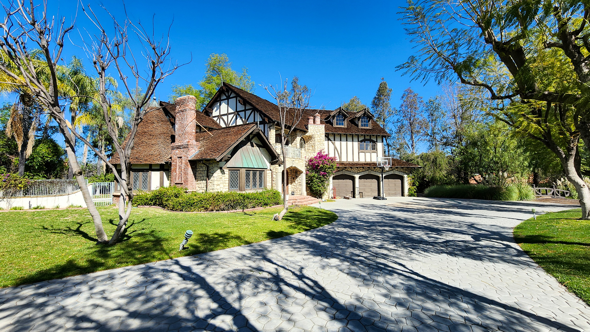 Overview: This spectacular, custom-built English Tudor-style manor, boasting 180° city light and mountain views, offers a sprawling and luxurious filming location within a prestigious, 24-hour guard-gated community. Situated on a private gated road and spanning 2 acres, the estate features a substantial main house, a separate guesthouse, and extensive grounds with unique architectural details and breathtaking vistas.