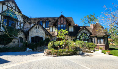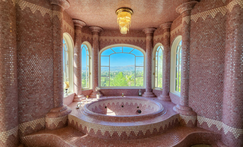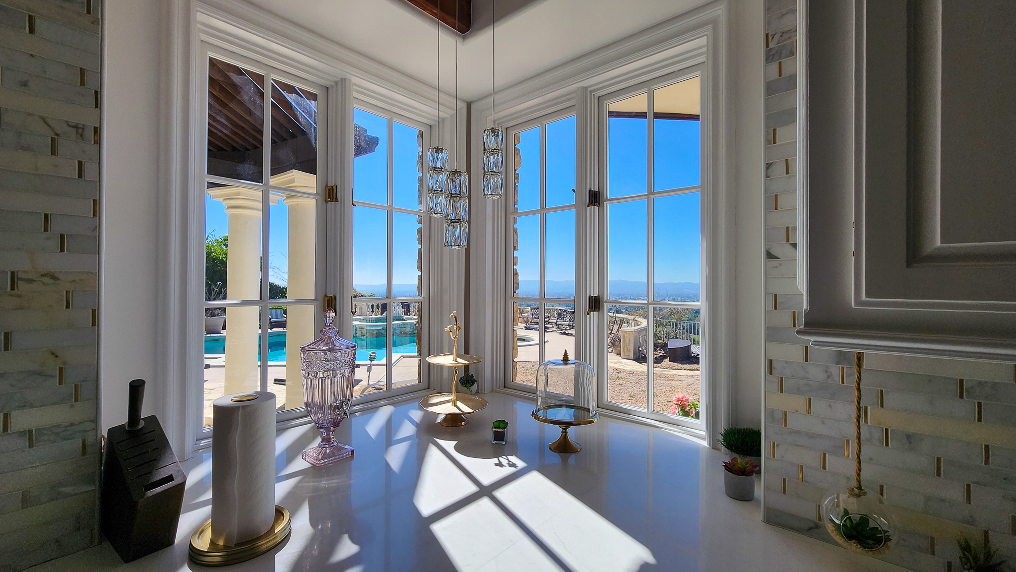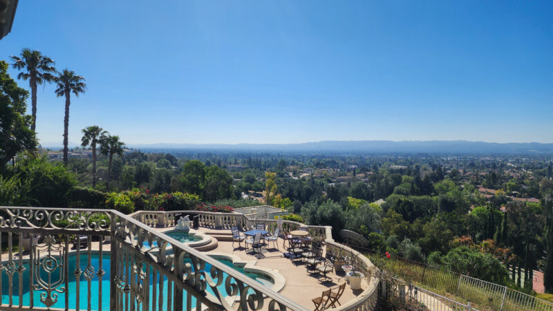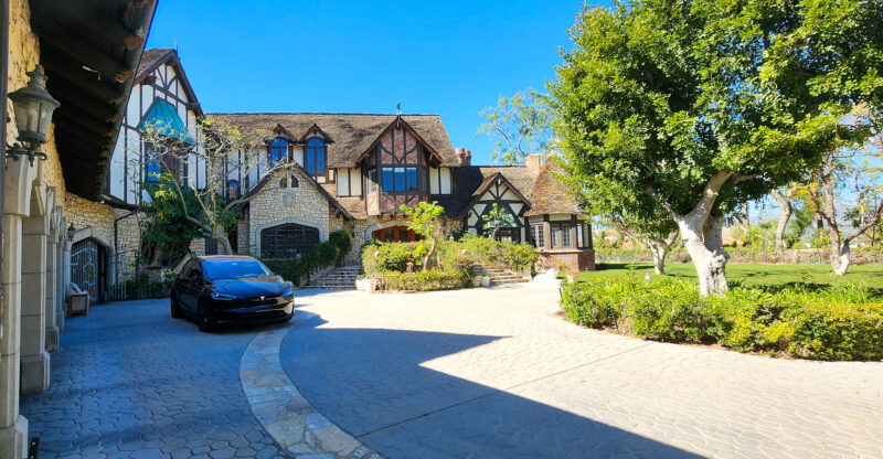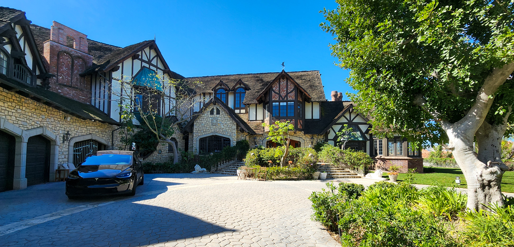 Overview: This spectacular, custom-built English Tudor-style manor, boasting 180° city light and mountain views, offers a sprawling and luxurious filming location within a prestigious, 24-hour guard-gated community. Situated on a private gated road and spanning 2 acres, the estate features a substantial main house, a separate guesthouse, and extensive grounds with unique architectural details and breathtaking vistas.