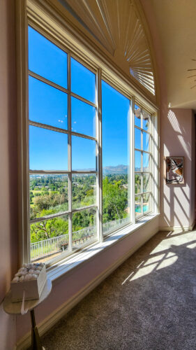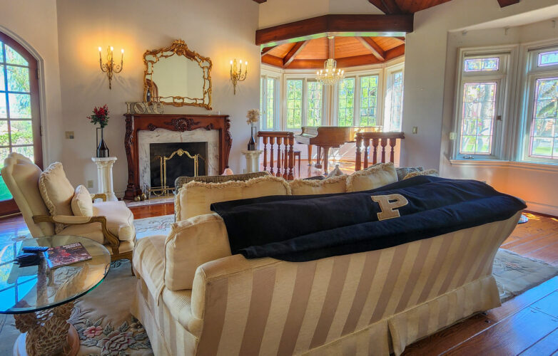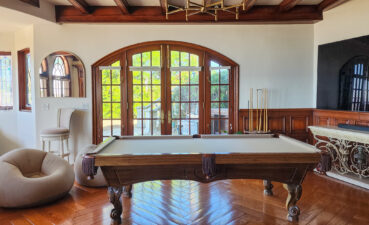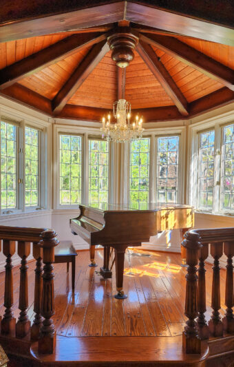 • Unique character with handcrafted oak wood floors, custom ceilings in every room, leaded & stained-glass windows, and rounded French doors.