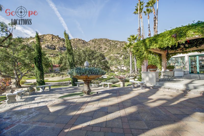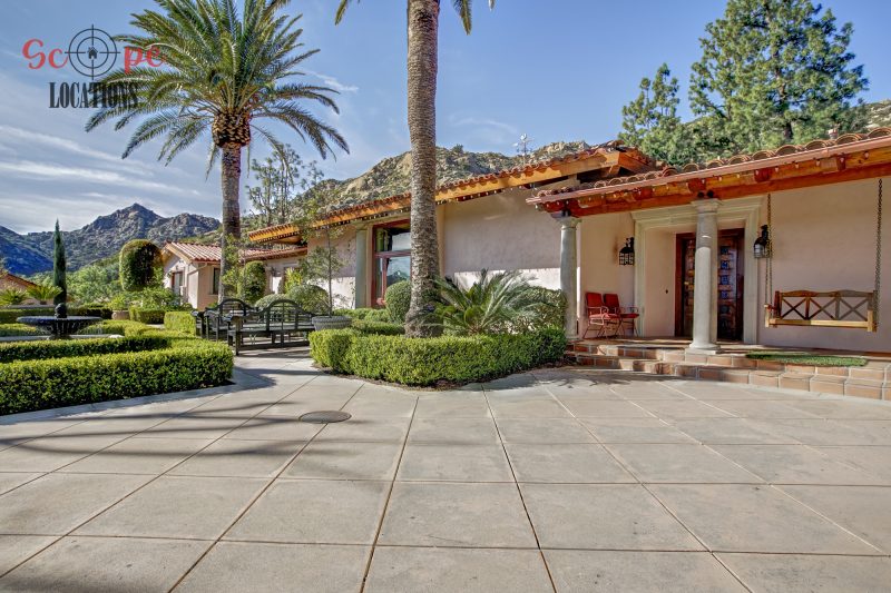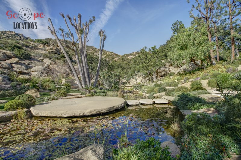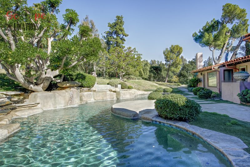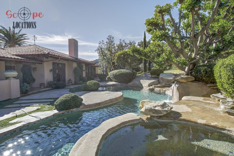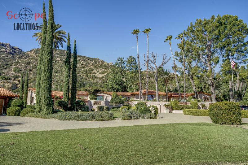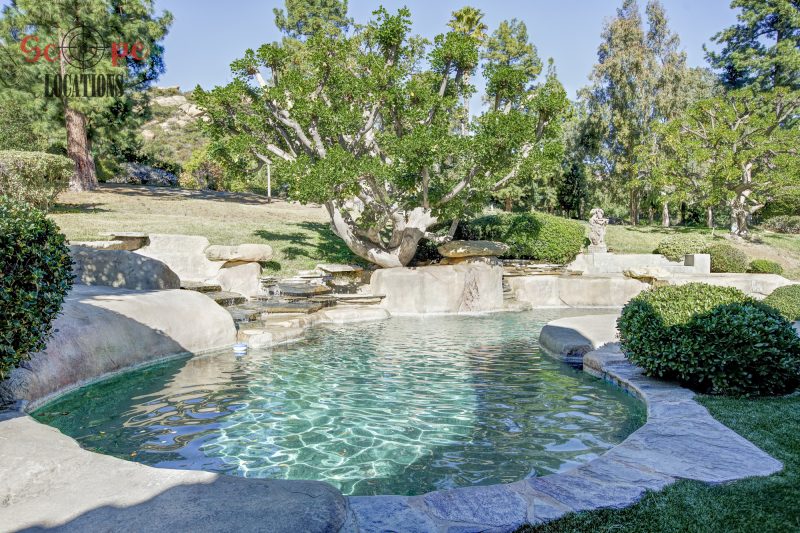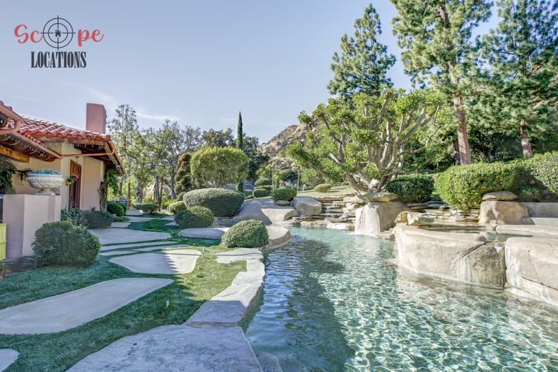 Surrounded by diverse terrains—rocky mountains, forests, and open green spaces—the estate presents an alluring backdrop for filming, offering an array of settings for varied scenes. A garage caters to ten vehicles, supplemented by additional parking space accommodating 40 to 50 more cars between the driveway and small dirt lot. Its outdoor features include a captivating pool, spa, and gracefully cascading waterfalls that harmoniously blend into the estate’s surroundings.