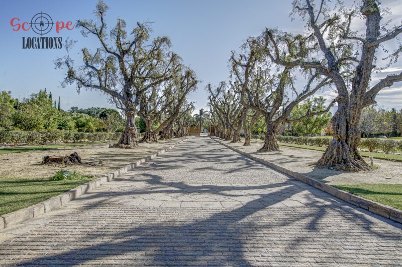 This unique filming location encompasses potential for a Helipad and features three long gated driveways, including one lined with mature oak trees and a bomb shelter spanning the length of the main house. Additionally, it offers a lighted tennis court, stage, tiered viewing pavilion, and diverse amenities catering to versatile filming requirements.