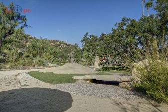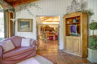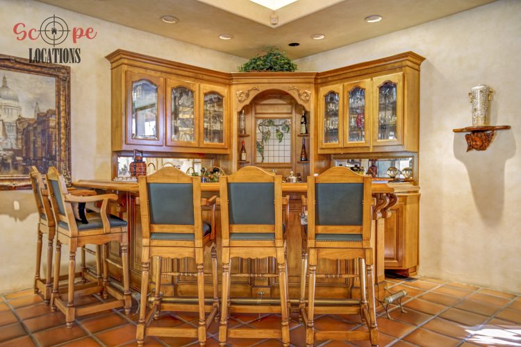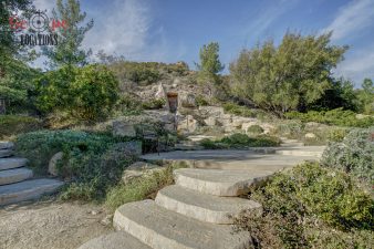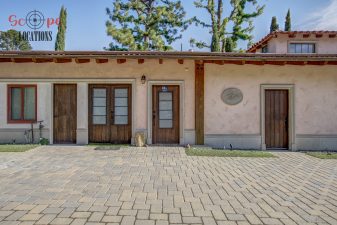The estate also boasts an outdoor walled complex brimming with mature blue agave light plants, palm trees, and lush greenery, offering additional visual appeal. History blends seamlessly with modernity within the 1800s wine cave, boasting an illuminated onyx bar amidst an enchanting entertaining area with water features and serene ponds adorned with lotus and water lilies.