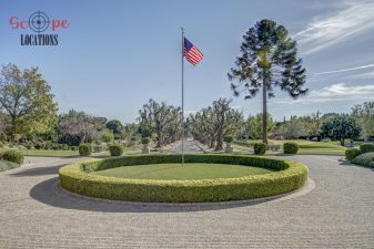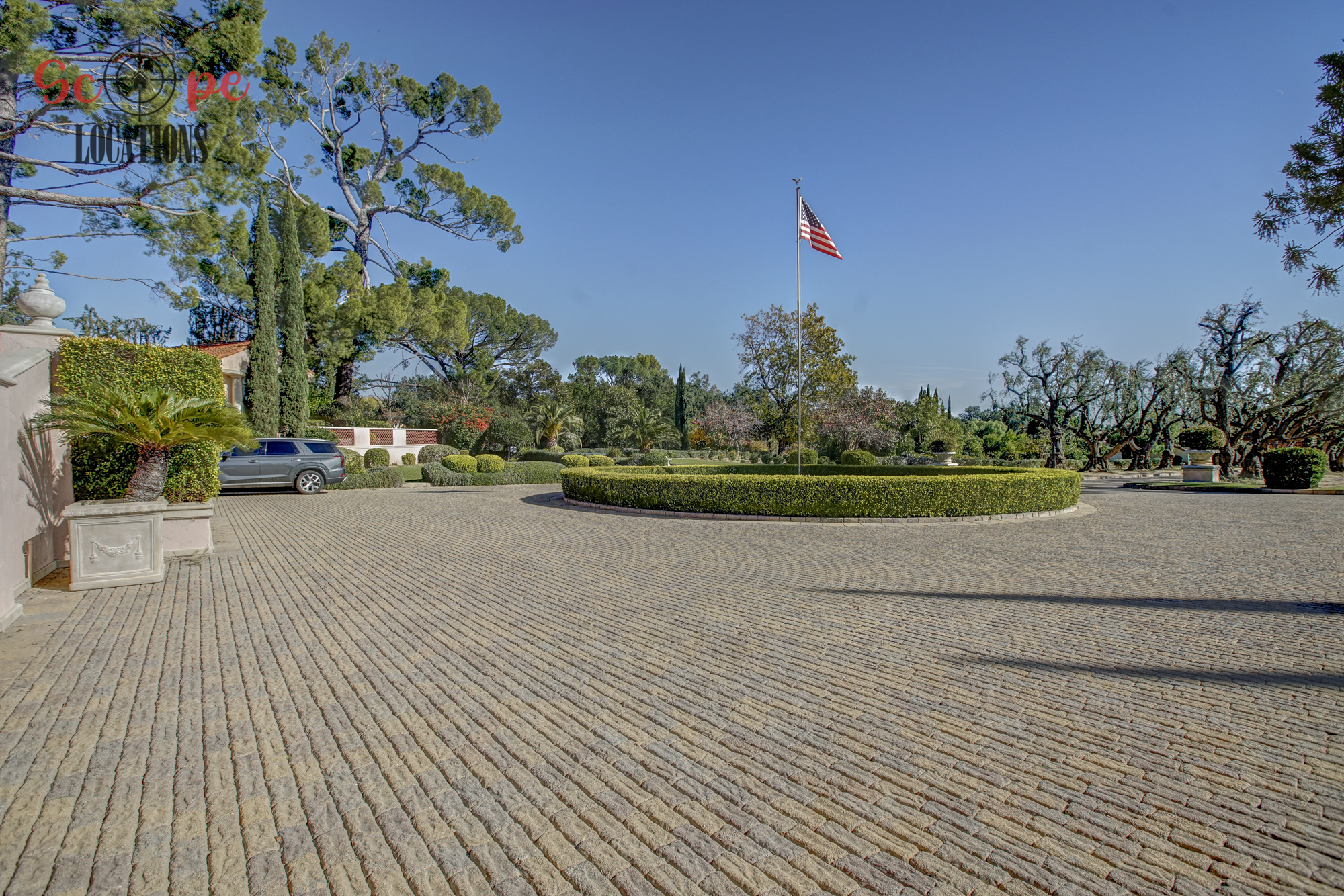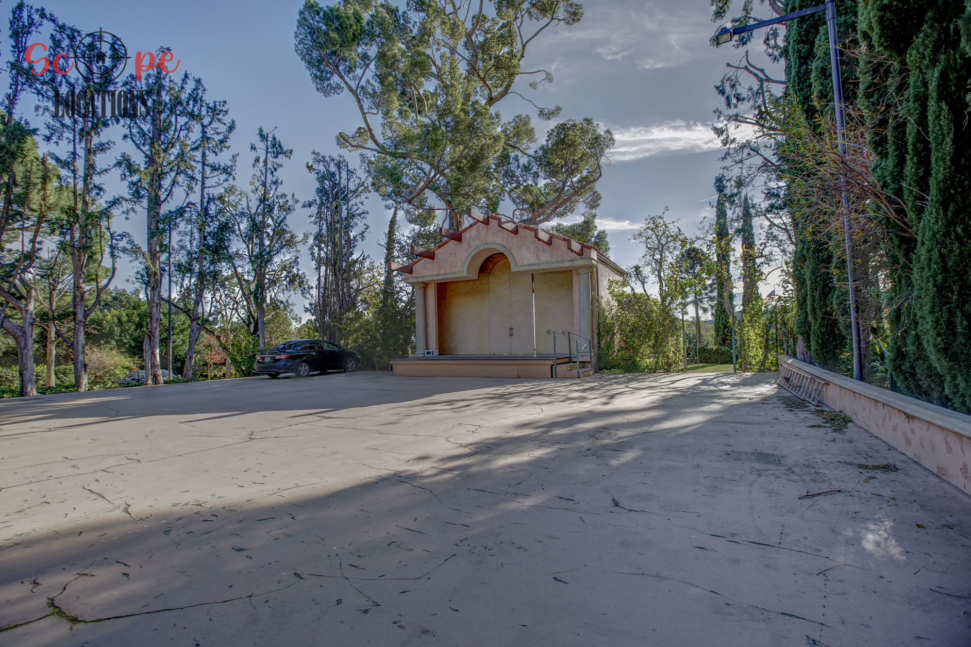 This unique filming location encompasses potential for a Helipad and features three long gated driveways, including one lined with mature oak trees and a bomb shelter spanning the length of the main house. Additionally, it offers a lighted tennis court, stage, tiered viewing pavilion, and diverse amenities catering to versatile filming requirements.
