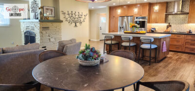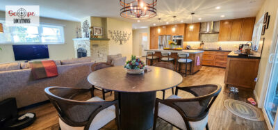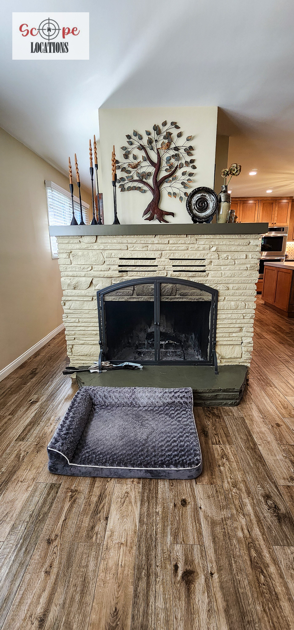 - Breakfast nook and living room with a floor-to-ceiling mantled stone fireplace with raised hearth