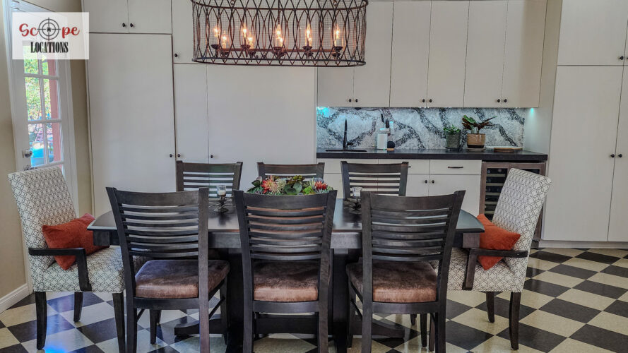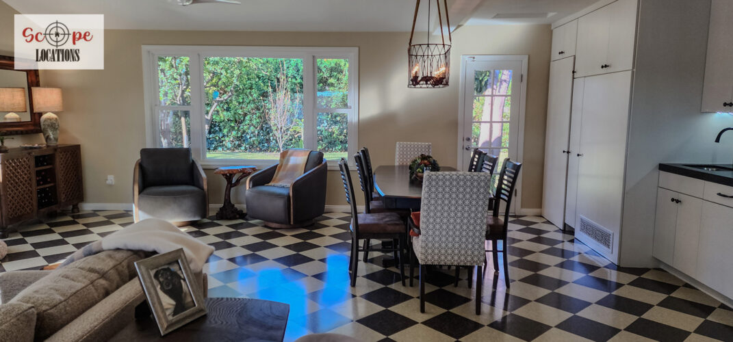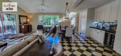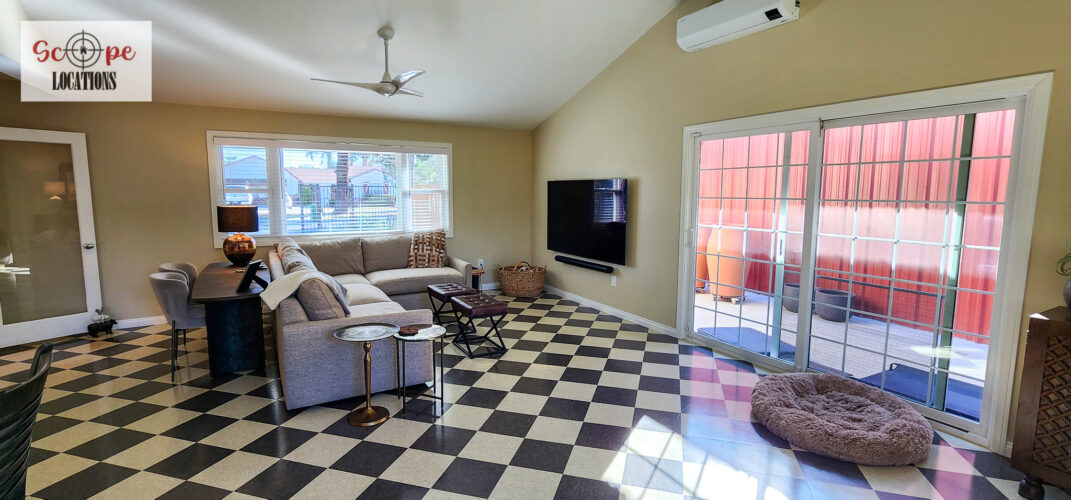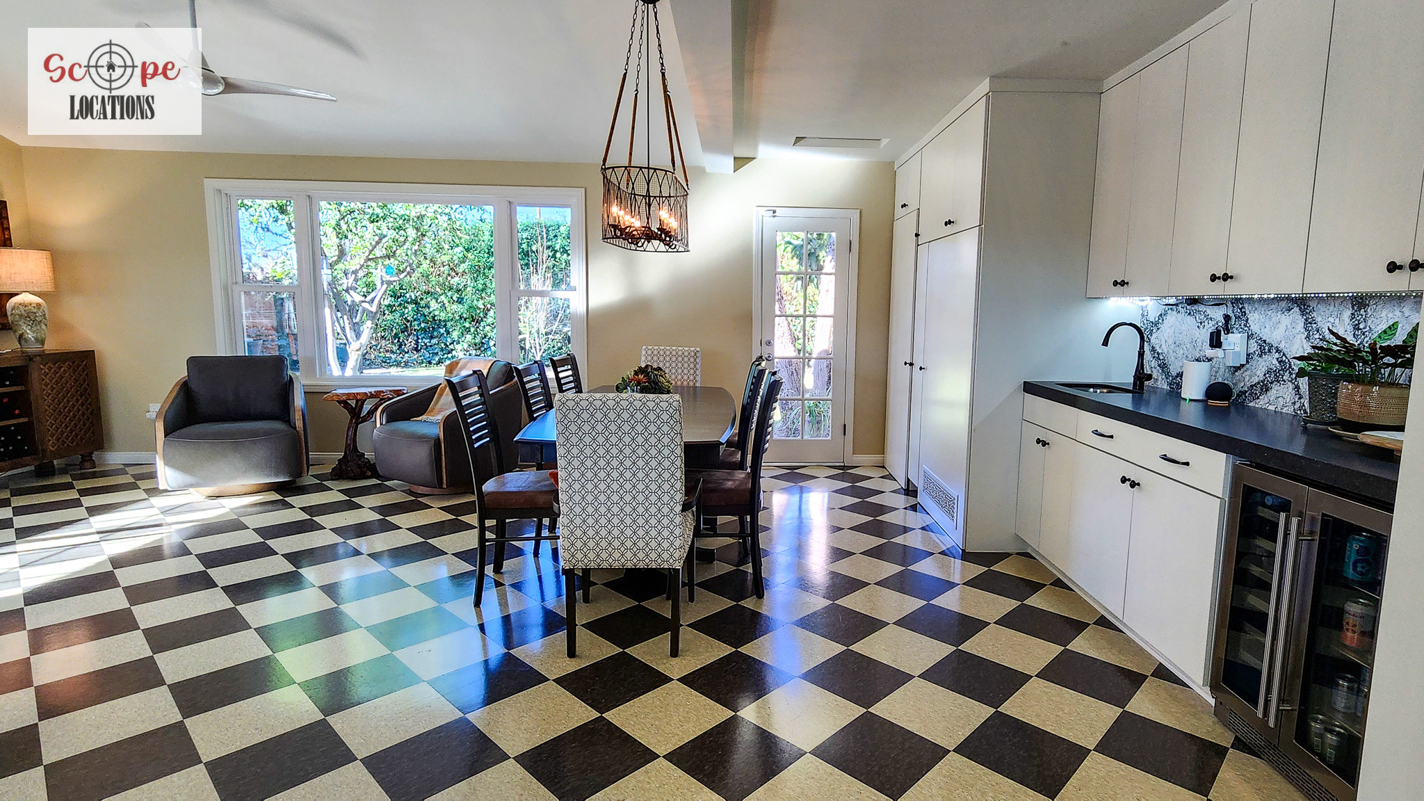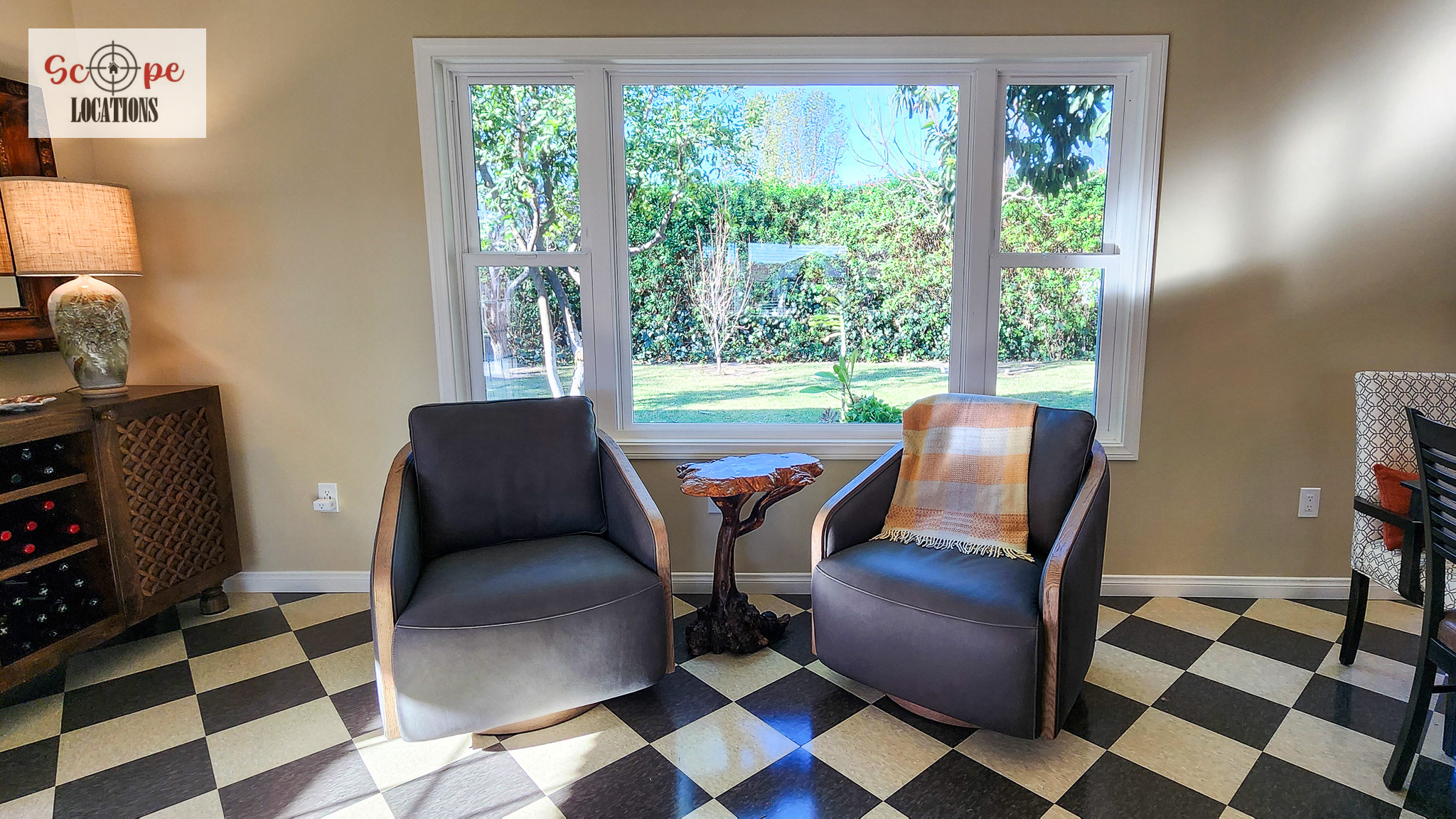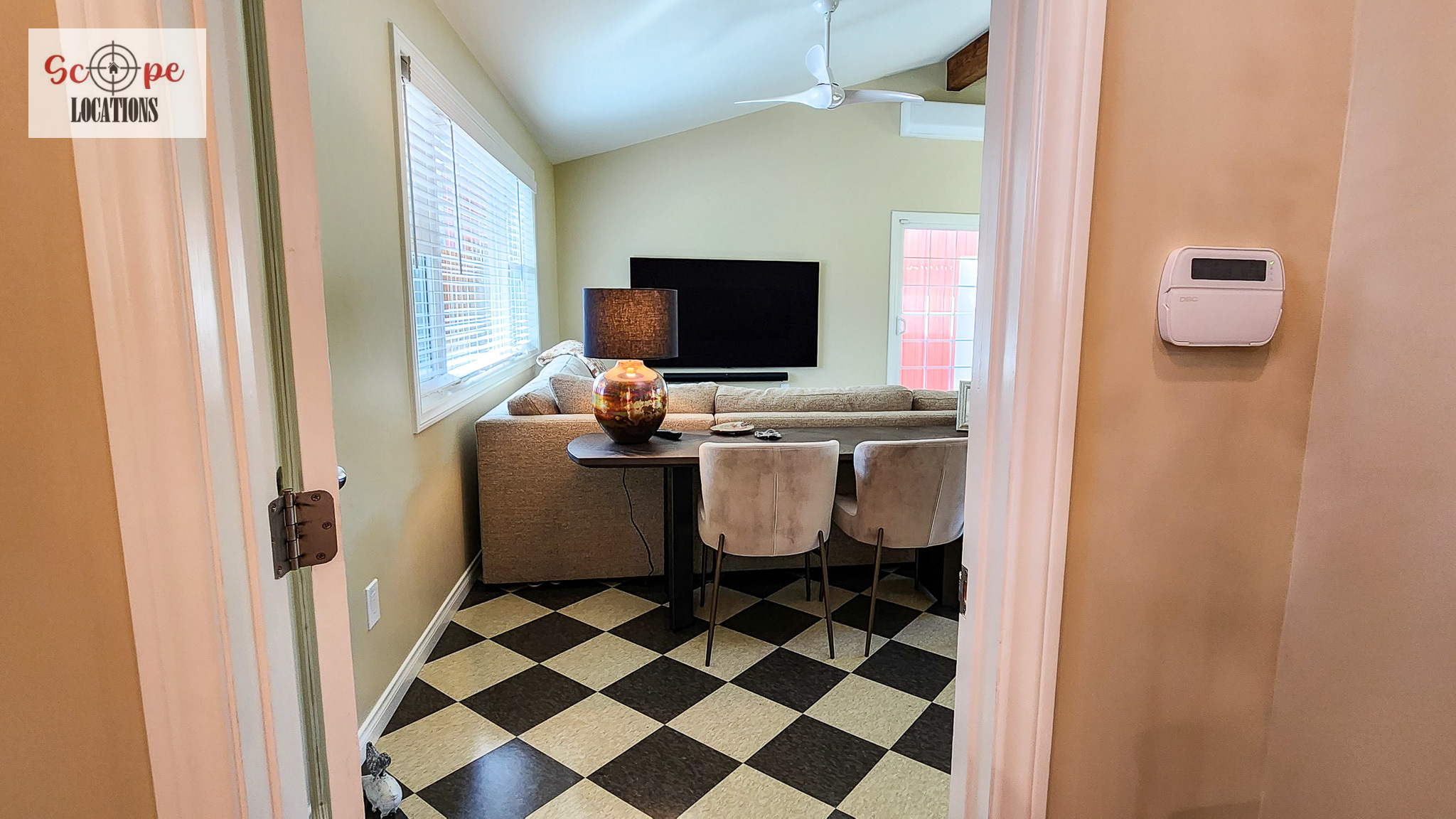 - Family room with black and white checkered flooring, floor-to-ceiling windows, and sliding glass door leading to the backyard
