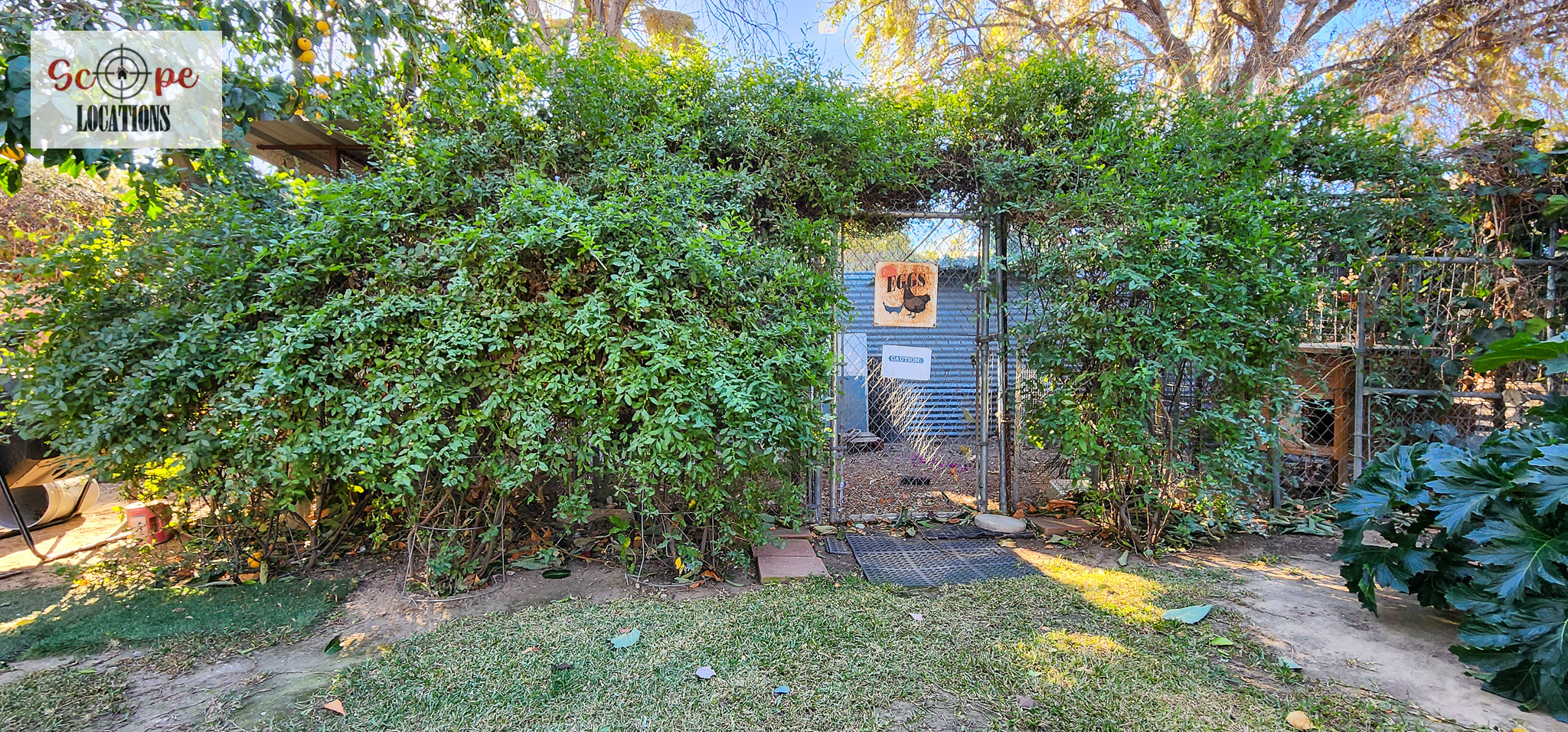 - Expansive grassy area with mature fruit trees and a chicken coop