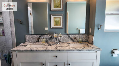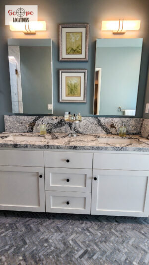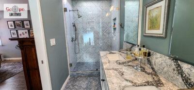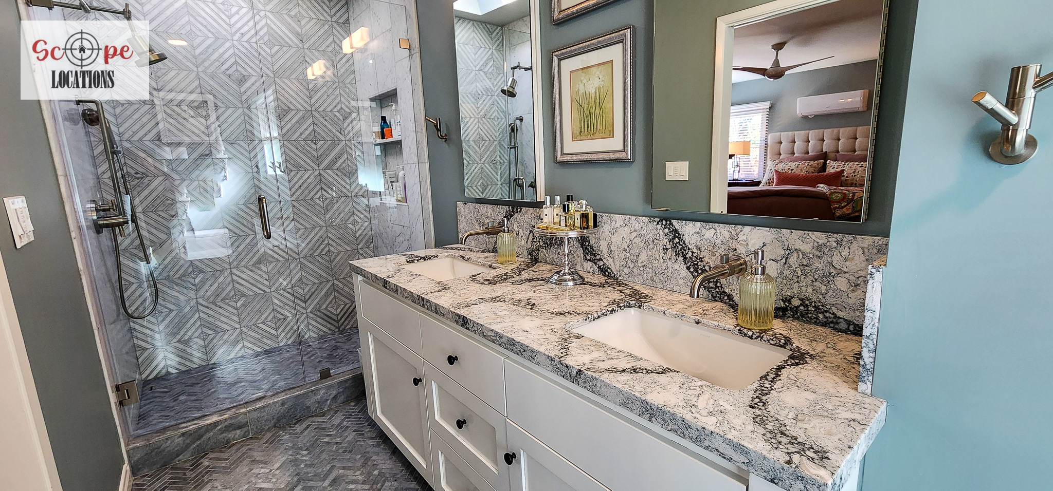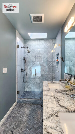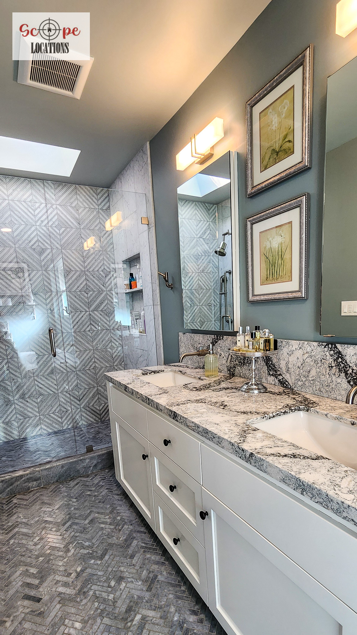 Tile FloorsWall Sconces Double SinkGlass Shower EnclosureShower OnlyTiled Walls