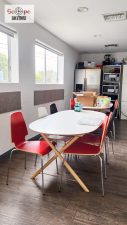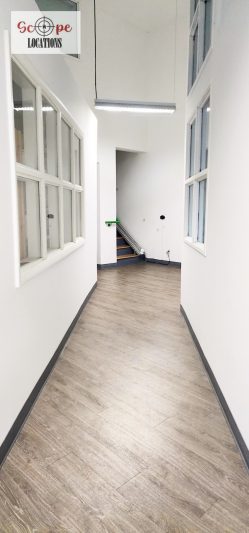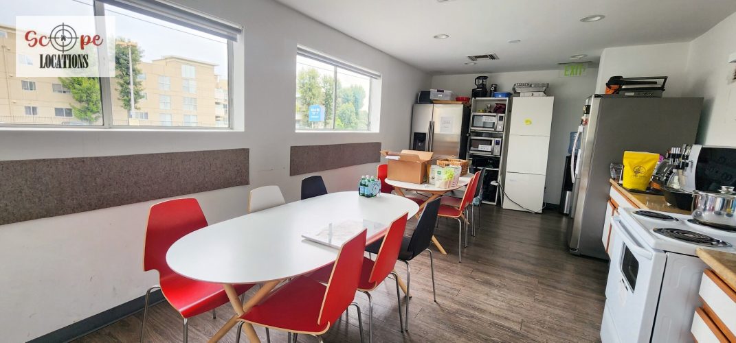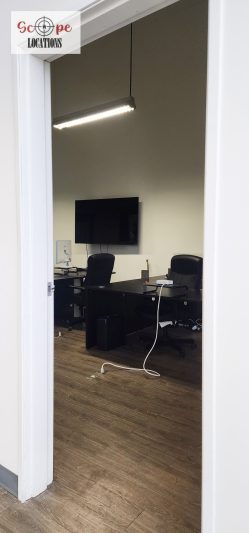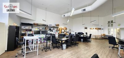 Upon entry, you’ll be greeted by the main area’s vibrant atmosphere, featuring white walls and exposed AC vents that contribute to its modern aesthetic, perfect for various filming scenarios. Additionally, the space includes two glassed conference rooms strategically placed for optimal visibility within the main area.