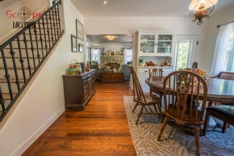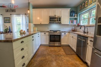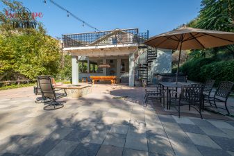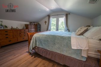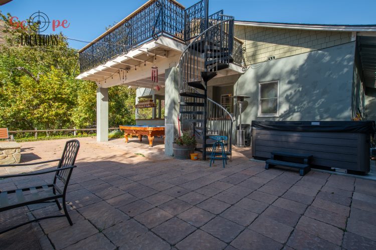Inside, the U-shaped gourmet kitchen seamlessly connects to the dining and living areas, featuring an inviting breakfast bar and two single hung windows overlooking the outdoor covered patio, play area, and a BBQ structure. The living room features a beautiful and rustic rock fireplace with white mantel. The lower living area comprises three comfortable bedrooms and a large remodeled bathroom with dual sinks, and glass block shower partial wall. The loft above serves as a master suite with a spacious seating area, pot belly stove, remodeled bathroom with large enclosed glass shower/tub combo, black cabinets and white counters with decorative black and white tiled flooring, and large viewing deck. A balcony leading out of the master bedroom overlooks the wooded/nestled backyard below. A pool table sits under the side frame as you exit the side porch and is directly under the balcony above. One could travel between the balcony and patio via the wrought iron curved staircase.