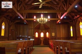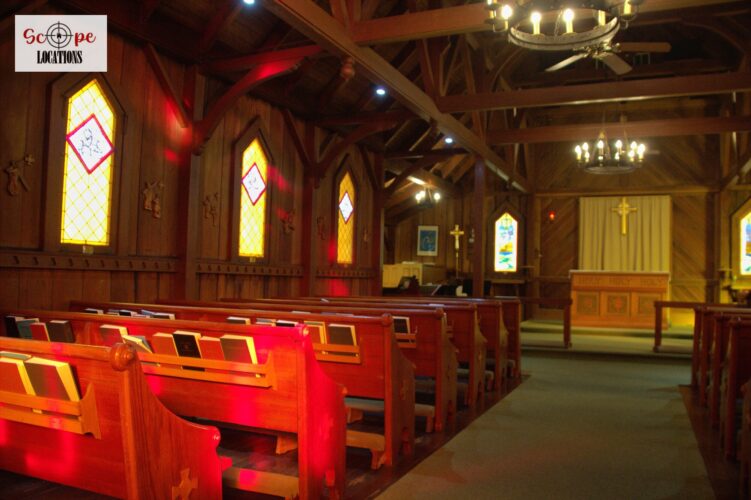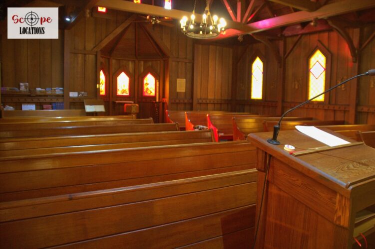 EXCLUSIVE: English-style church with rich brown wooden paneling accented by elegant white trim, stunning stained glass windows, and a charming wishing well. Inside you’ll find 7 rows of wooden pews which seat approximately 60 people as well as the rector’s private changing room and a spacious meeting room, featuring classic oak-colored wood paneling on walls and a drop ceiling illuminated by fluorescent lighting. A functional kitchen equipped with white wood cabinets and a convenient pass-through window complements the large meeting space. Additionally, the church offers two separate rooms with serene white walls dedicated to child-centered church services and childcare.
