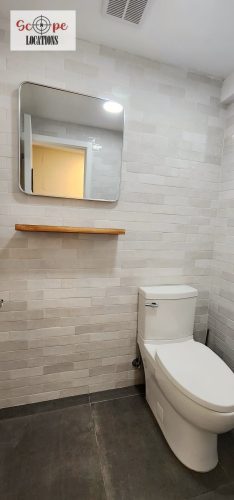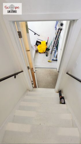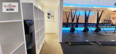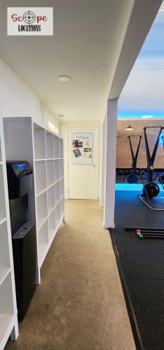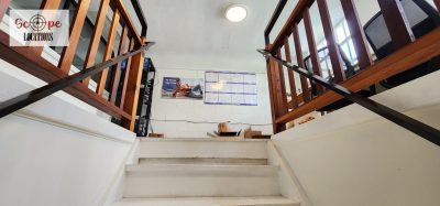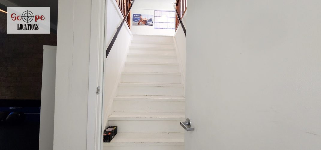 Upon entering the main level, guests are greeted by a small check-in area that leads to an inviting open workout area featuring a diverse array of fitness equipment. Two conveniently located bathrooms and a rear entrance leading to a private parking area for two vehicles and an alleyway complete the ground floor layout. Ascending a white wooden staircase, you’ll find an office and small storage space offering panoramic views of the gym below through a series of large windows.
