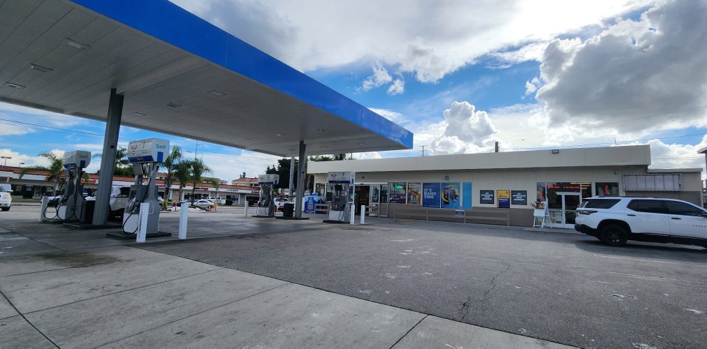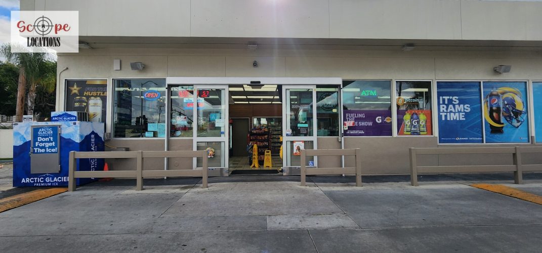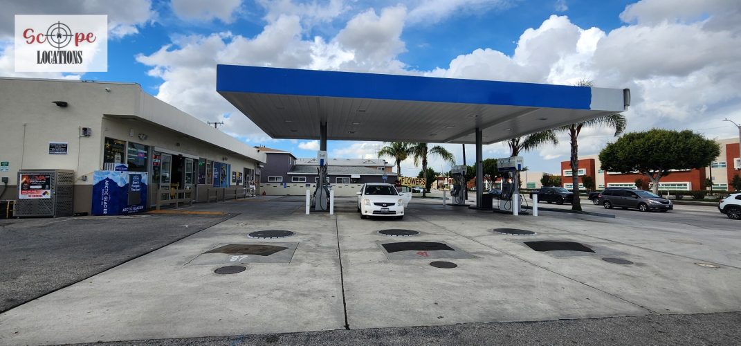 EXCLUSIVE: Situated on a corner lot, this gas station and convenience store present an ideal filming location. The exterior features four gas pumps neatly arranged under a blue and white cover structure, creating a classic visual appeal.