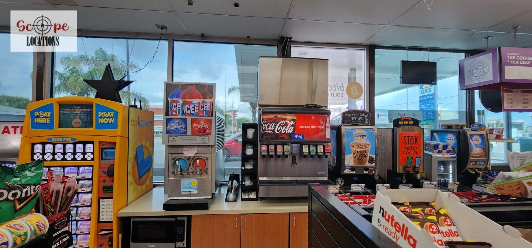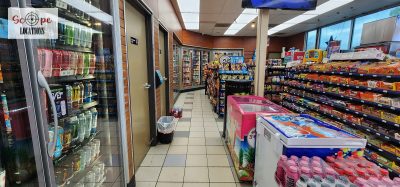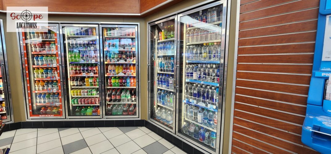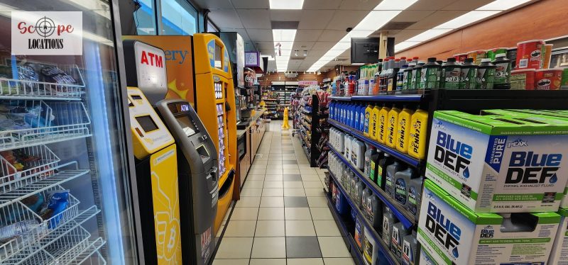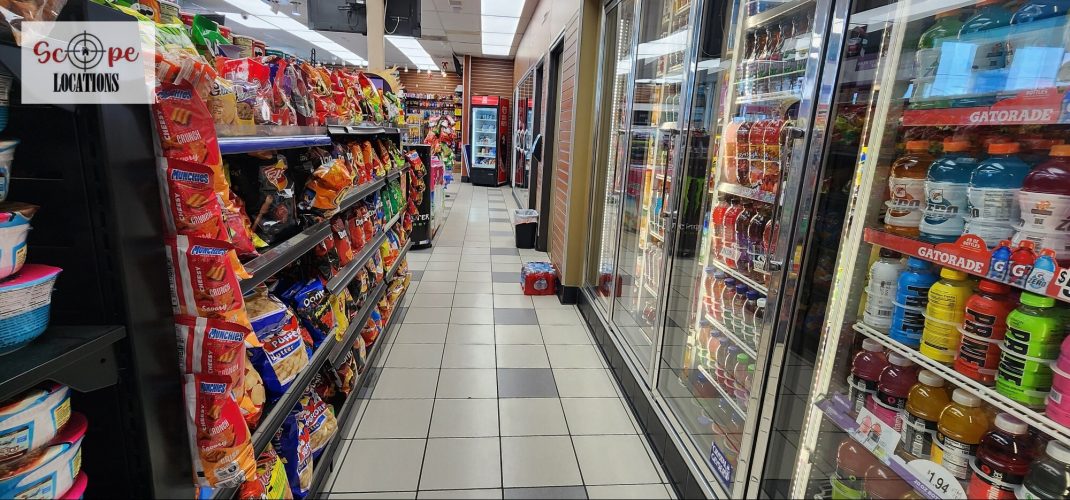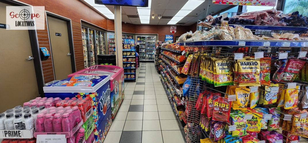 Upon entering through double electric doors, you’ll find a well-lit interior with tile floors and a drop ceiling illuminated by fluorescent lights. The convenience store is equipped with essential amenities, including an ATM machine, a lottery ticket dispenser, a slurpee machine, a coffee machine, and a soda machine. A prominent display showcases a variety of beverages in glass door refrigerators, while two well-stocked aisles offer an array of snacks and merchandise.