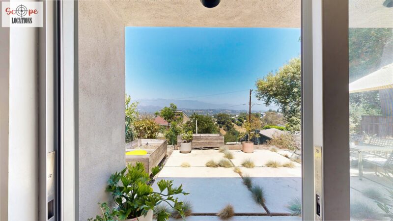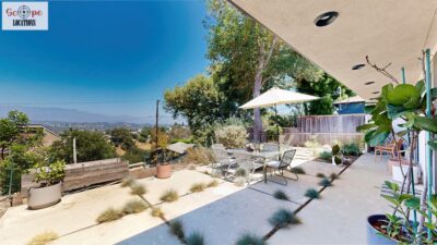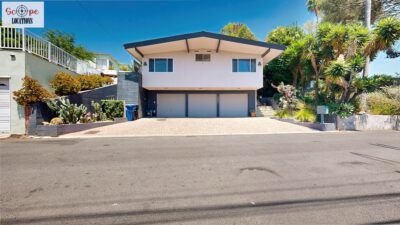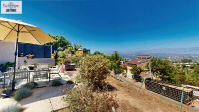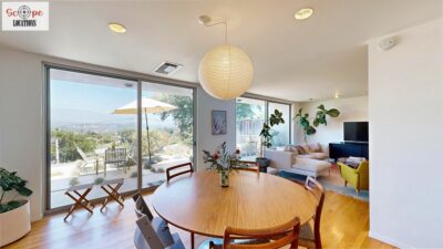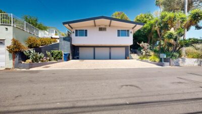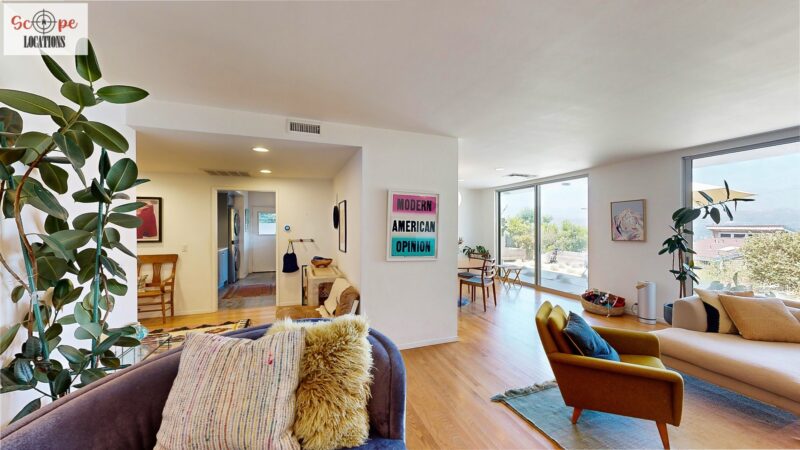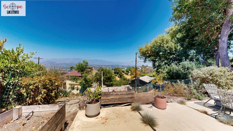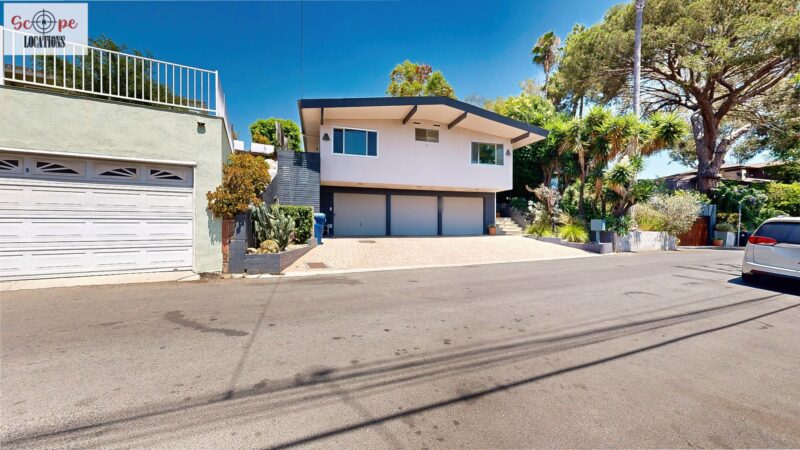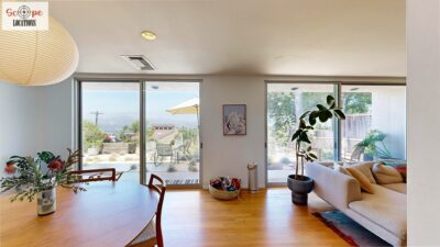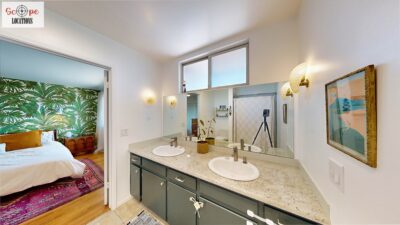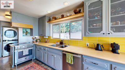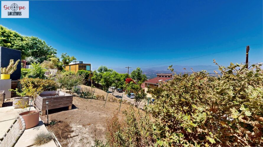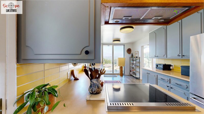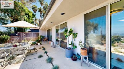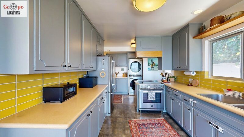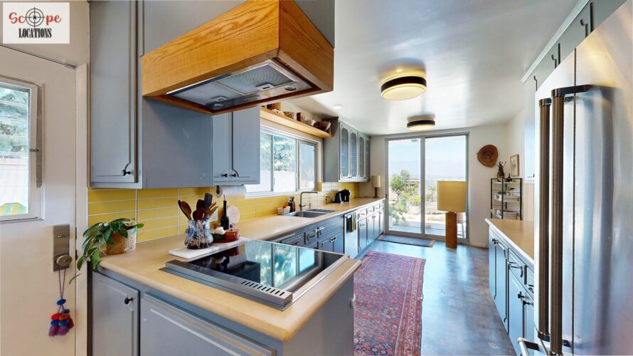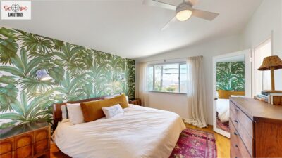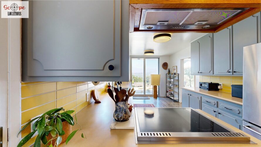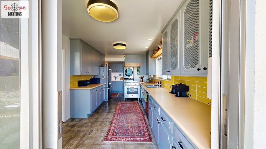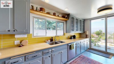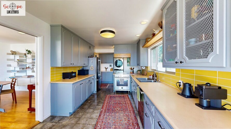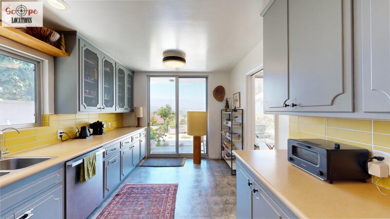 This mid-century modern home, built in 1964, offers expansive views of the San Gabriel Mountains from its location high in the hills of Glassell Park. The spacious, single-level floor plan spans 2,252 square feet and includes 4 generous-sized bedrooms and 2 bathrooms. The main living area features a stunning stone fireplace and oak-colored hardwood floors, with large sliding glass doors leading to a backyard. The kitchen showcases blue and gray cabinets, a bright yellow subway tile backsplash, and light yellow countertops, reflecting a classic mid-century aesthetic. The hallway bathroom has a green vanity cabinet, gray tiled countertops, and a mint-colored step-down tiled shower/tub combination. The master bedroom is highlighted by a tropical wallpaper accent wall. Additional features include a teal entry door, a three-car garage below the main level and an elevator lift.