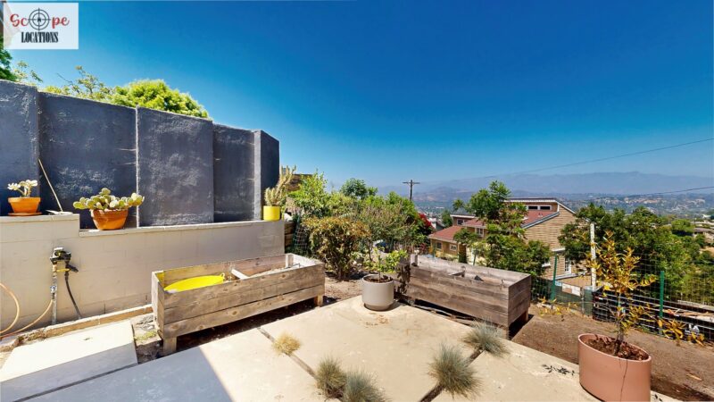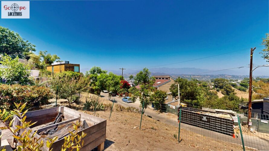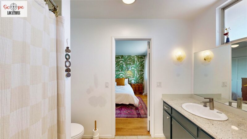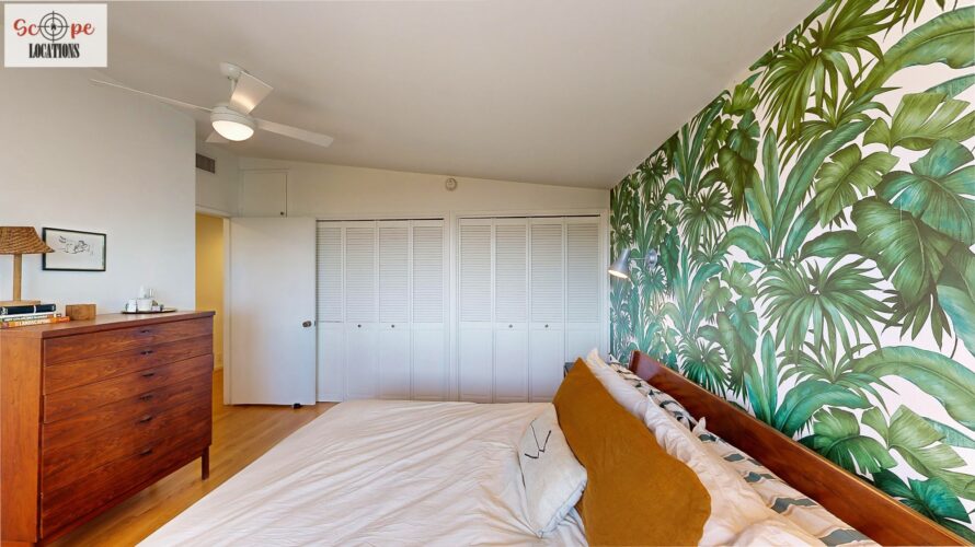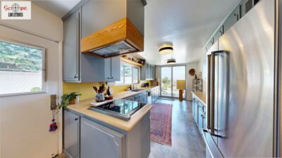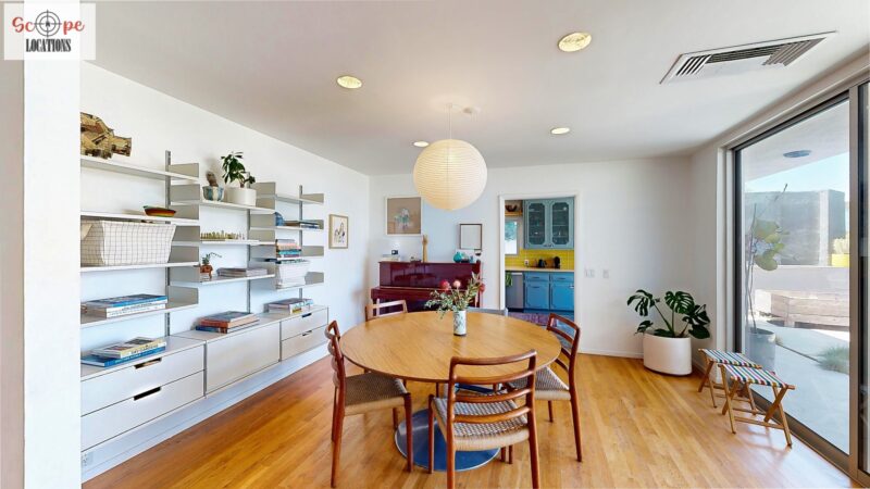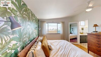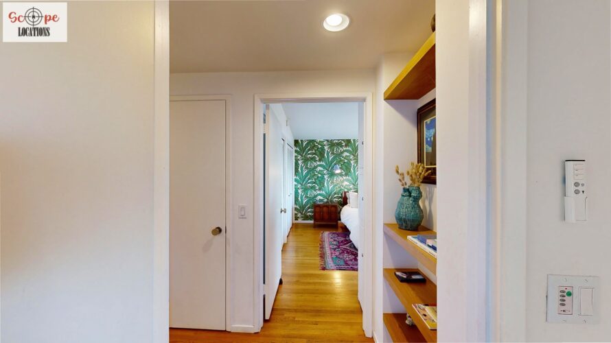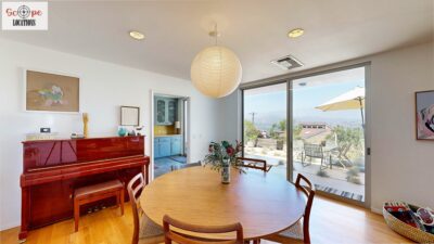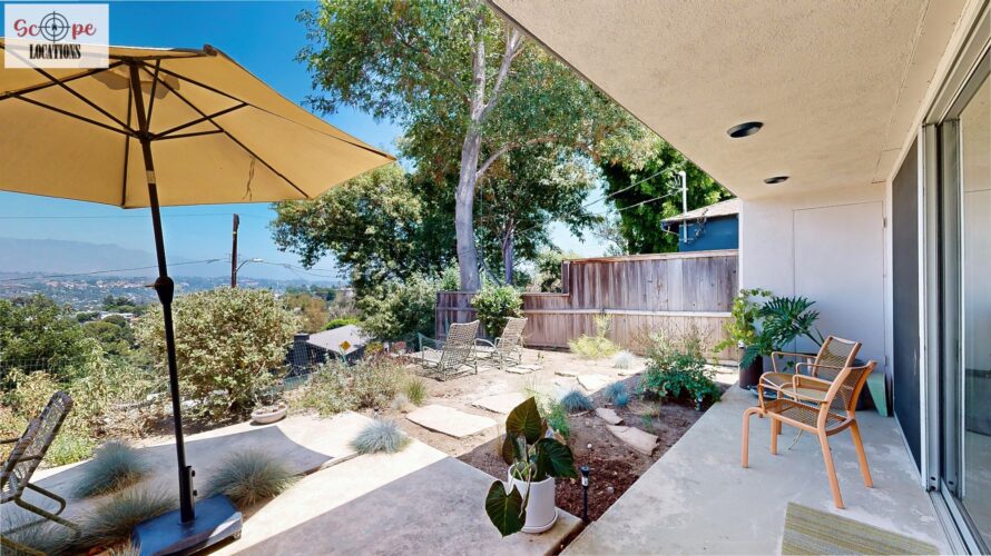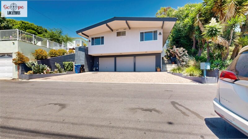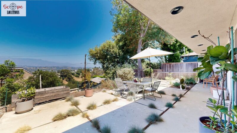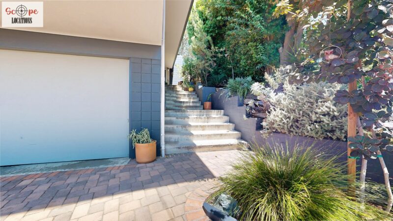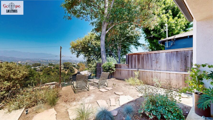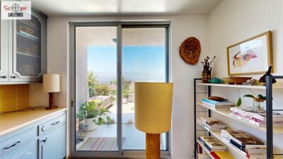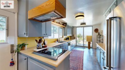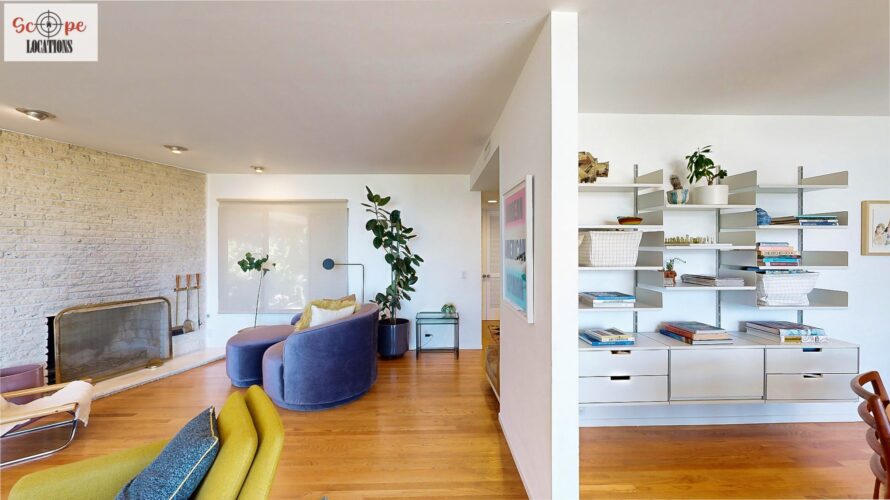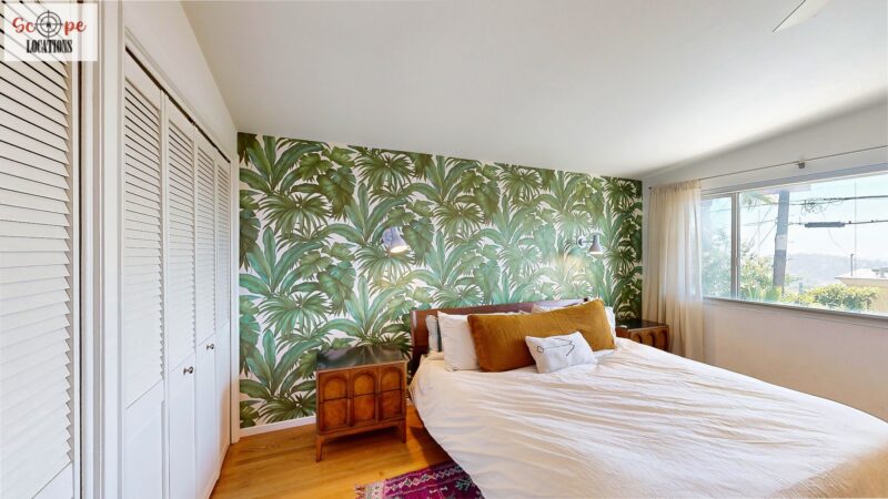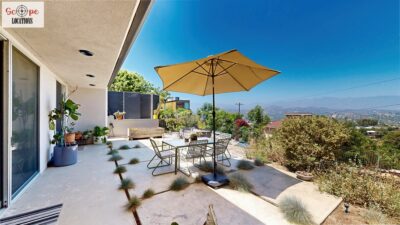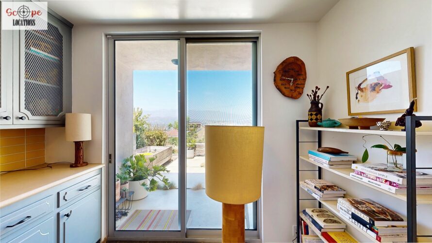 This mid-century modern home, built in 1964, offers expansive views of the San Gabriel Mountains from its location high in the hills of Glassell Park. The spacious, single-level floor plan spans 2,252 square feet and includes 4 generous-sized bedrooms and 2 bathrooms. The main living area features a stunning stone fireplace and oak-colored hardwood floors, with large sliding glass doors leading to a backyard. The kitchen showcases blue and gray cabinets, a bright yellow subway tile backsplash, and light yellow countertops, reflecting a classic mid-century aesthetic. The hallway bathroom has a green vanity cabinet, gray tiled countertops, and a mint-colored step-down tiled shower/tub combination. The master bedroom is highlighted by a tropical wallpaper accent wall. Additional features include a teal entry door, a three-car garage below the main level and an elevator lift.