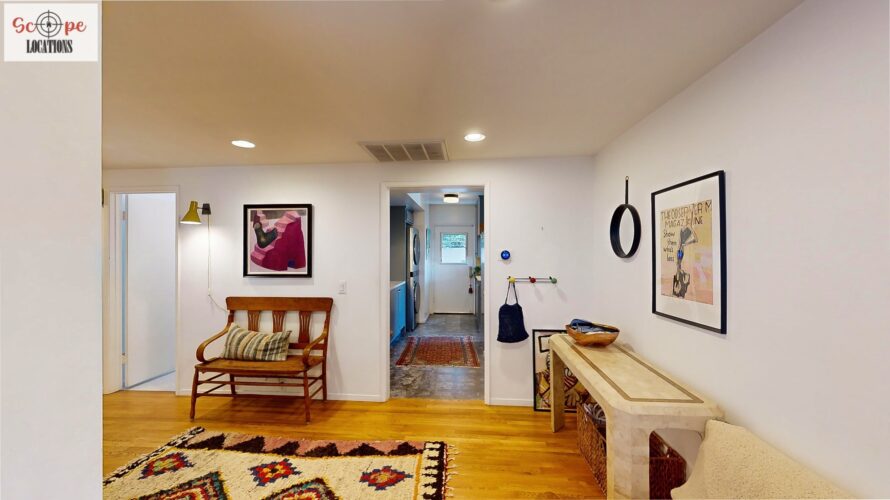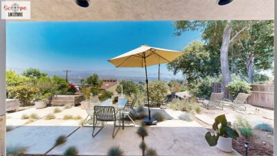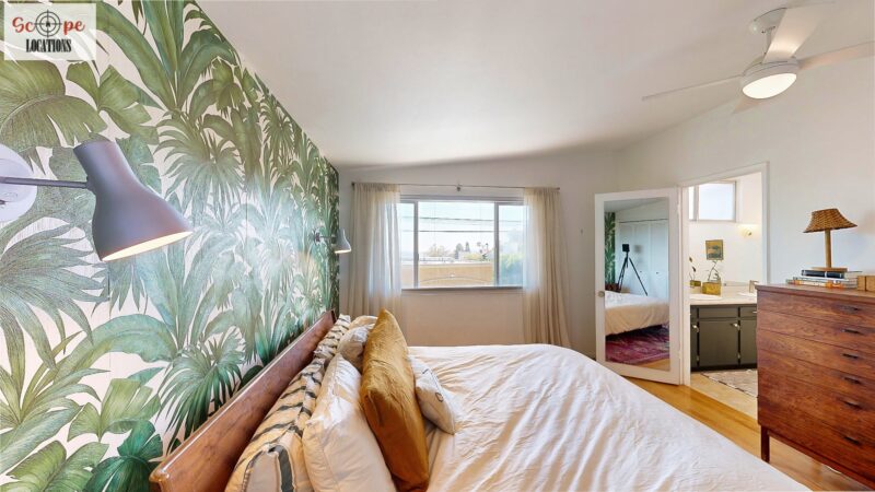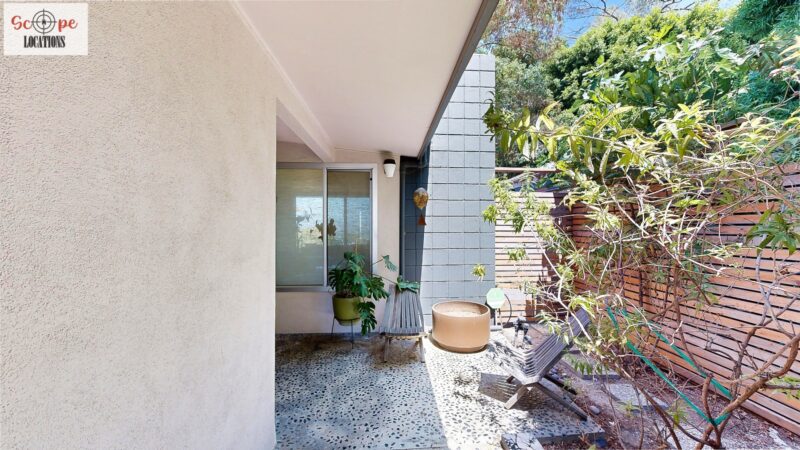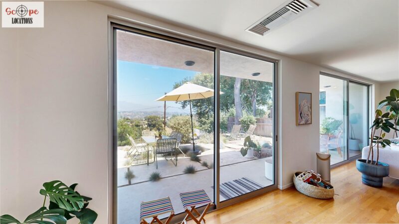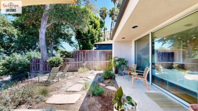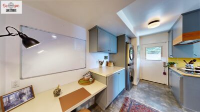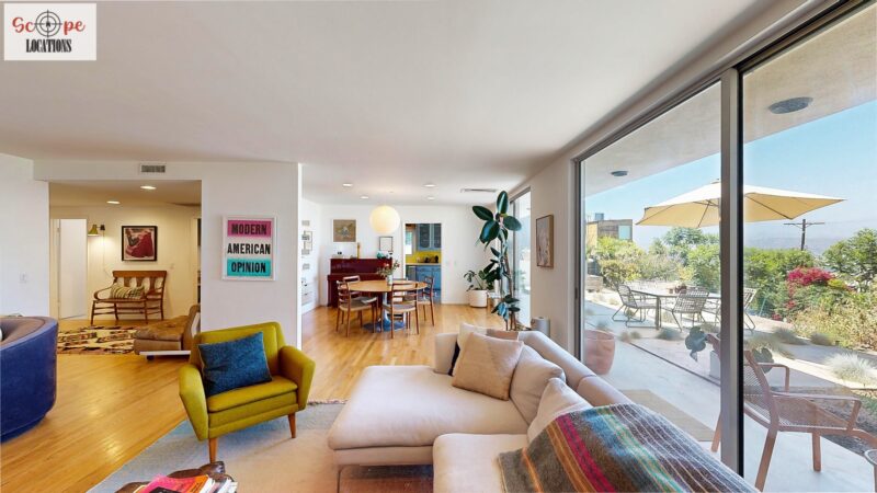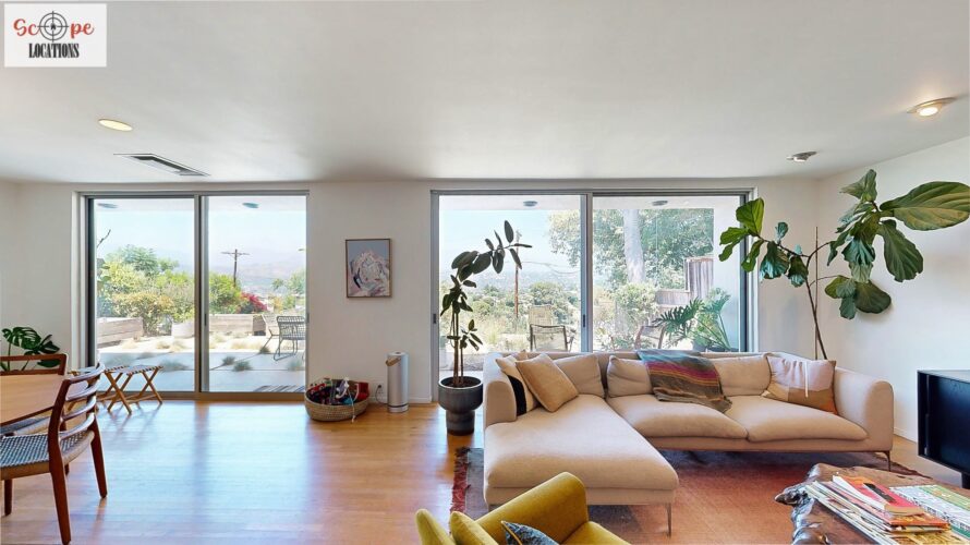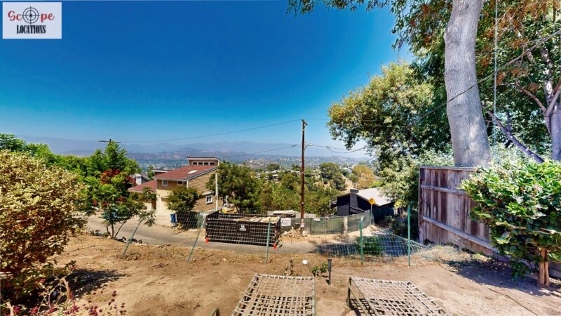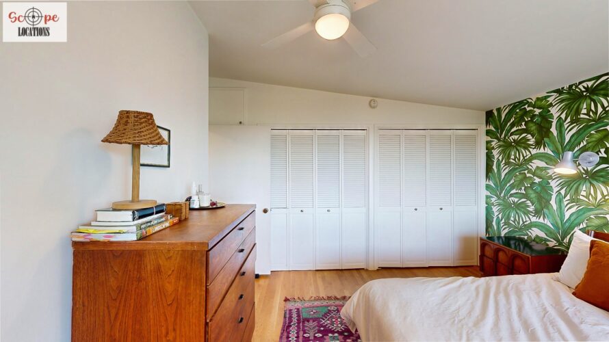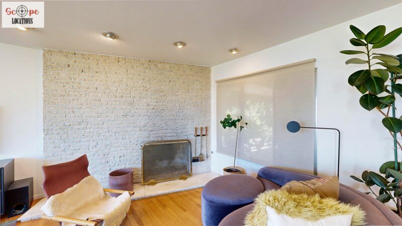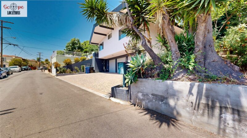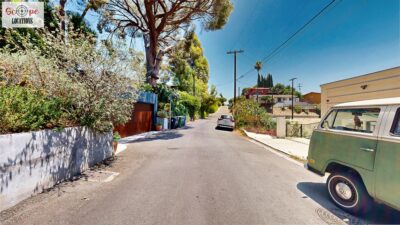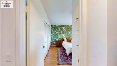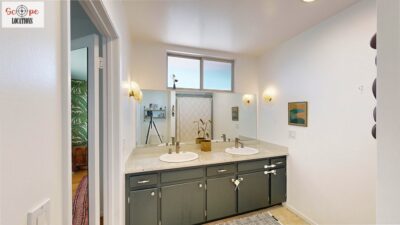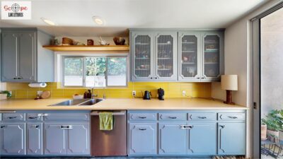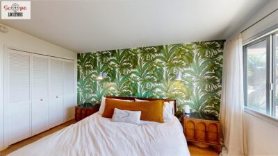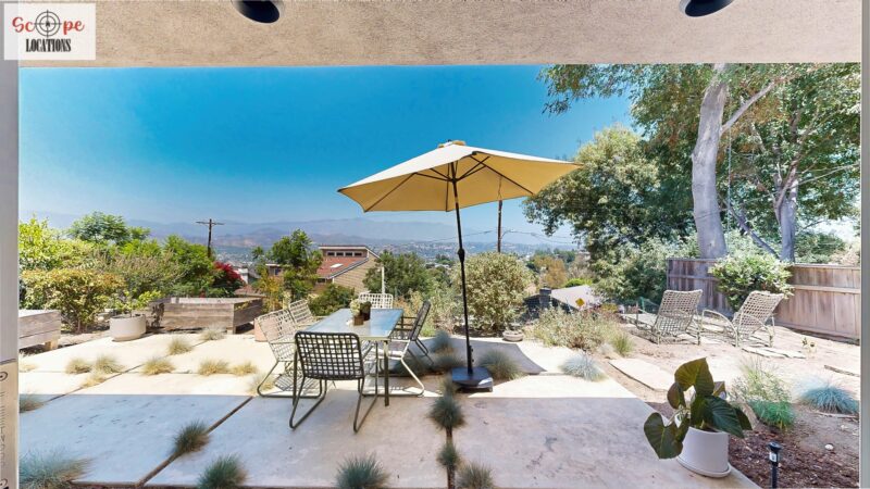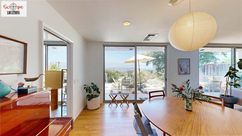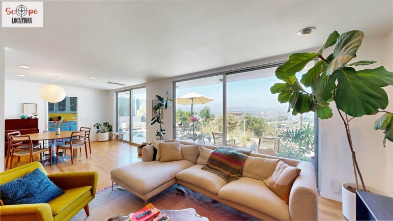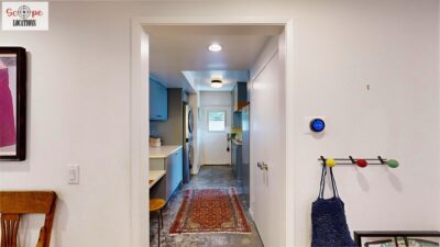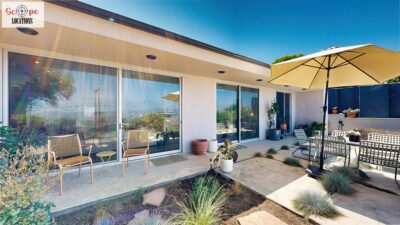 This mid-century modern home, built in 1964, offers expansive views of the San Gabriel Mountains from its location high in the hills of Glassell Park. The spacious, single-level floor plan spans 2,252 square feet and includes 4 generous-sized bedrooms and 2 bathrooms. The main living area features a stunning stone fireplace and oak-colored hardwood floors, with large sliding glass doors leading to a backyard. The kitchen showcases blue and gray cabinets, a bright yellow subway tile backsplash, and light yellow countertops, reflecting a classic mid-century aesthetic. The hallway bathroom has a green vanity cabinet, gray tiled countertops, and a mint-colored step-down tiled shower/tub combination. The master bedroom is highlighted by a tropical wallpaper accent wall. Additional features include a teal entry door, a three-car garage below the main level and an elevator lift.