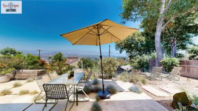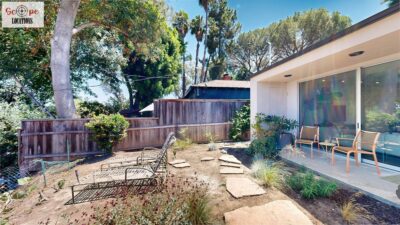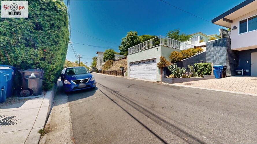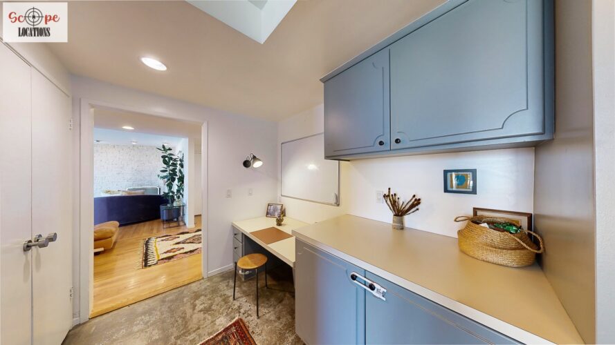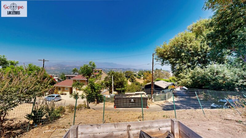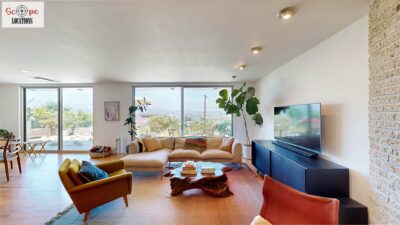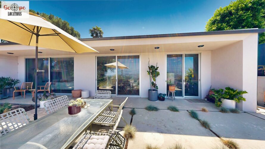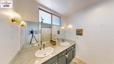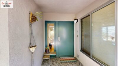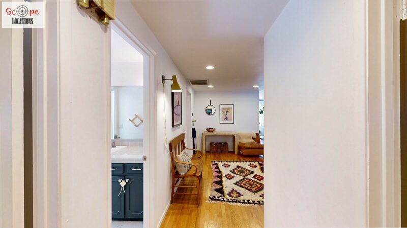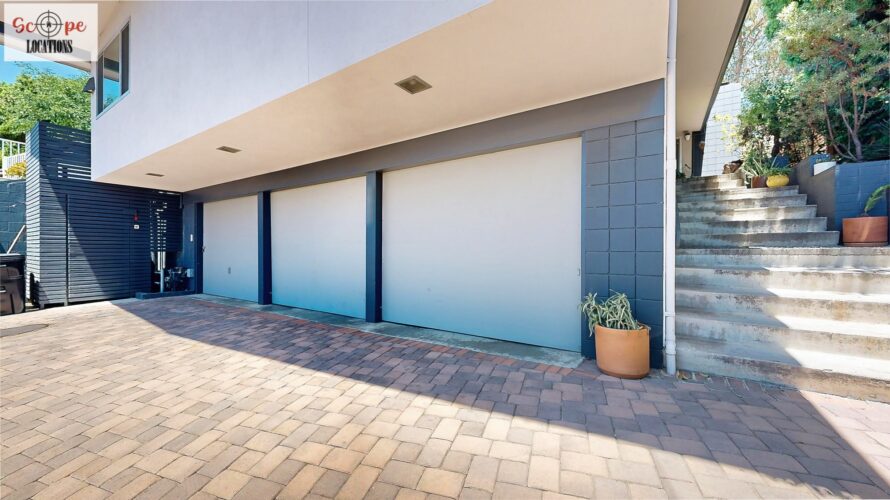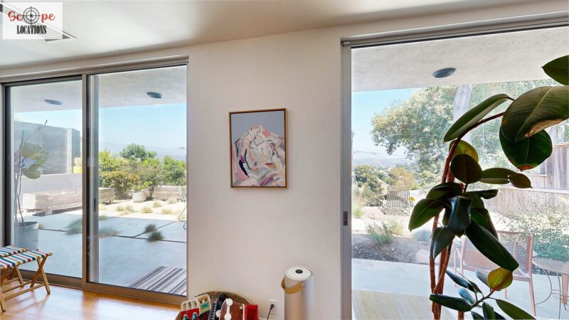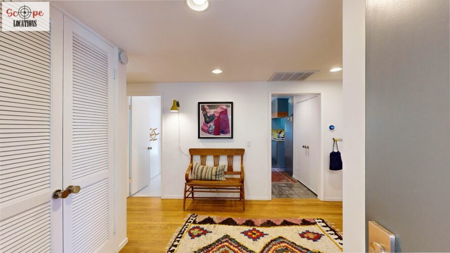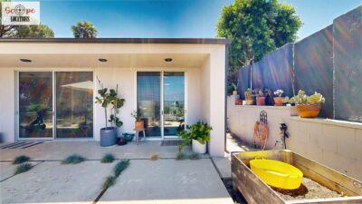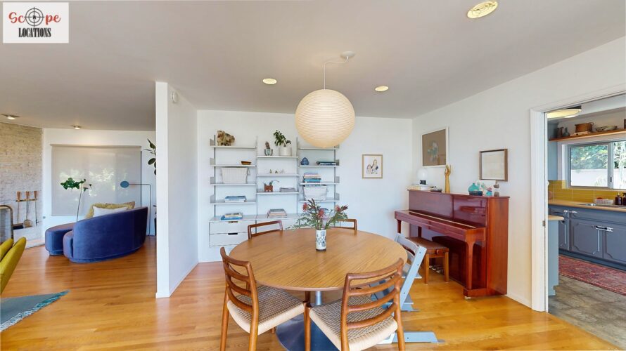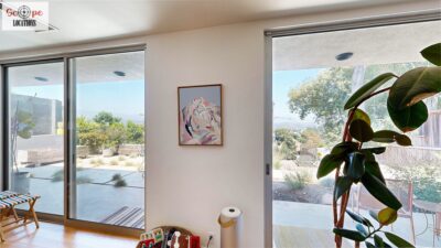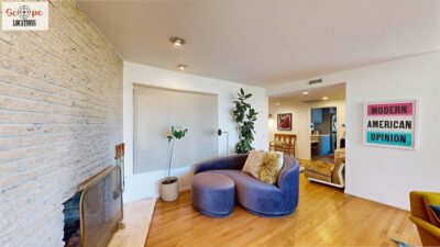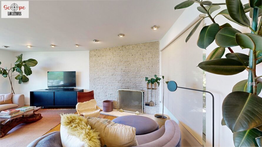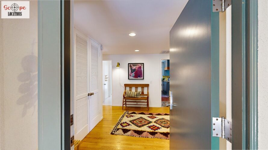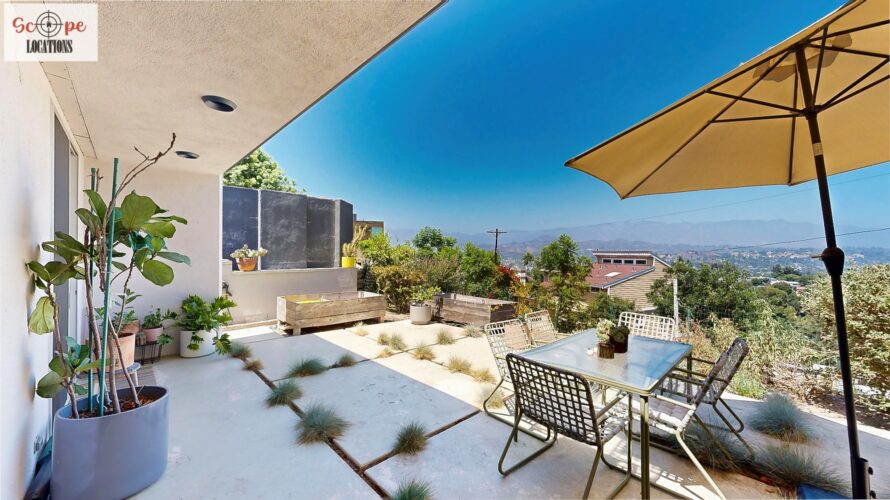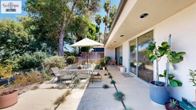 This mid-century modern home, built in 1964, offers expansive views of the San Gabriel Mountains from its location high in the hills of Glassell Park. The spacious, single-level floor plan spans 2,252 square feet and includes 4 generous-sized bedrooms and 2 bathrooms. The main living area features a stunning stone fireplace and oak-colored hardwood floors, with large sliding glass doors leading to a backyard. The kitchen showcases blue and gray cabinets, a bright yellow subway tile backsplash, and light yellow countertops, reflecting a classic mid-century aesthetic. The hallway bathroom has a green vanity cabinet, gray tiled countertops, and a mint-colored step-down tiled shower/tub combination. The master bedroom is highlighted by a tropical wallpaper accent wall. Additional features include a teal entry door, a three-car garage below the main level and an elevator lift.
