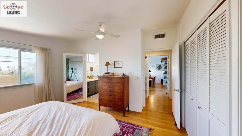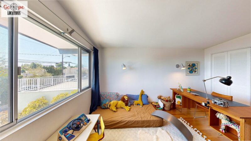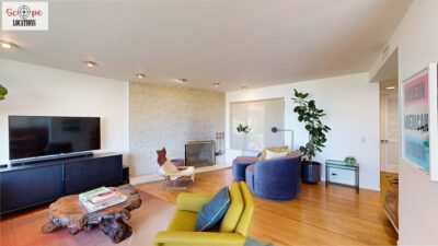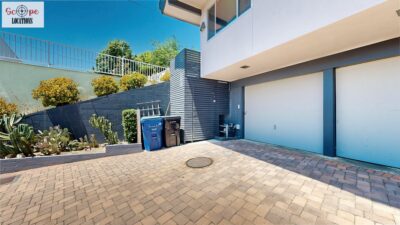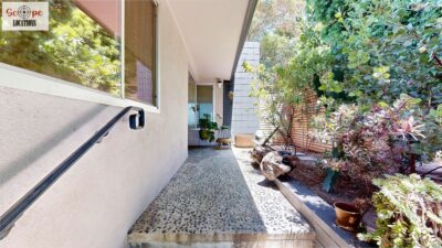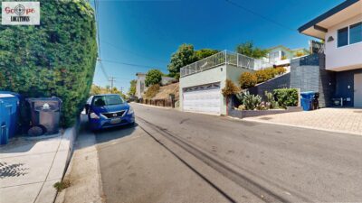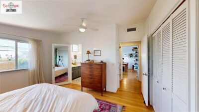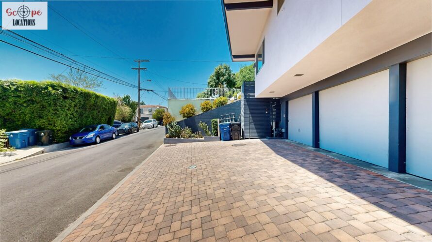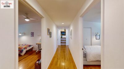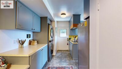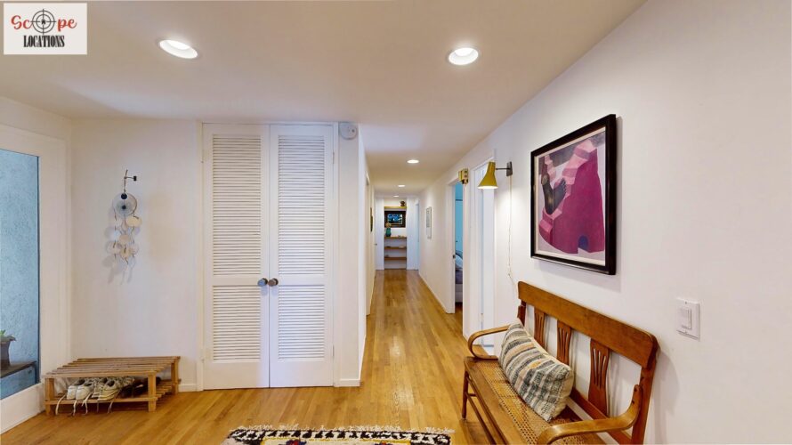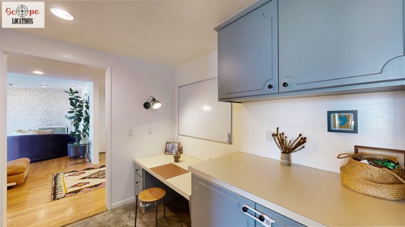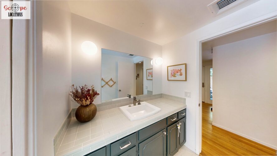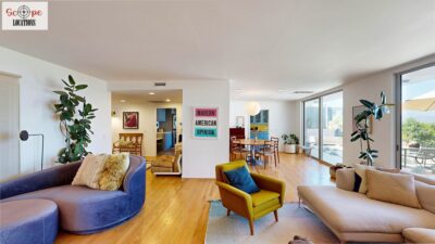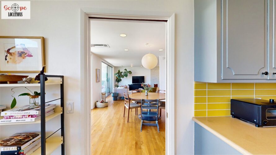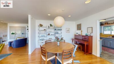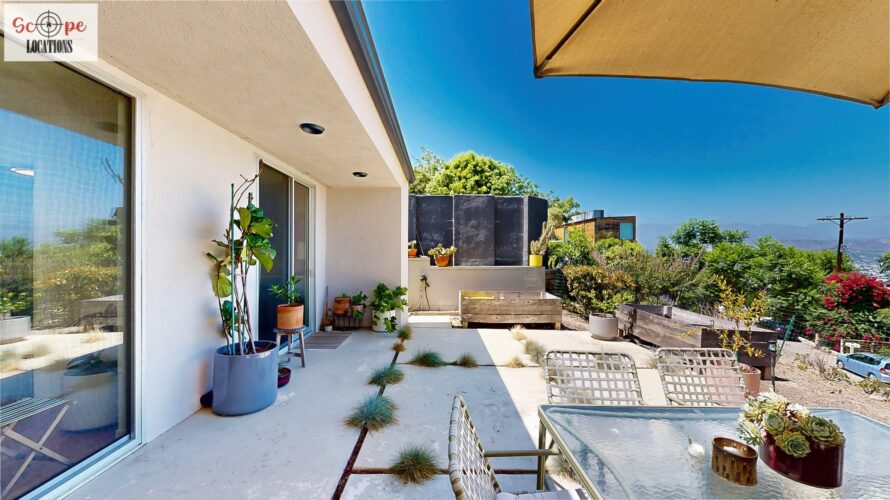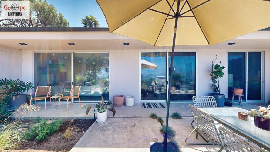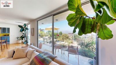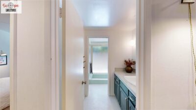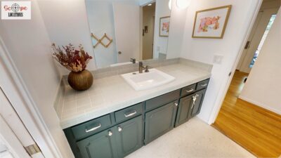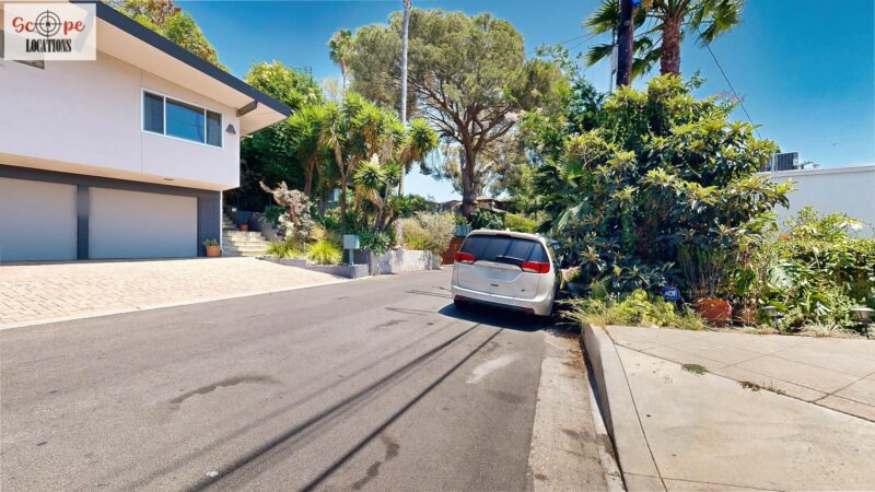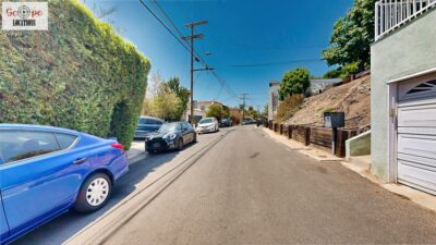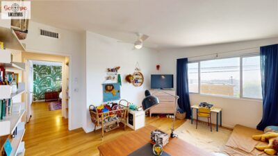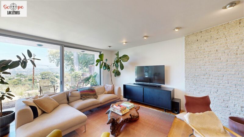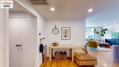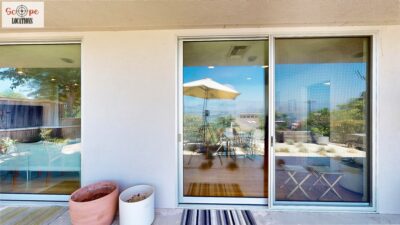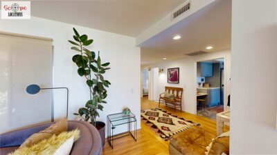 This mid-century modern home, built in 1964, offers expansive views of the San Gabriel Mountains from its location high in the hills of Glassell Park. The spacious, single-level floor plan spans 2,252 square feet and includes 4 generous-sized bedrooms and 2 bathrooms. The main living area features a stunning stone fireplace and oak-colored hardwood floors, with large sliding glass doors leading to a backyard. The kitchen showcases blue and gray cabinets, a bright yellow subway tile backsplash, and light yellow countertops, reflecting a classic mid-century aesthetic. The hallway bathroom has a green vanity cabinet, gray tiled countertops, and a mint-colored step-down tiled shower/tub combination. The master bedroom is highlighted by a tropical wallpaper accent wall. Additional features include a teal entry door, a three-car garage below the main level and an elevator lift.