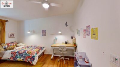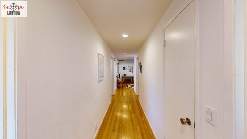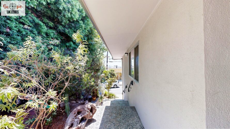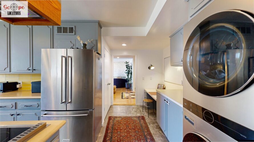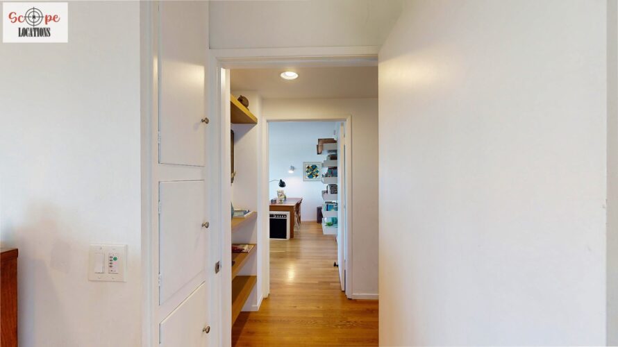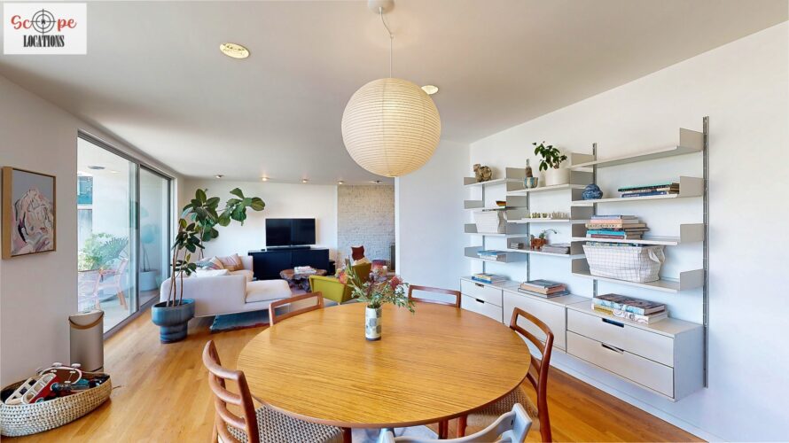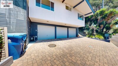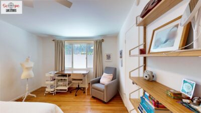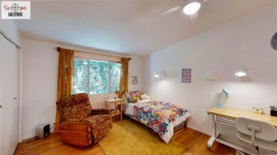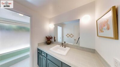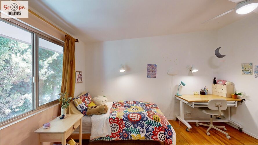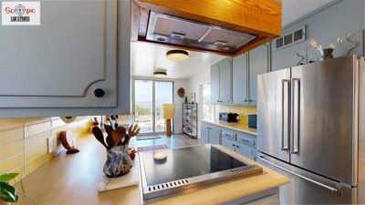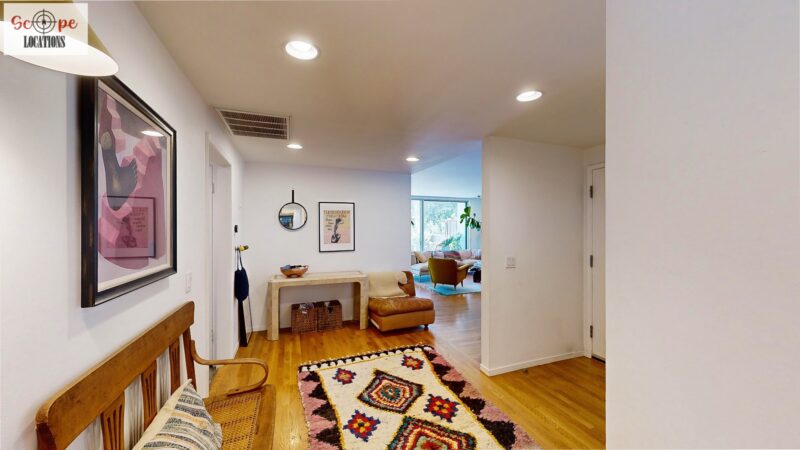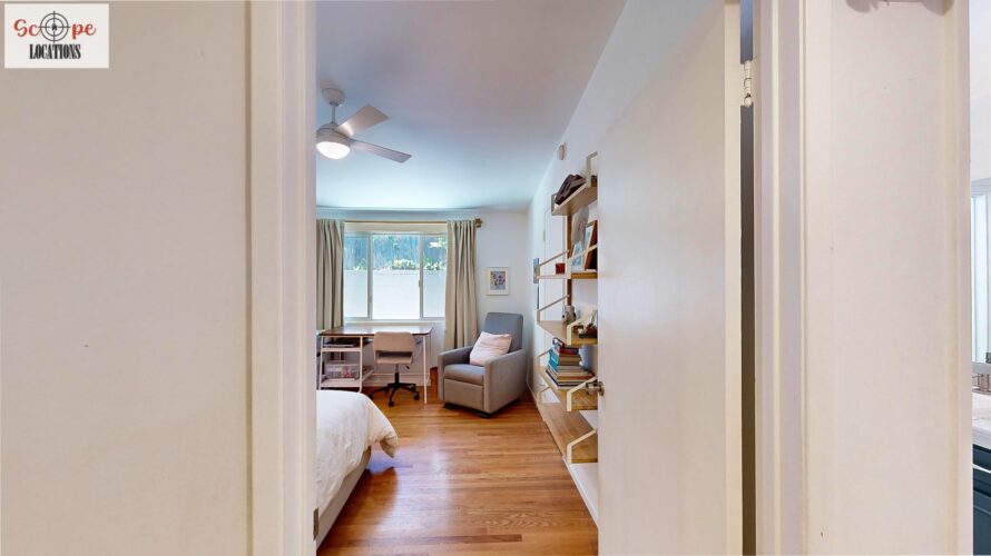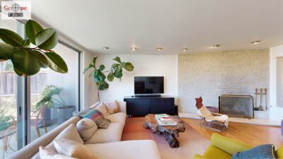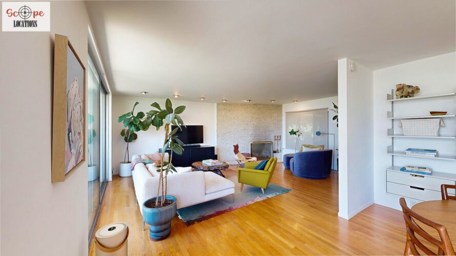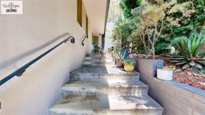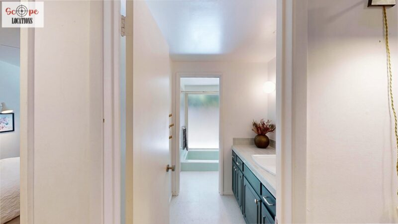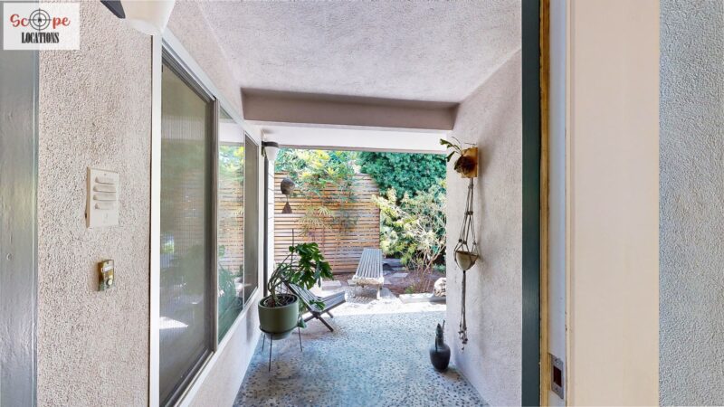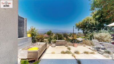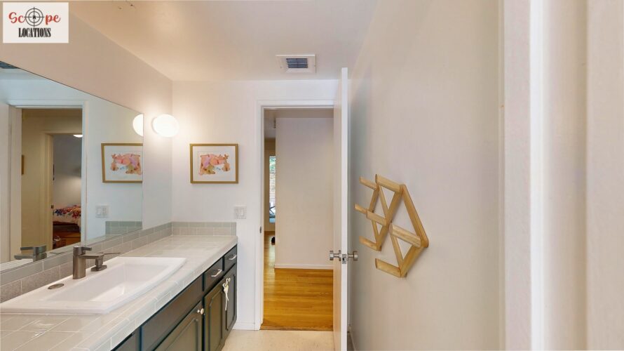 This mid-century modern home, built in 1964, offers expansive views of the San Gabriel Mountains from its location high in the hills of Glassell Park. The spacious, single-level floor plan spans 2,252 square feet and includes 4 generous-sized bedrooms and 2 bathrooms. The main living area features a stunning stone fireplace and oak-colored hardwood floors, with large sliding glass doors leading to a backyard. The kitchen showcases blue and gray cabinets, a bright yellow subway tile backsplash, and light yellow countertops, reflecting a classic mid-century aesthetic. The hallway bathroom has a green vanity cabinet, gray tiled countertops, and a mint-colored step-down tiled shower/tub combination. The master bedroom is highlighted by a tropical wallpaper accent wall. Additional features include a teal entry door, a three-car garage below the main level and an elevator lift.