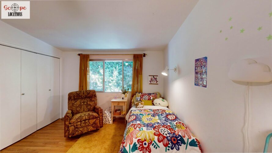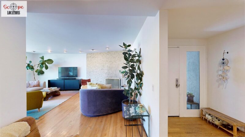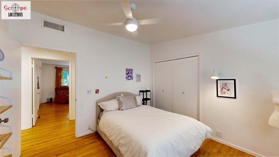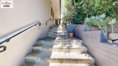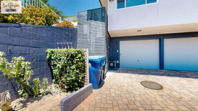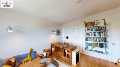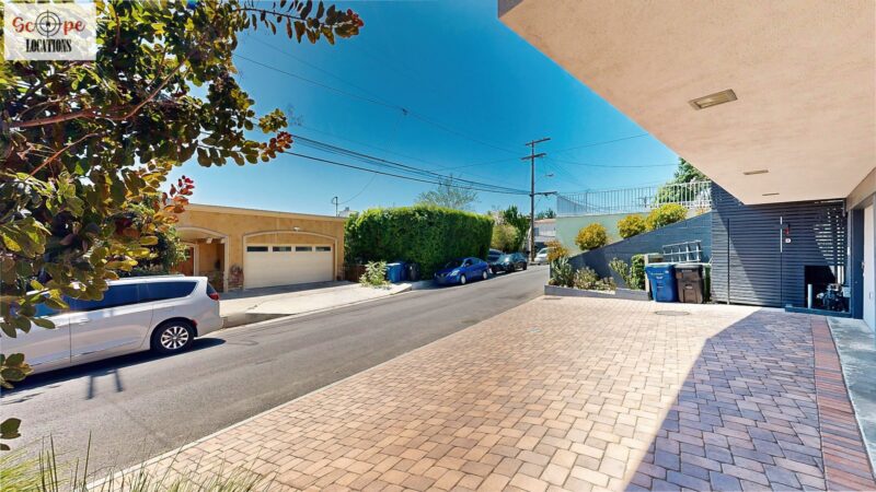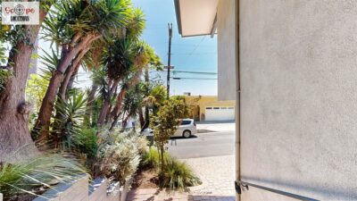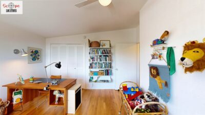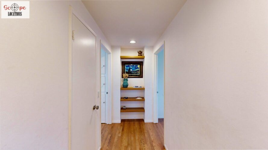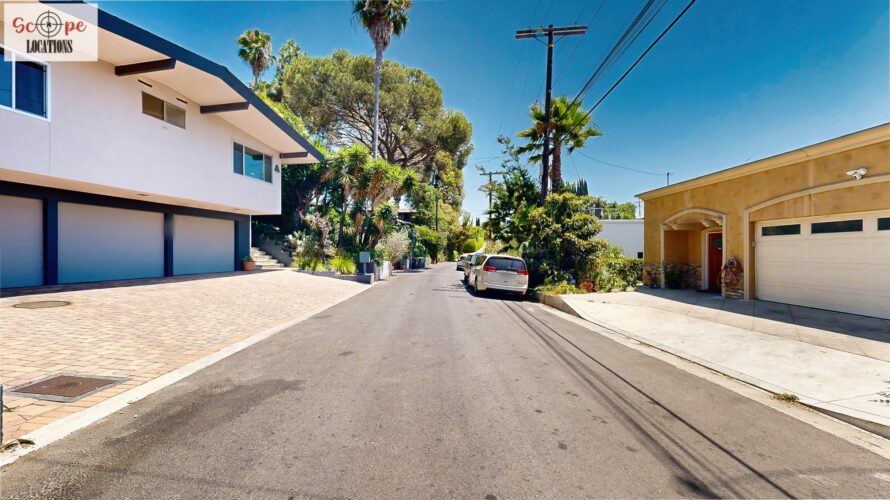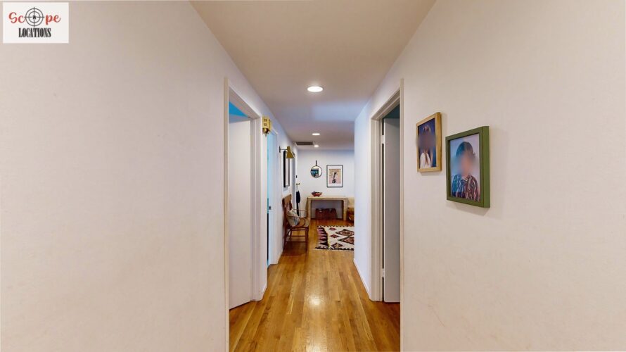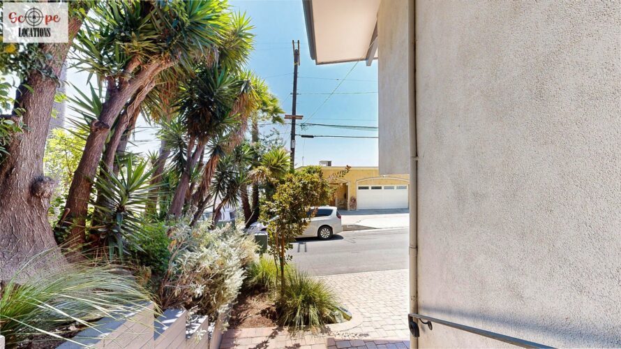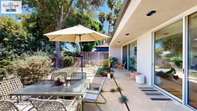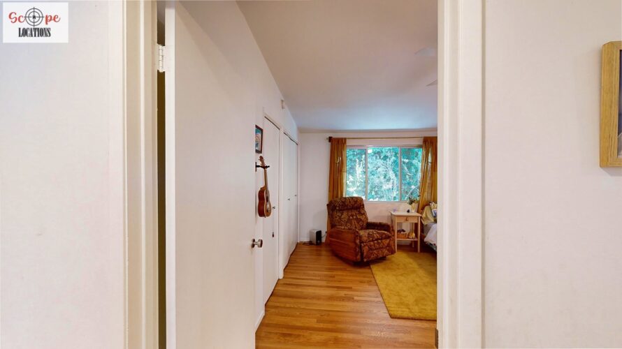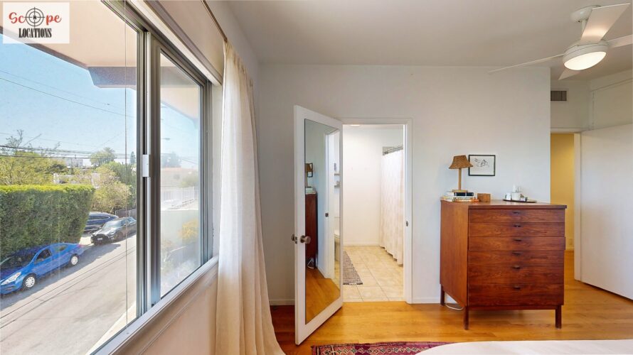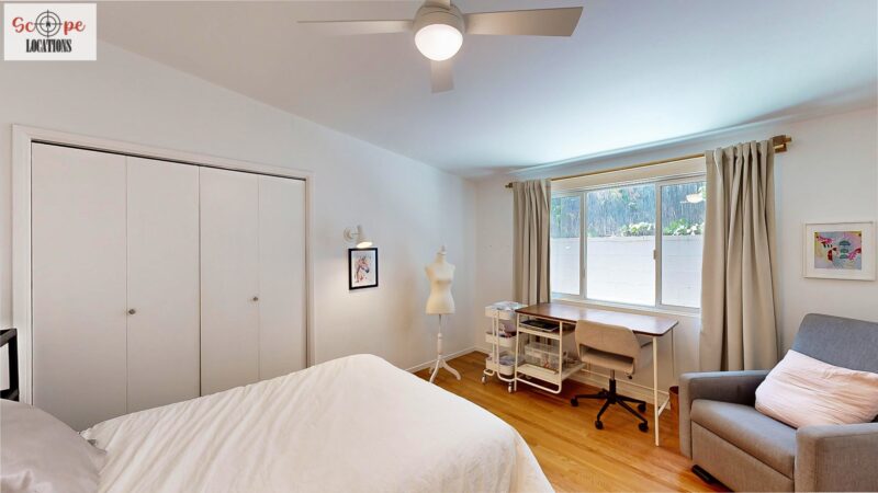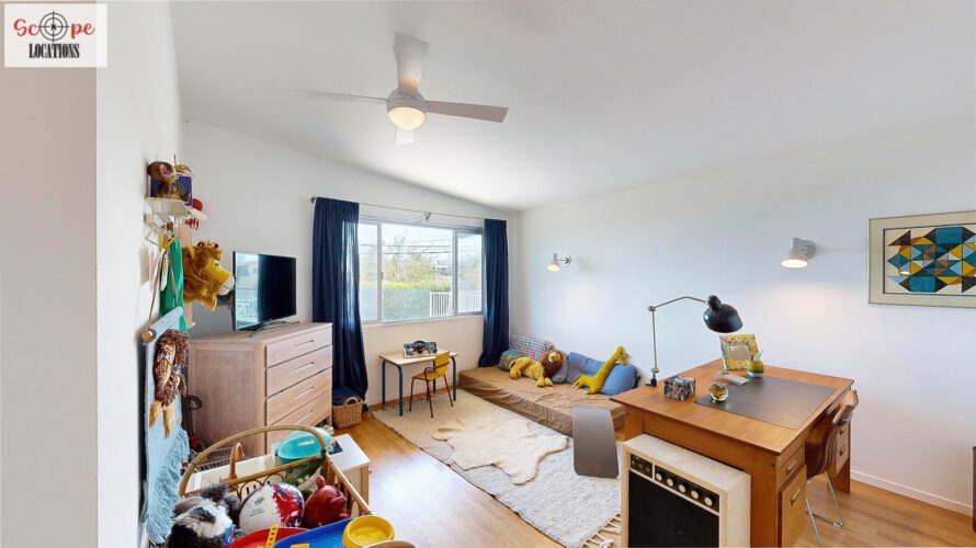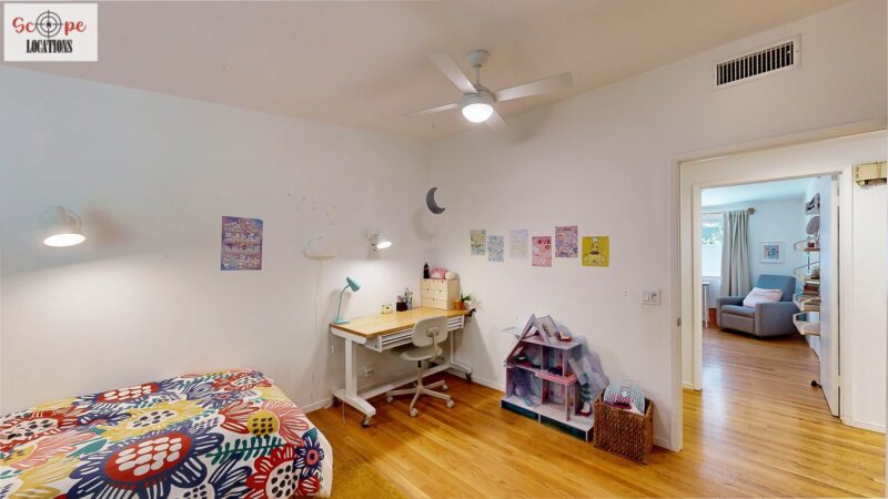 This mid-century modern home, built in 1964, offers expansive views of the San Gabriel Mountains from its location high in the hills of Glassell Park. The spacious, single-level floor plan spans 2,252 square feet and includes 4 generous-sized bedrooms and 2 bathrooms. The main living area features a stunning stone fireplace and oak-colored hardwood floors, with large sliding glass doors leading to a backyard. The kitchen showcases blue and gray cabinets, a bright yellow subway tile backsplash, and light yellow countertops, reflecting a classic mid-century aesthetic. The hallway bathroom has a green vanity cabinet, gray tiled countertops, and a mint-colored step-down tiled shower/tub combination. The master bedroom is highlighted by a tropical wallpaper accent wall. Additional features include a teal entry door, a three-car garage below the main level and an elevator lift.