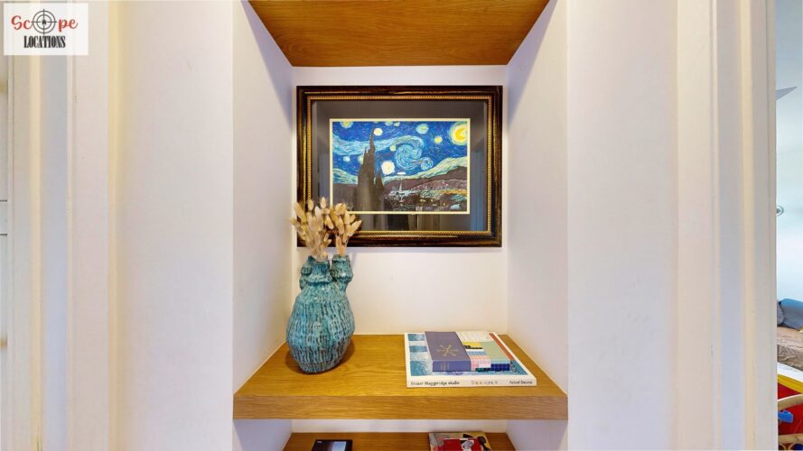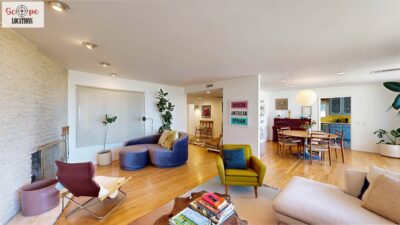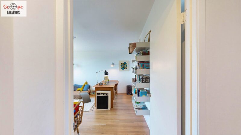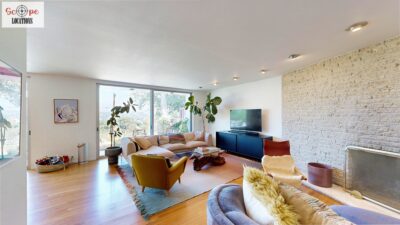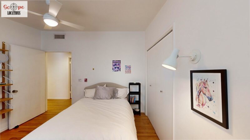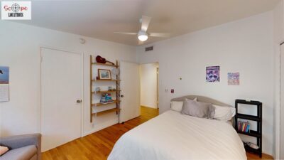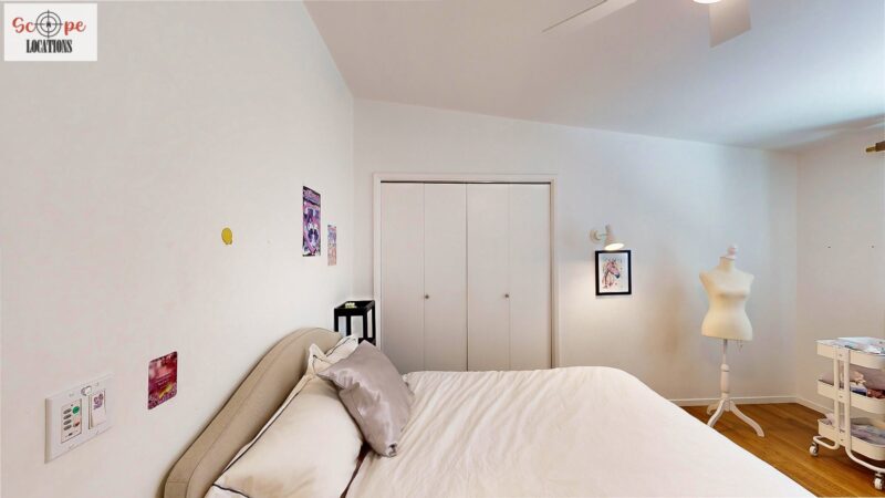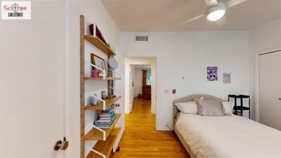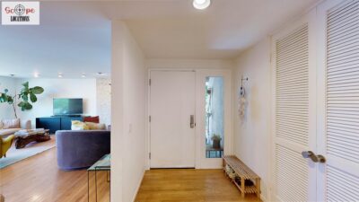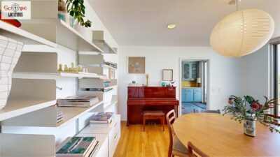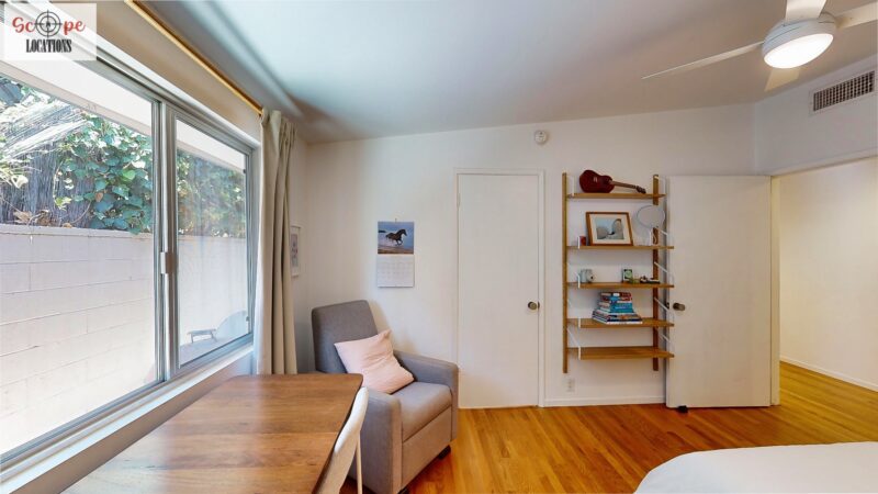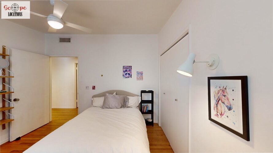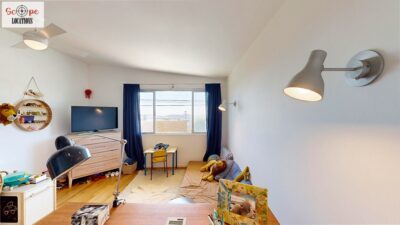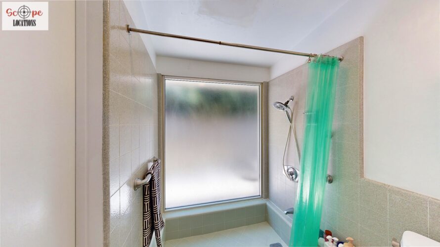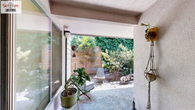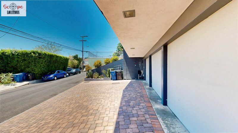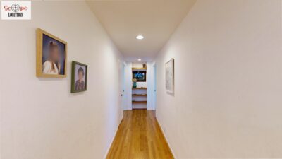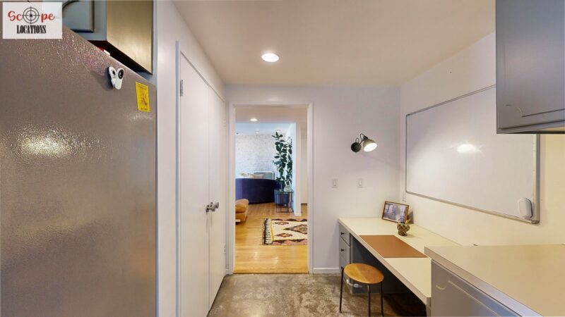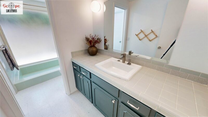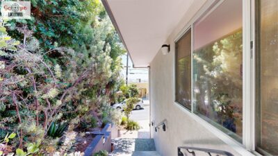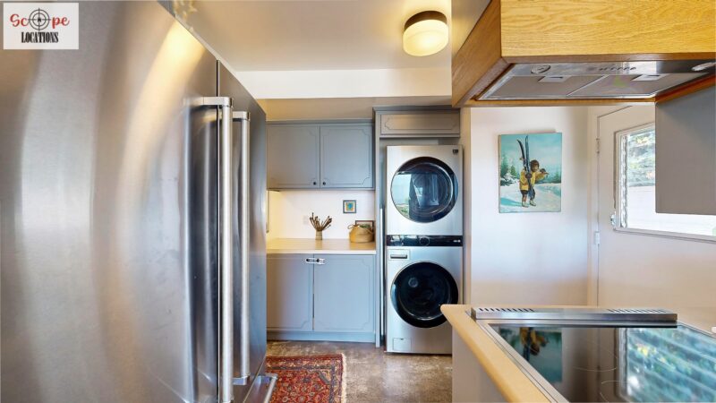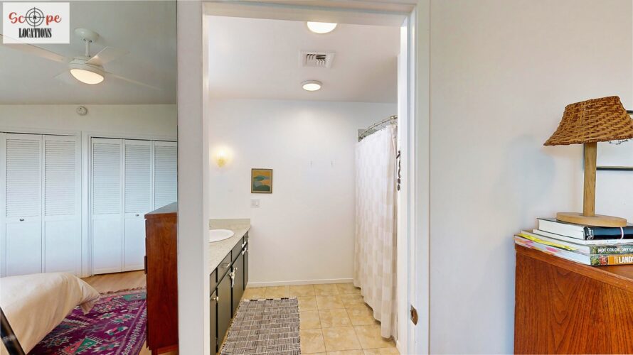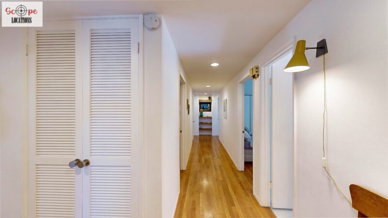 This mid-century modern home, built in 1964, offers expansive views of the San Gabriel Mountains from its location high in the hills of Glassell Park. The spacious, single-level floor plan spans 2,252 square feet and includes 4 generous-sized bedrooms and 2 bathrooms. The main living area features a stunning stone fireplace and oak-colored hardwood floors, with large sliding glass doors leading to a backyard. The kitchen showcases blue and gray cabinets, a bright yellow subway tile backsplash, and light yellow countertops, reflecting a classic mid-century aesthetic. The hallway bathroom has a green vanity cabinet, gray tiled countertops, and a mint-colored step-down tiled shower/tub combination. The master bedroom is highlighted by a tropical wallpaper accent wall. Additional features include a teal entry door, a three-car garage below the main level and an elevator lift.