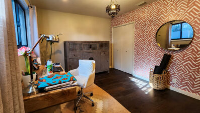 Hardwood FloorsChandelierRecessed LightingContemporaryRustic DécorLight Color PaletteAccent/Featured WallWallpaper