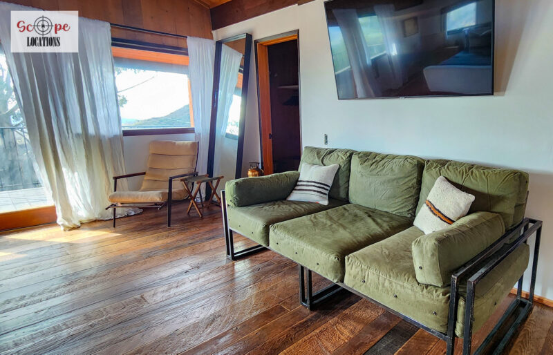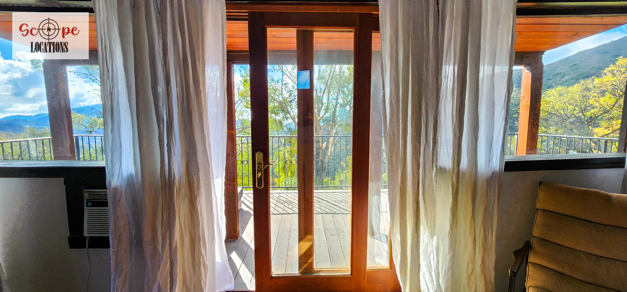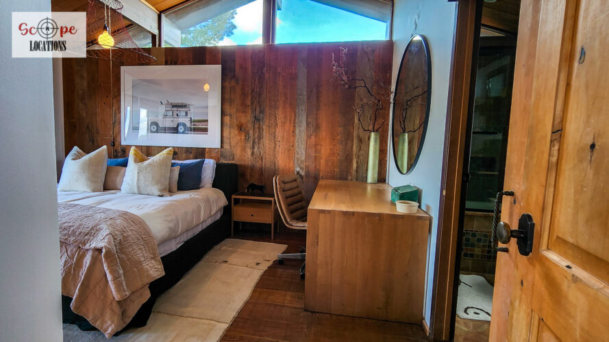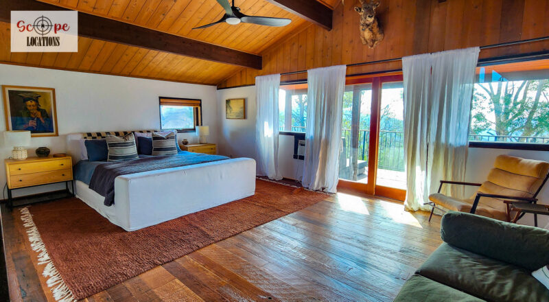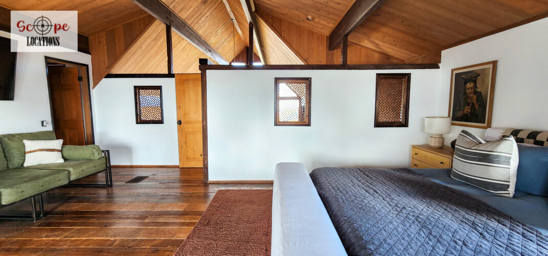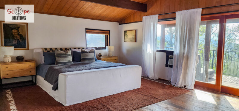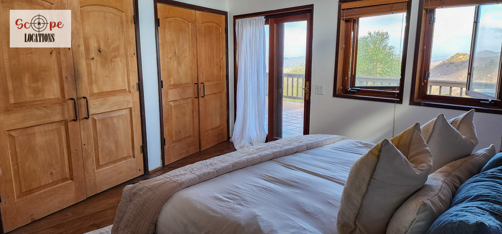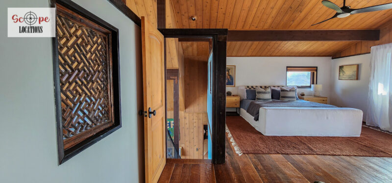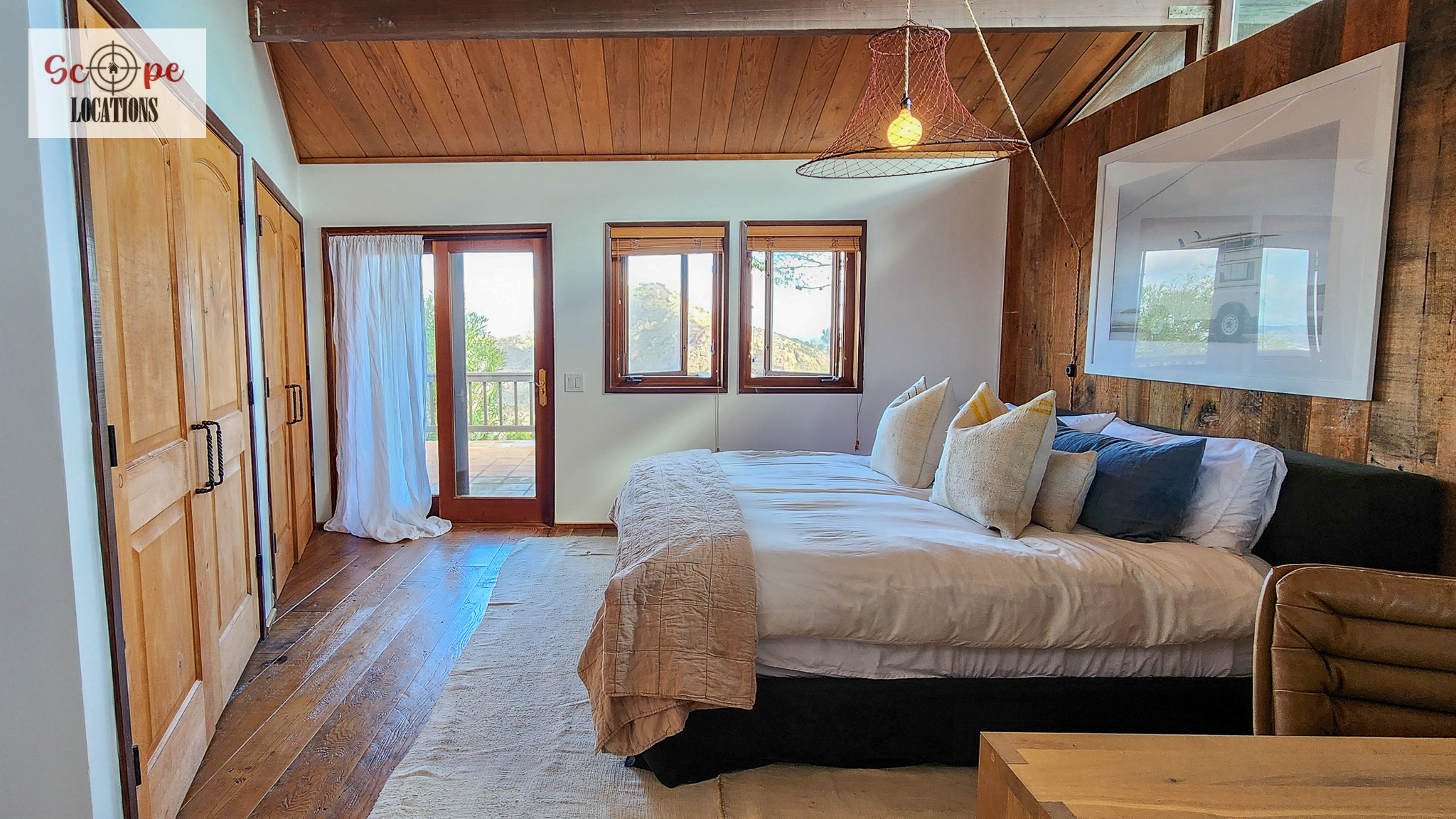 - One en-suite bedroom upstairs with a private patio and ocean views through the mountains.