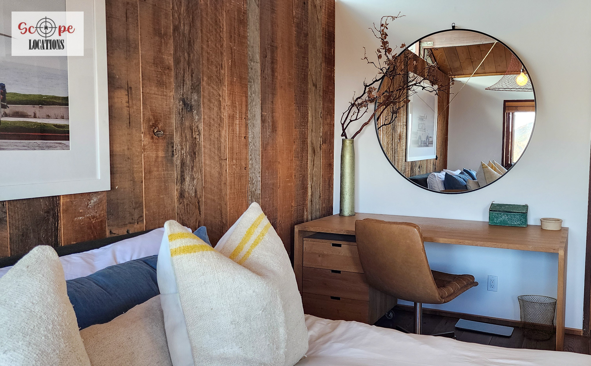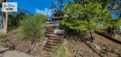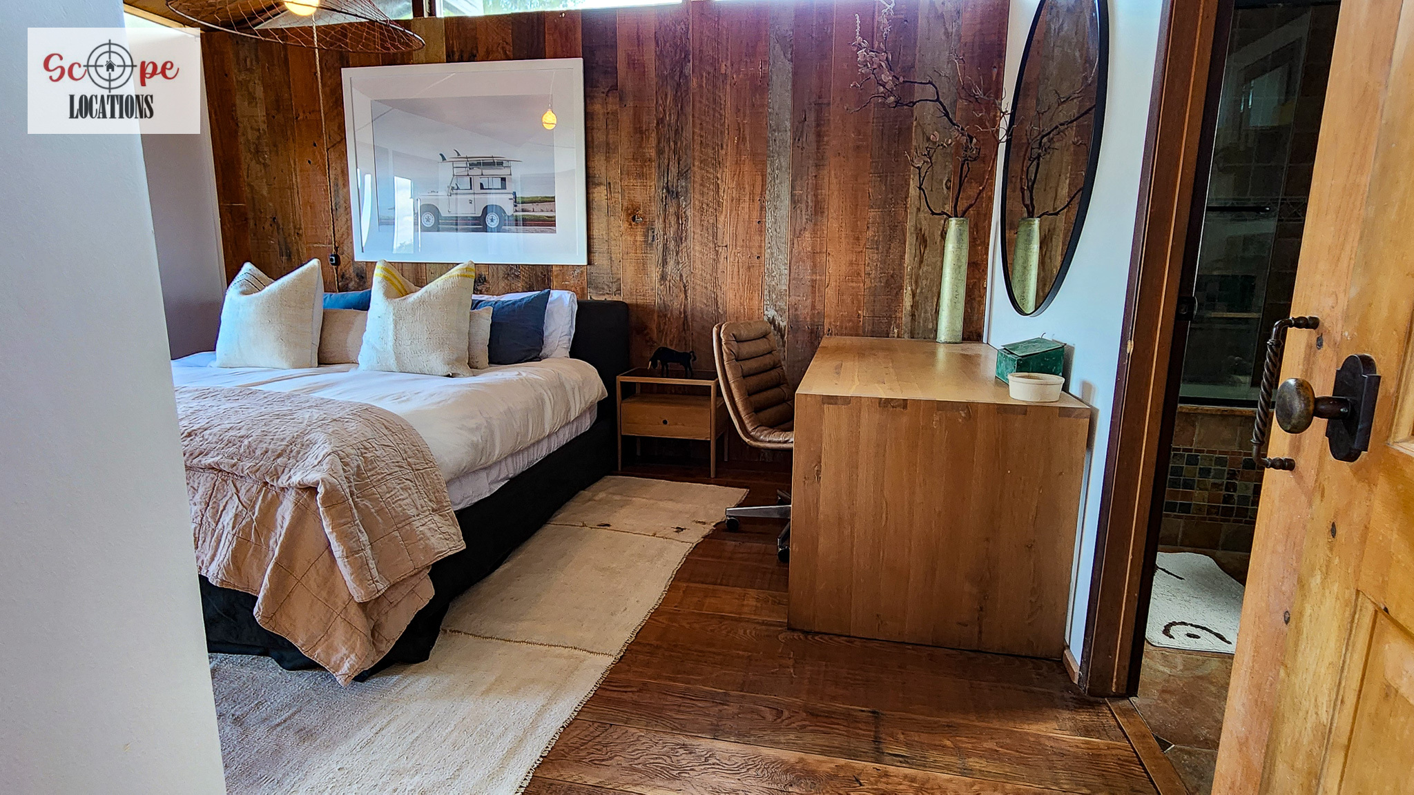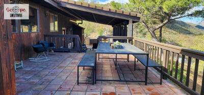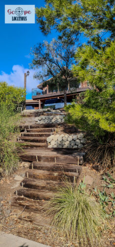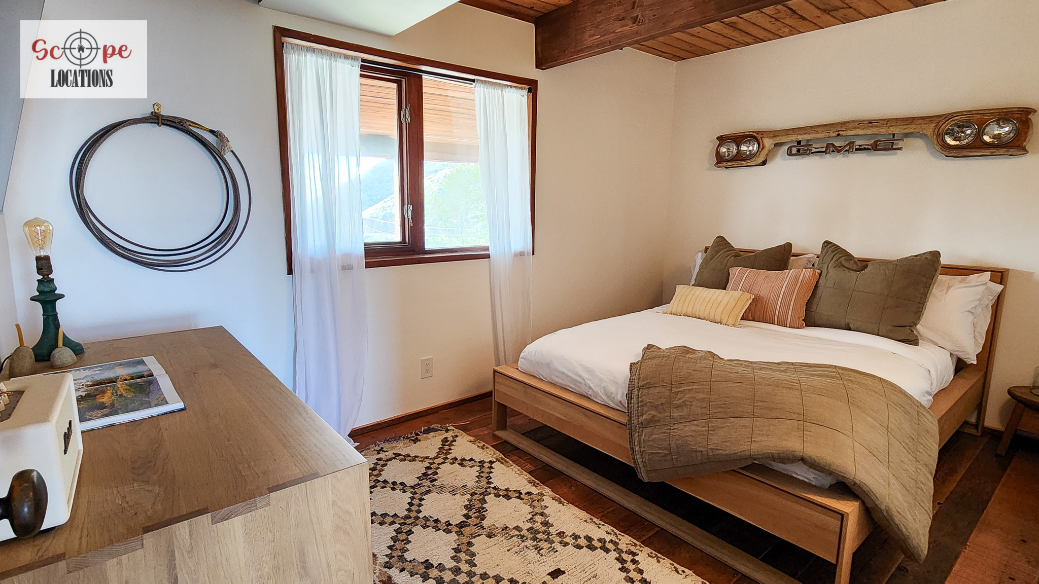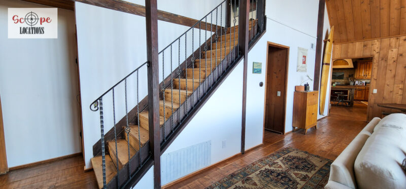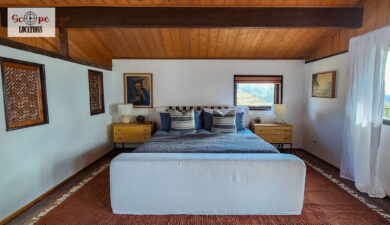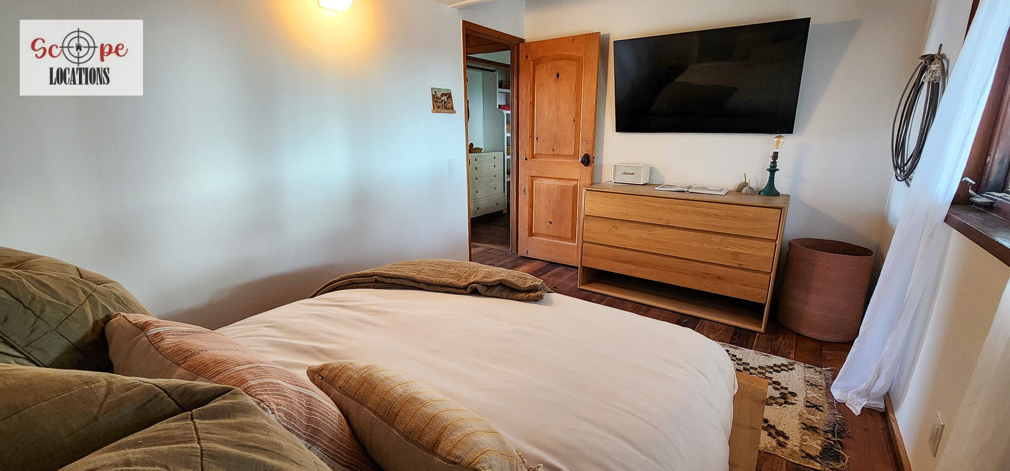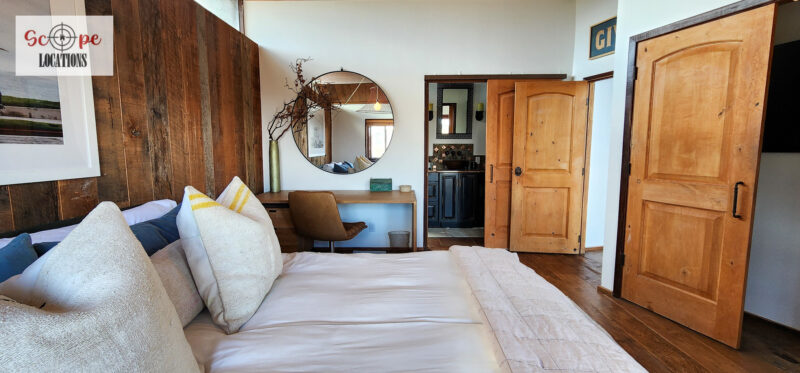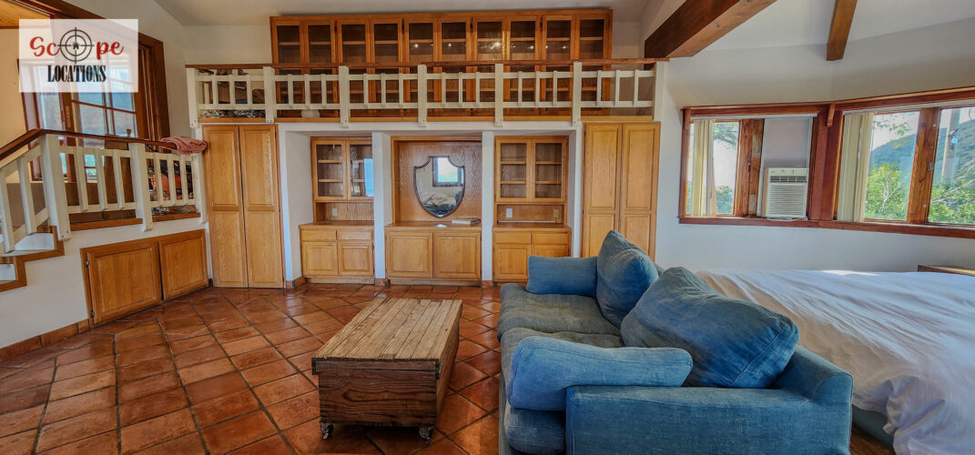 - One en-suite bedroom upstairs with a private patio and ocean views through the mountains.