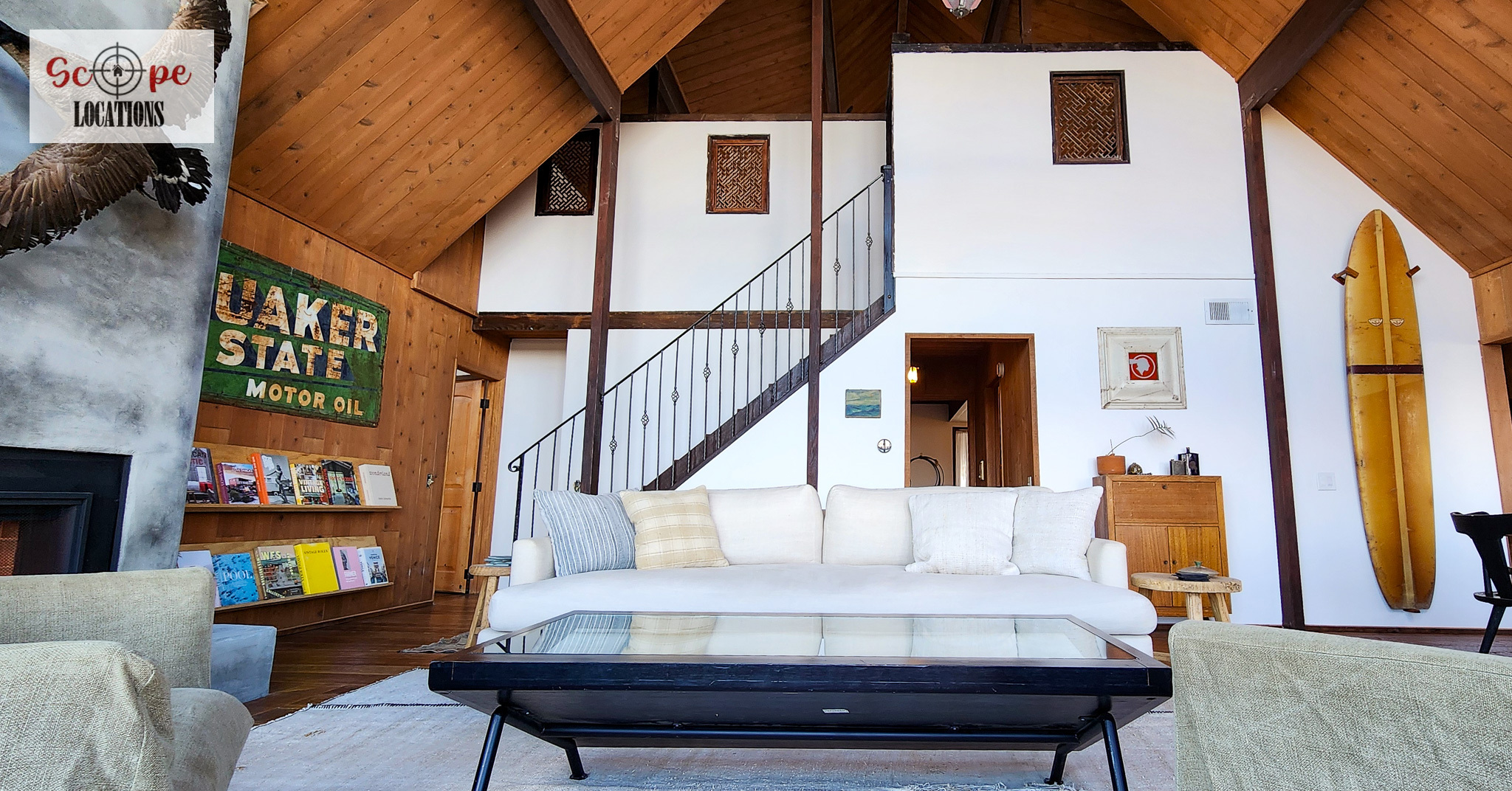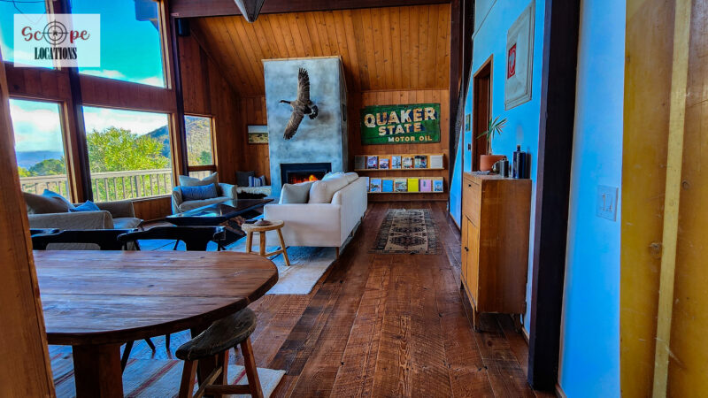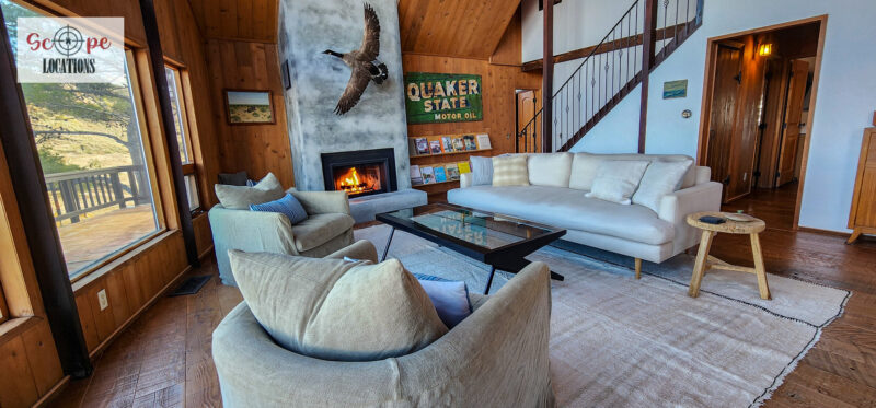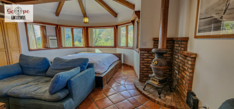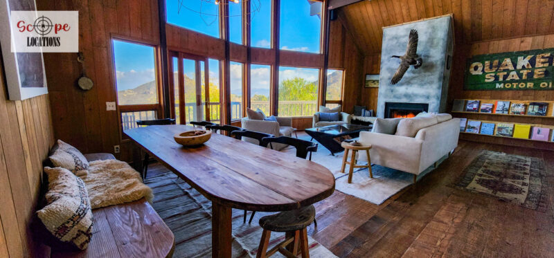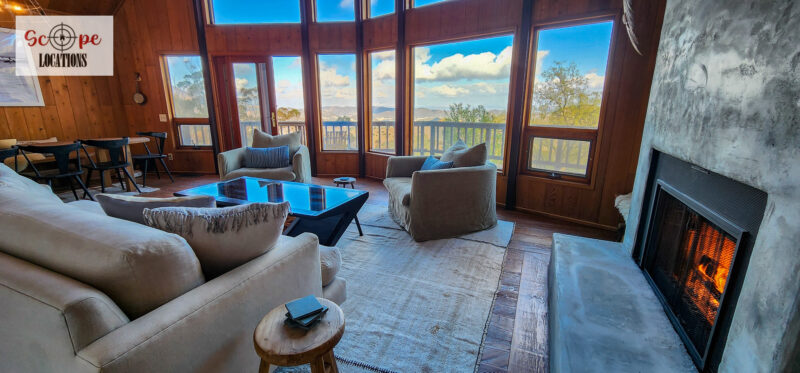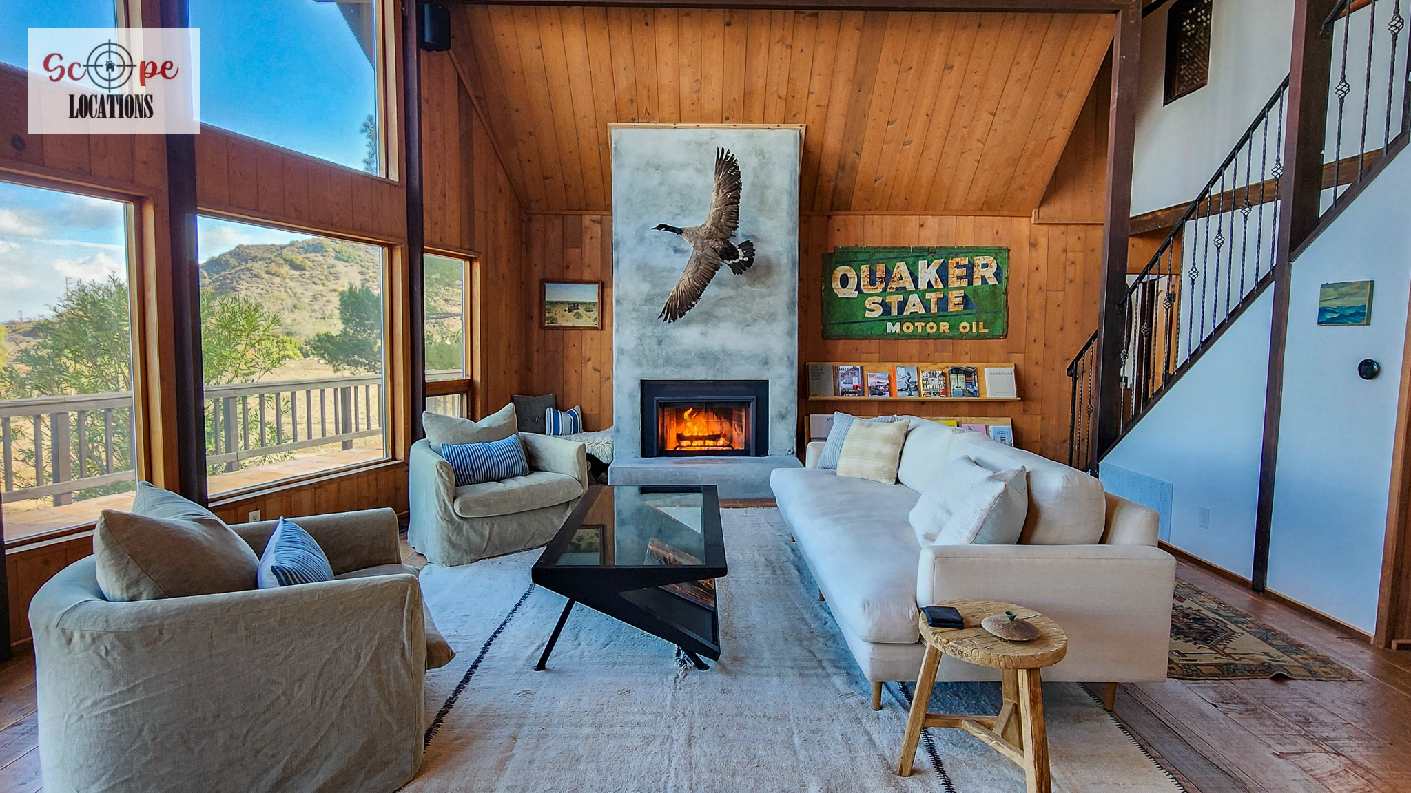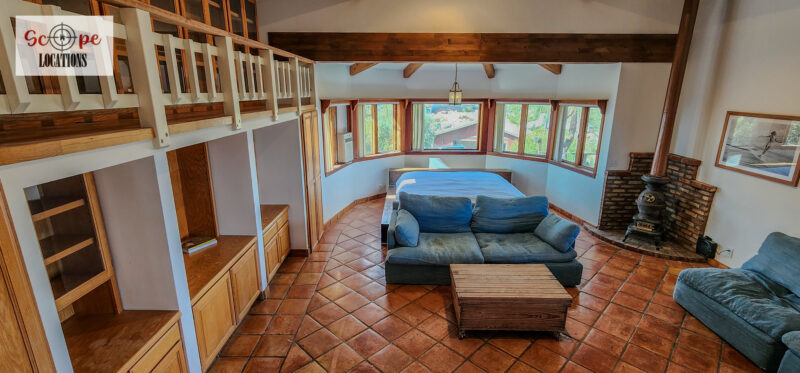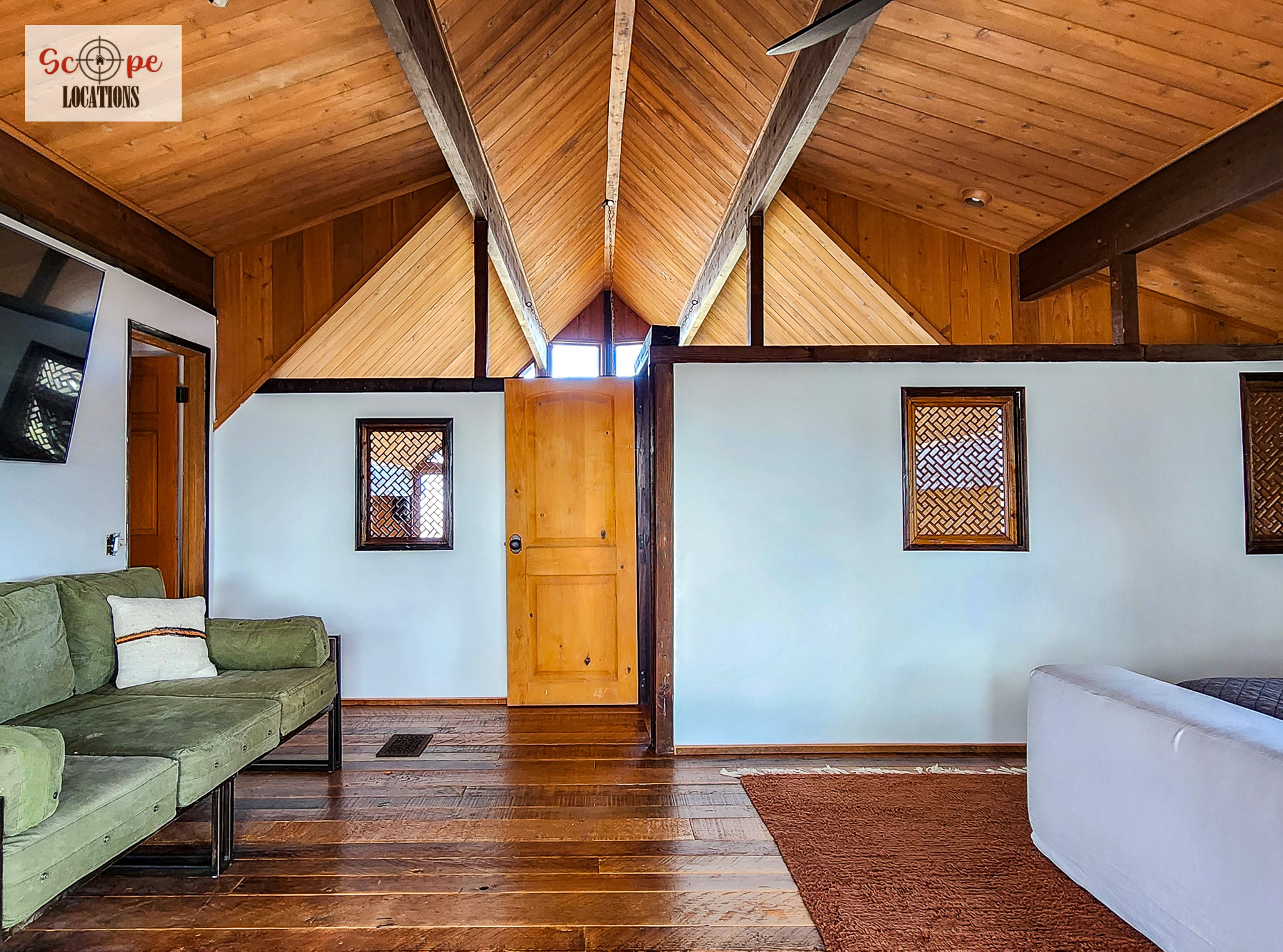 - Living Room: 30-foot high pitched ceiling, floor-to-ceiling glass windows, wood cladding & beams, wood-burning fireplace.