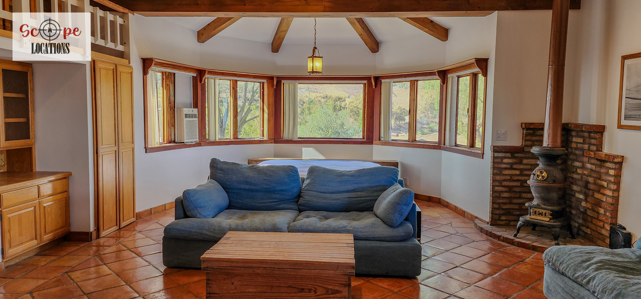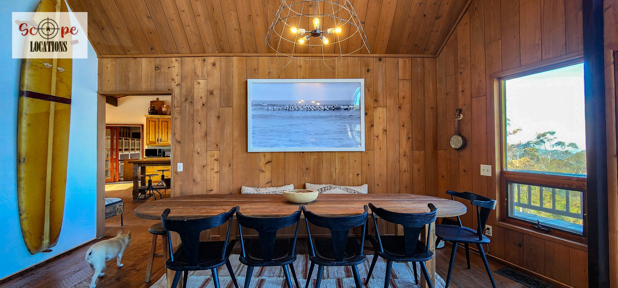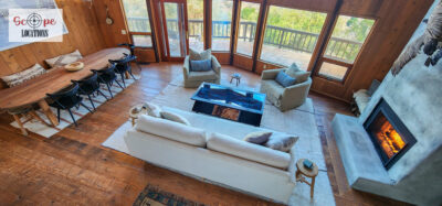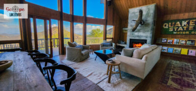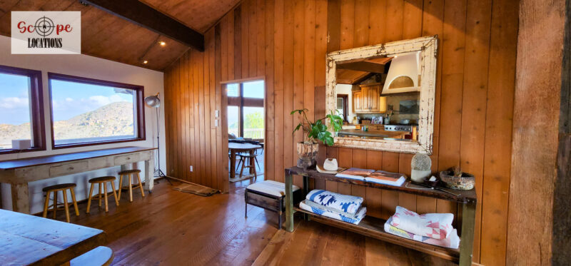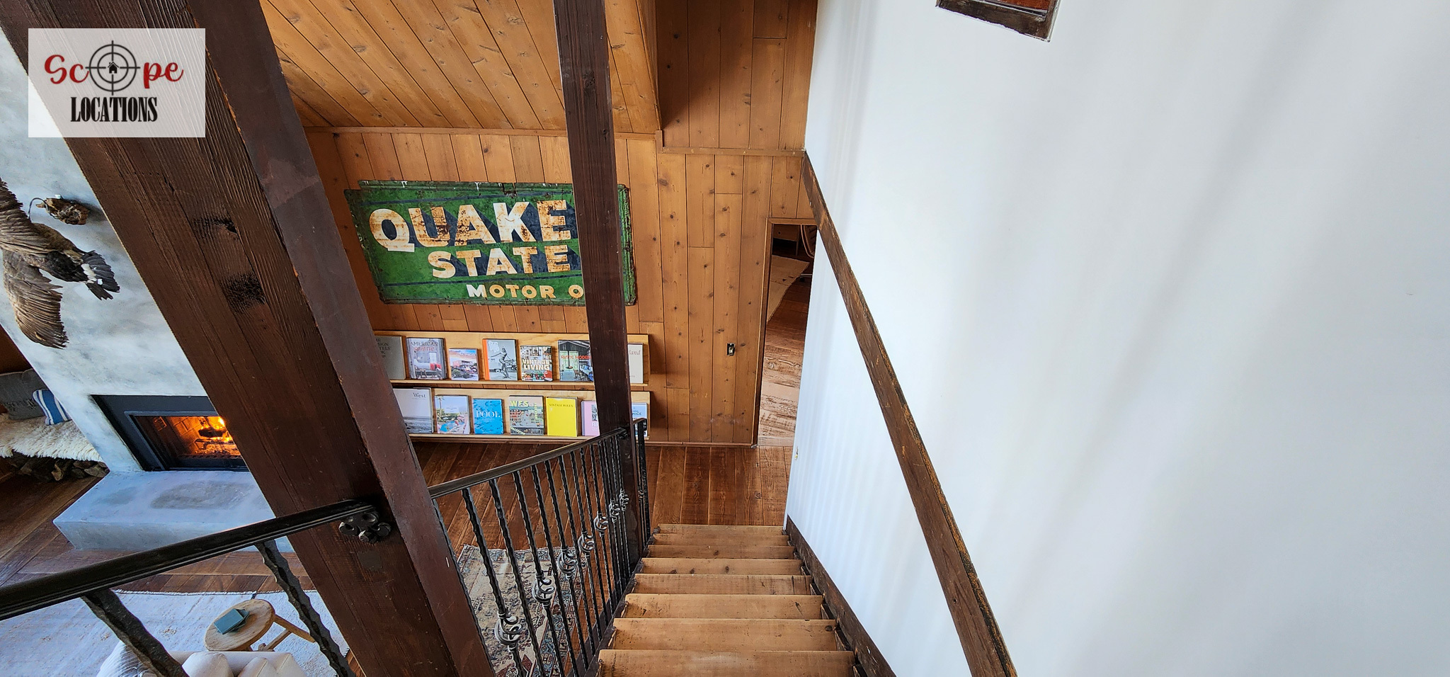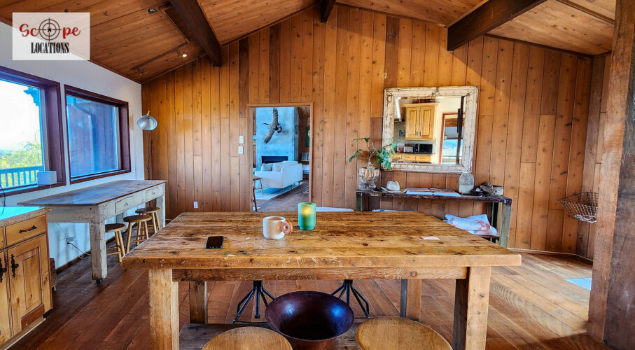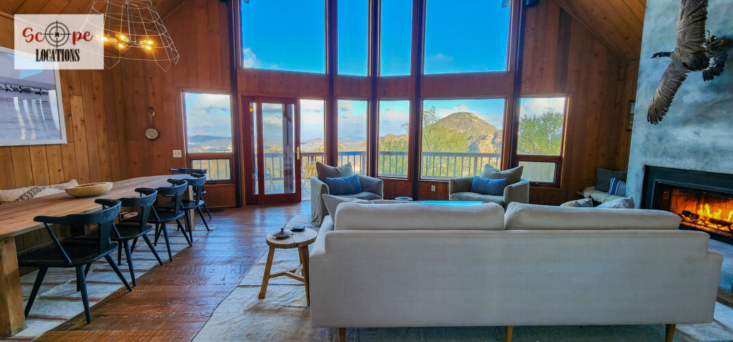 - Living Room: 30-foot high pitched ceiling, floor-to-ceiling glass windows, wood cladding & beams, wood-burning fireplace.