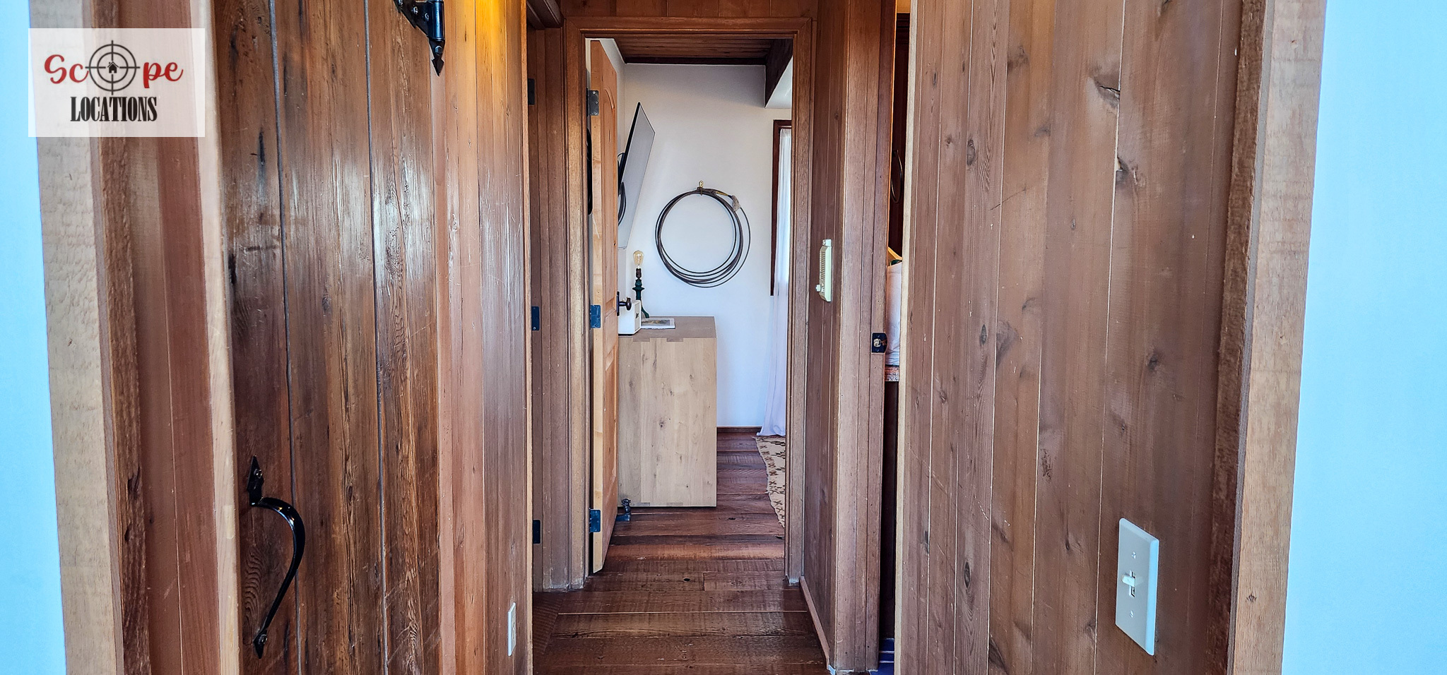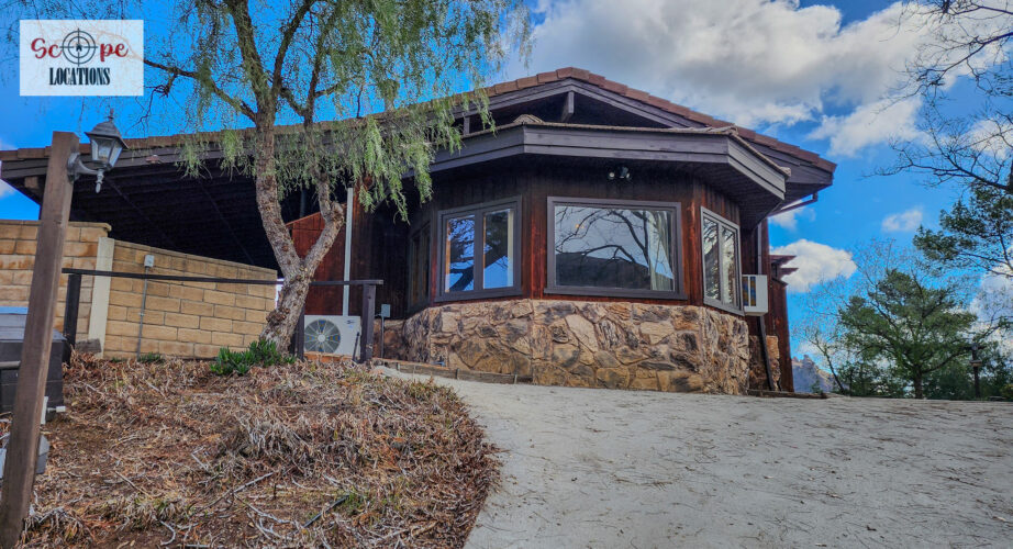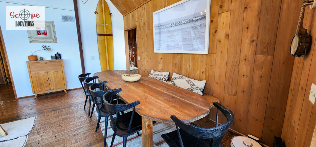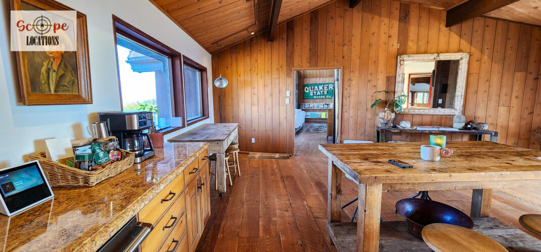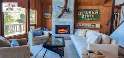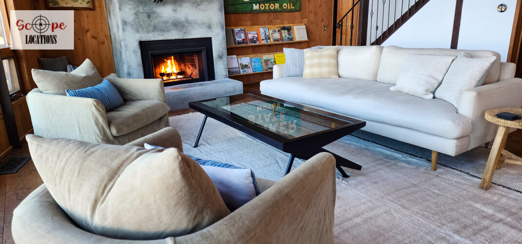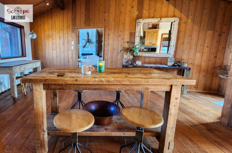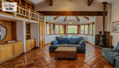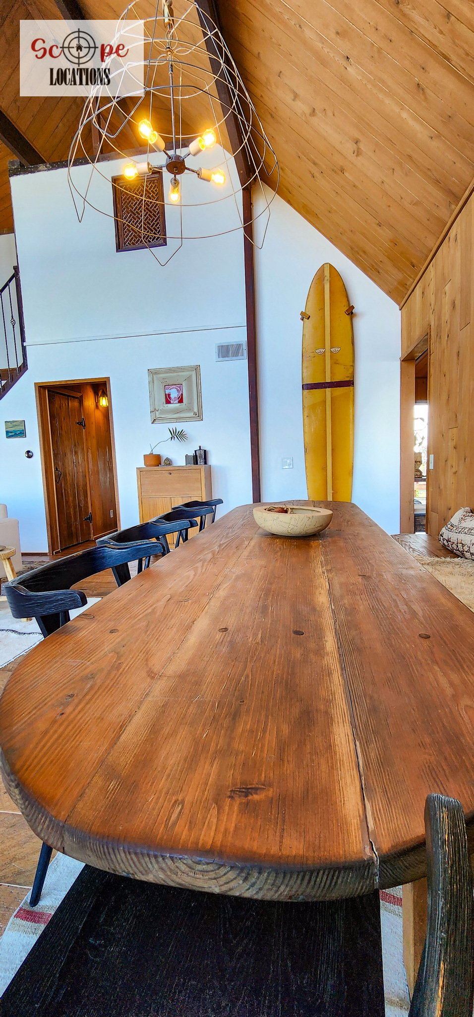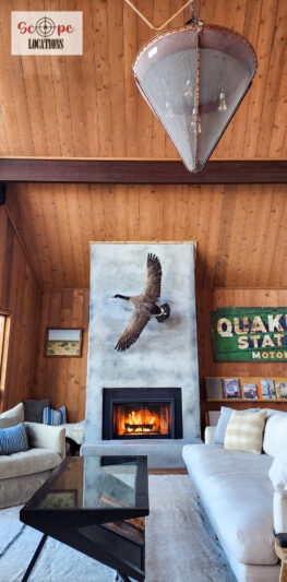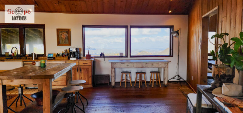 - Living Room: 30-foot high pitched ceiling, floor-to-ceiling glass windows, wood cladding & beams, wood-burning fireplace.