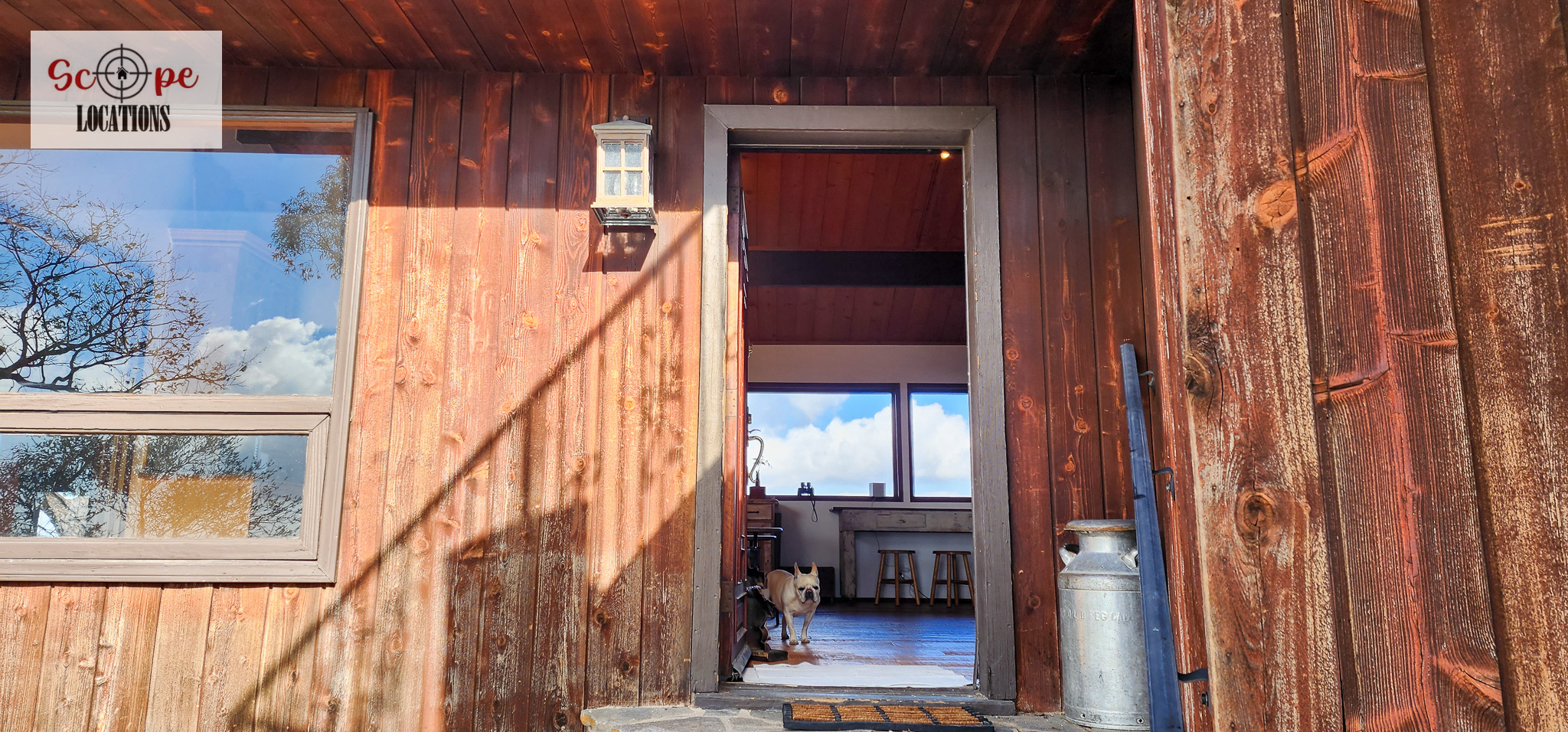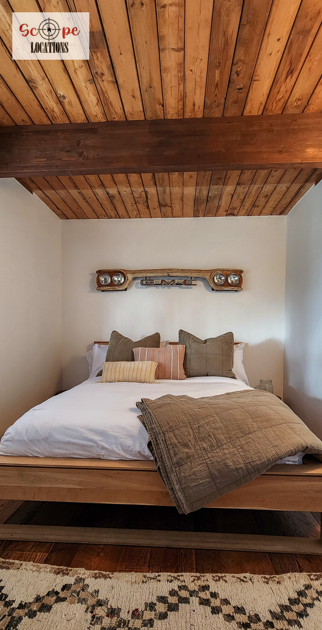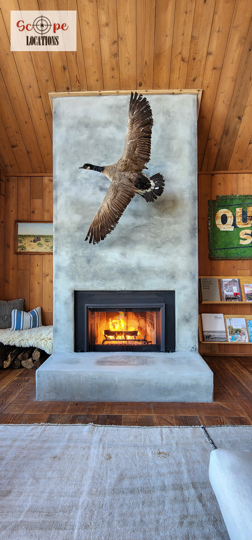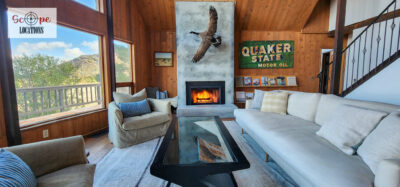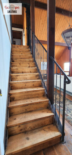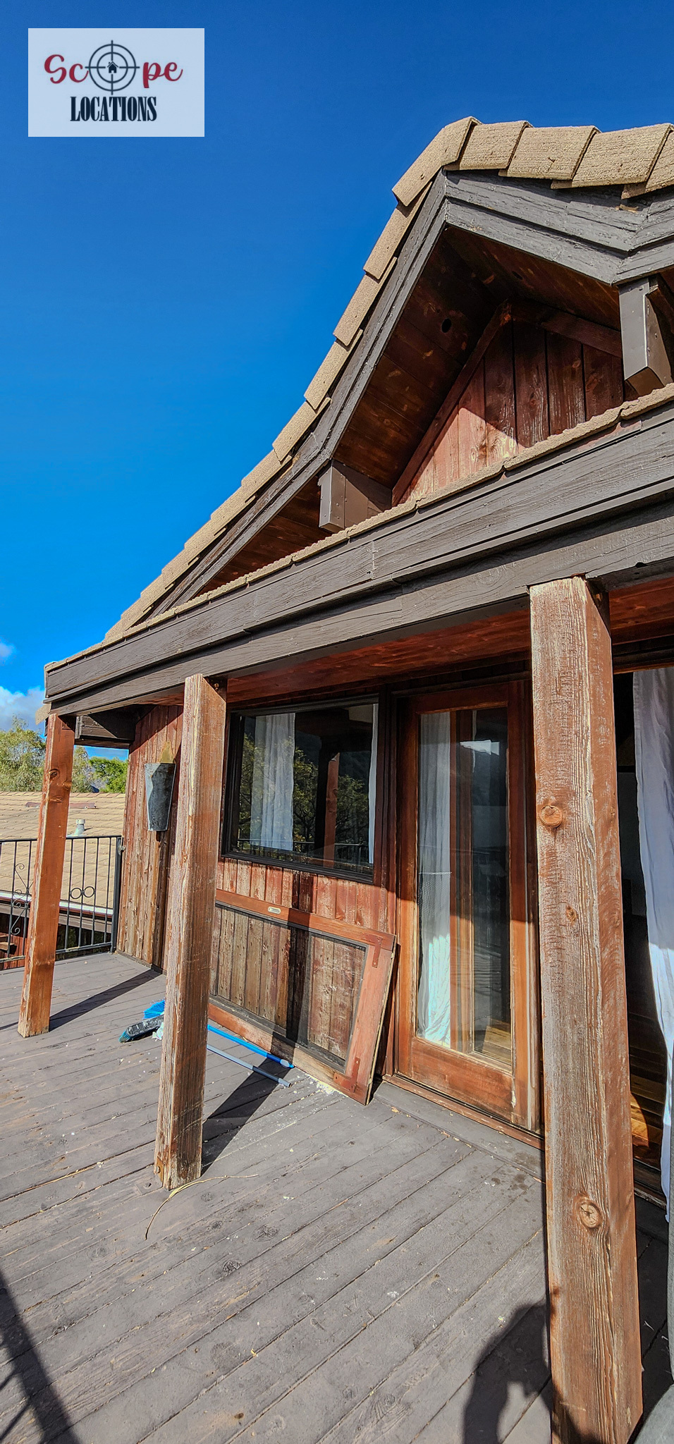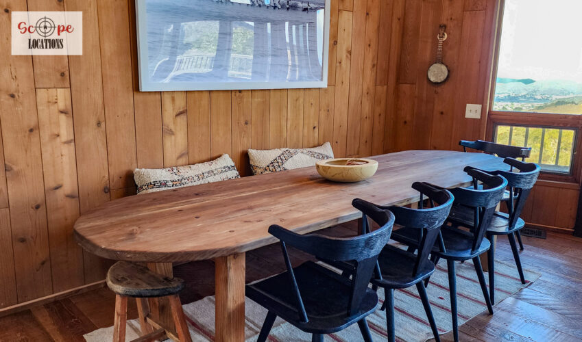 - Living Room: 30-foot high pitched ceiling, floor-to-ceiling glass windows, wood cladding & beams, wood-burning fireplace.