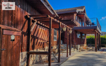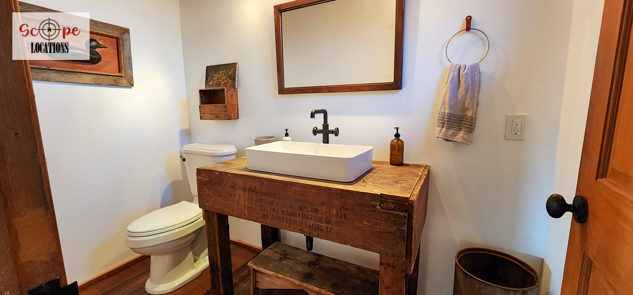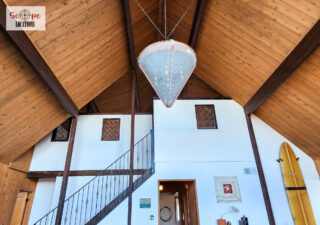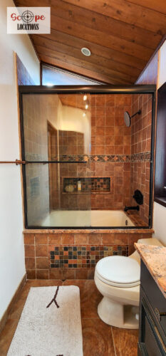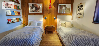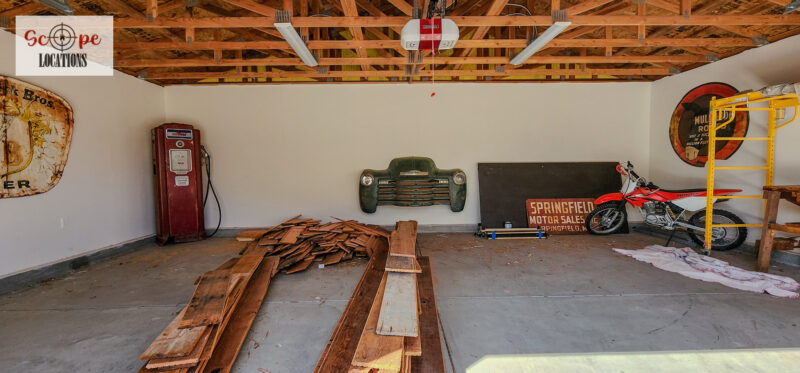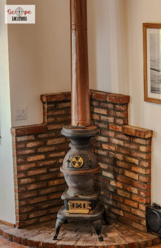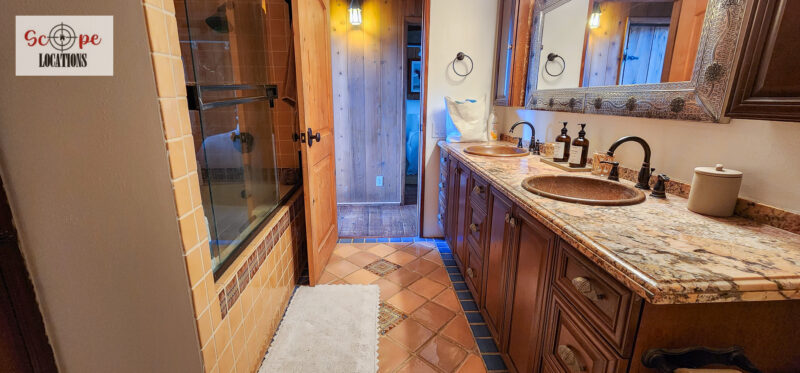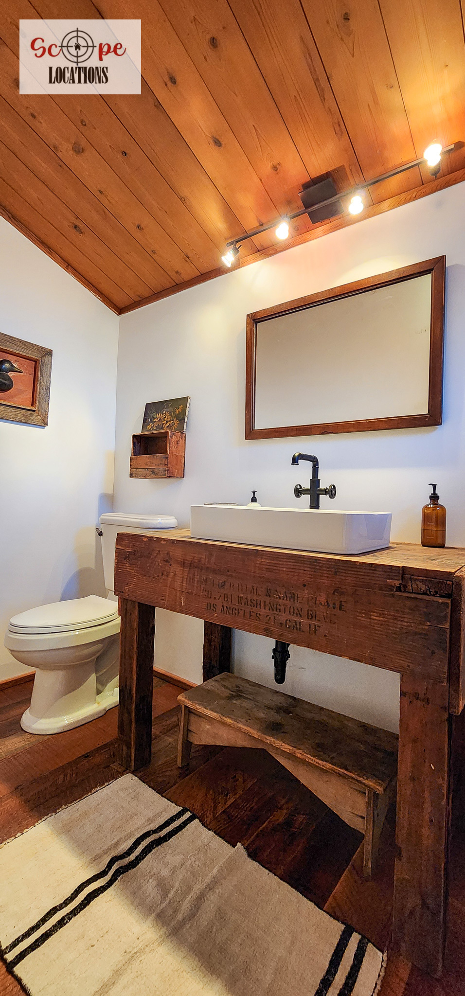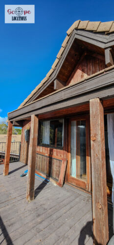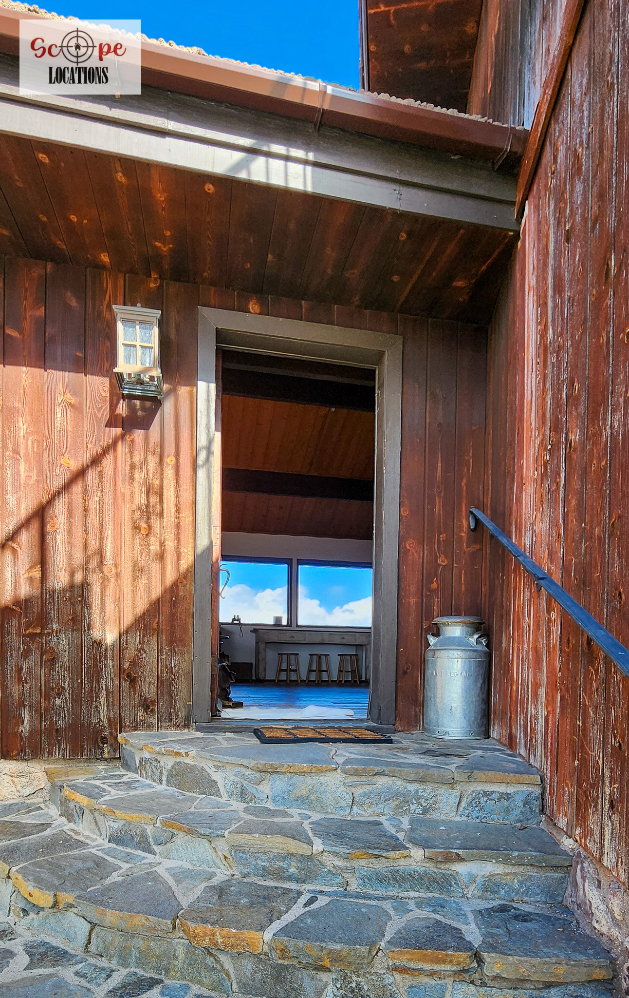 - Living Room: 30-foot high pitched ceiling, floor-to-ceiling glass windows, wood cladding & beams, wood-burning fireplace.