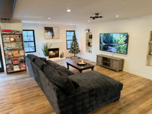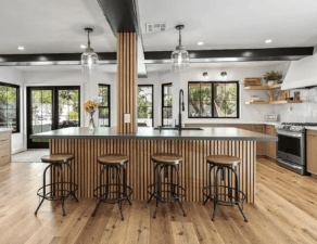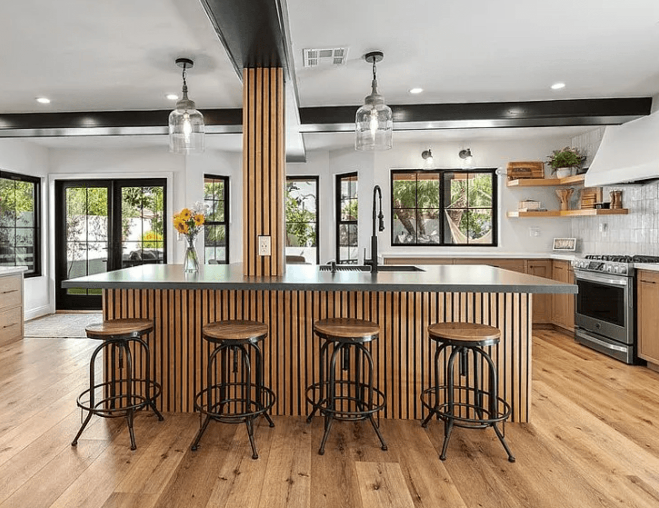 The kitchen flows seamlessly from the living room and features black quartz countertops, decorative backsplash, floating shelves, and custom wooden cabinets, making it a chef’s paradise.
