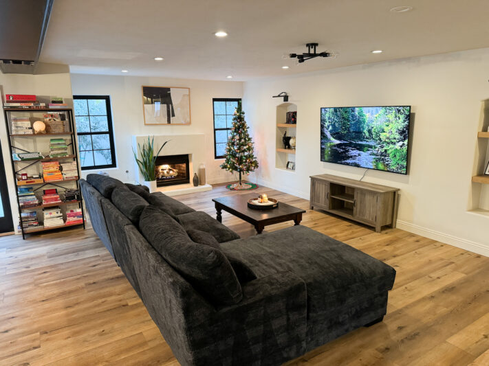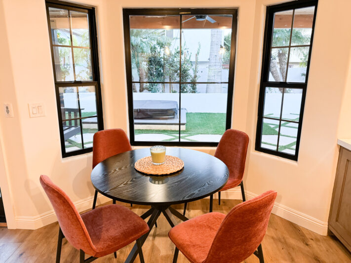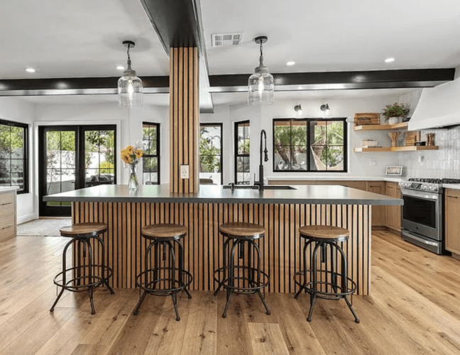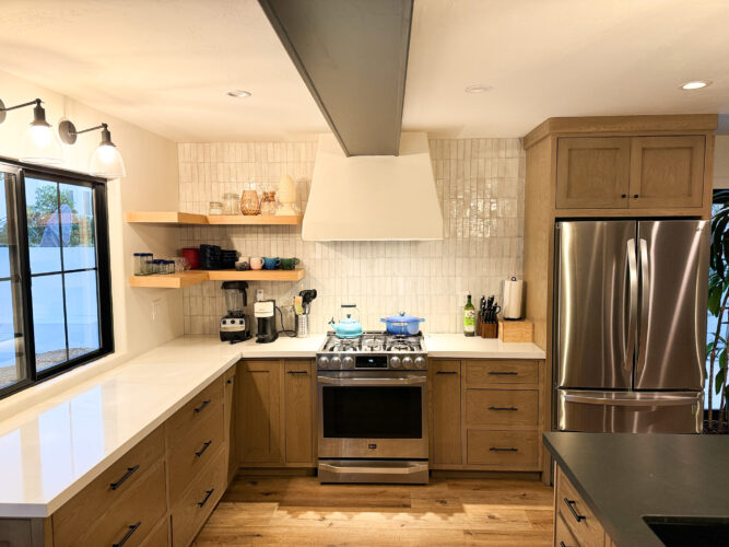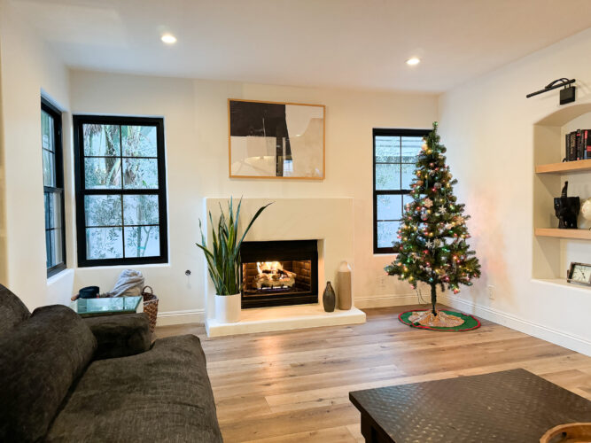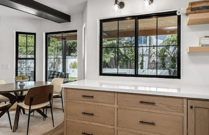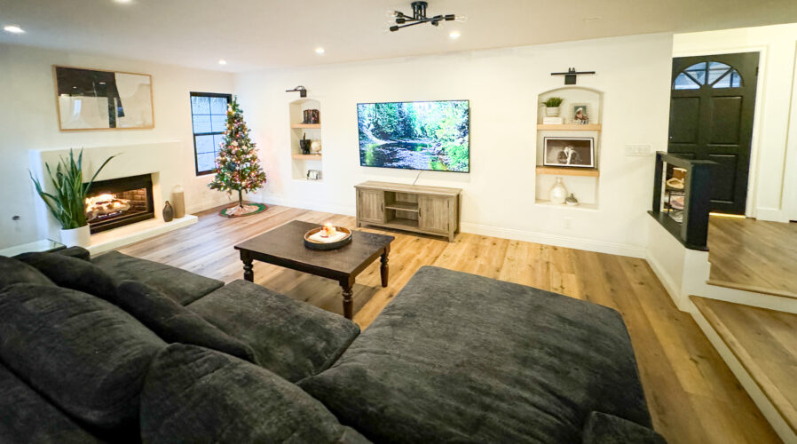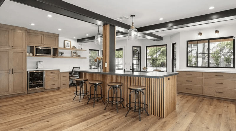 Beautifully upgraded home with a newly remodeled modern farmhouse interior. Enjoy the resort-like backyard flanked by beautiful olive trees and succulents. The custom open floorplan kitchen with an oversized island is perfect for content shoots, photos, or film. The living room boasts natural light, pristine white walls, ceilings with hand troweling finish, custom windows, French doors, and recessed shelves with photogenic styling.