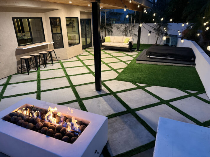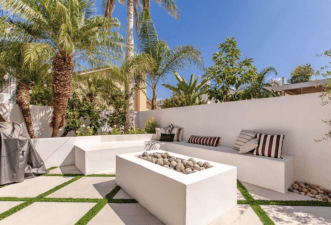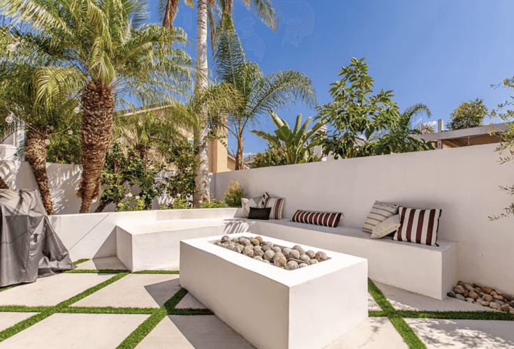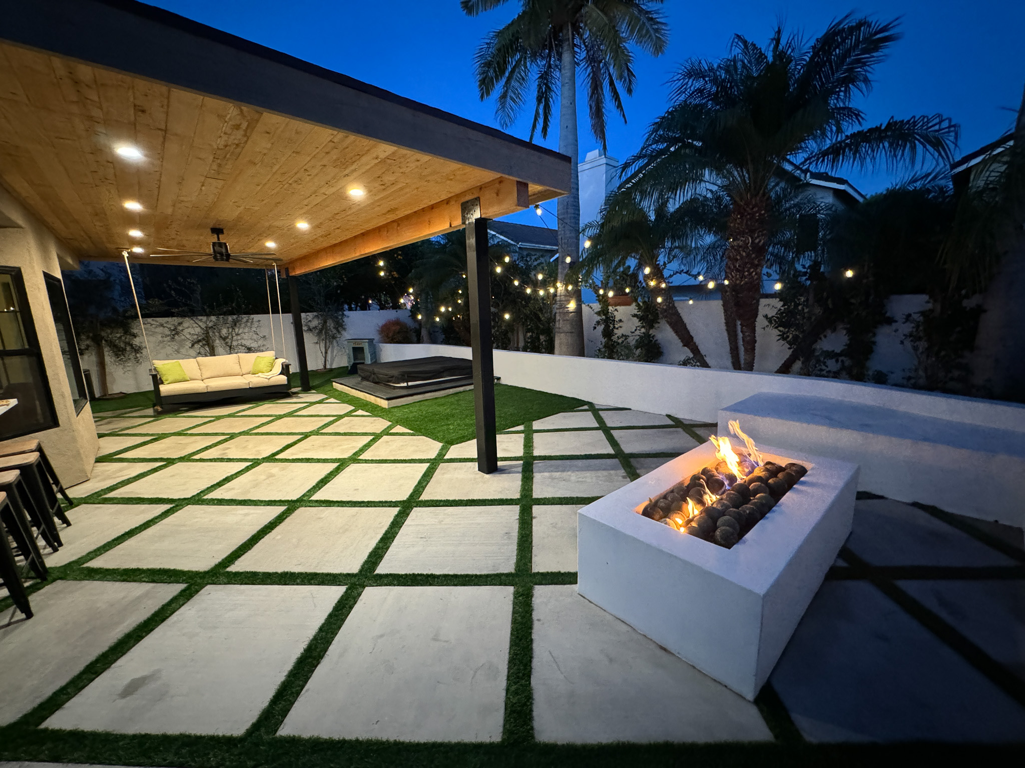 Step into the serene backyard with lush landscaping, white smooth stucco walls, diamond concrete pavers with turf and an artificial turf dog run. The yard features a newly upholstered daybed swing under the shade of a custom patio cover, an Artisian Spa, and a beautiful gas fire pit with ample deep bench seating.