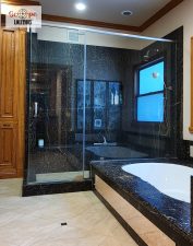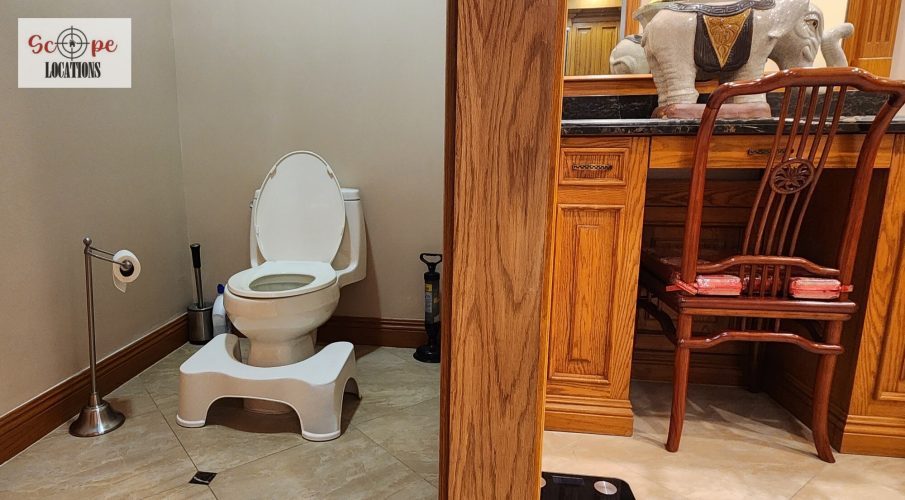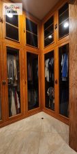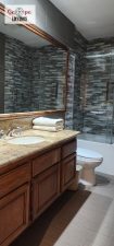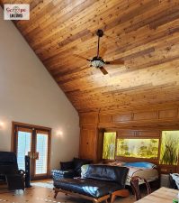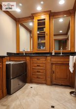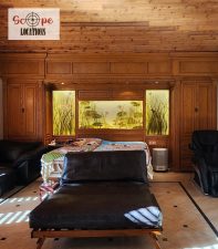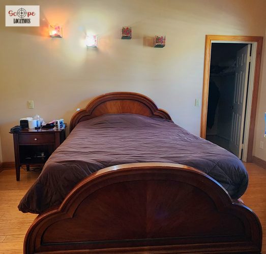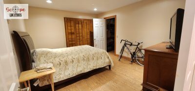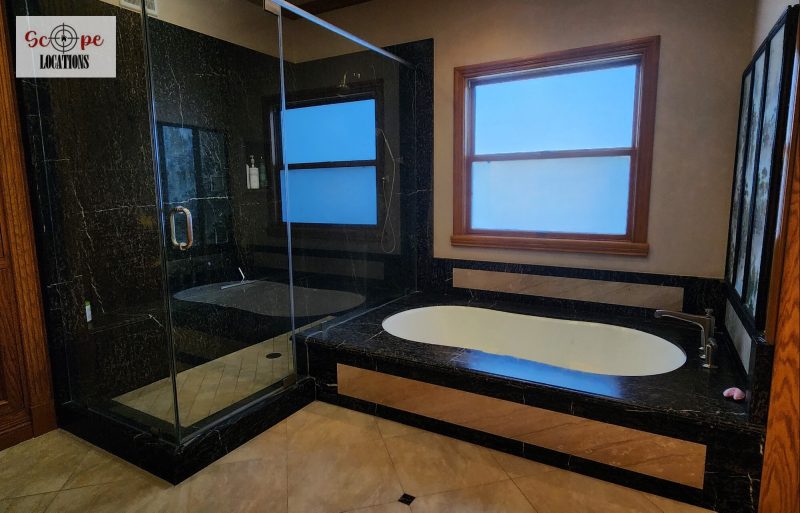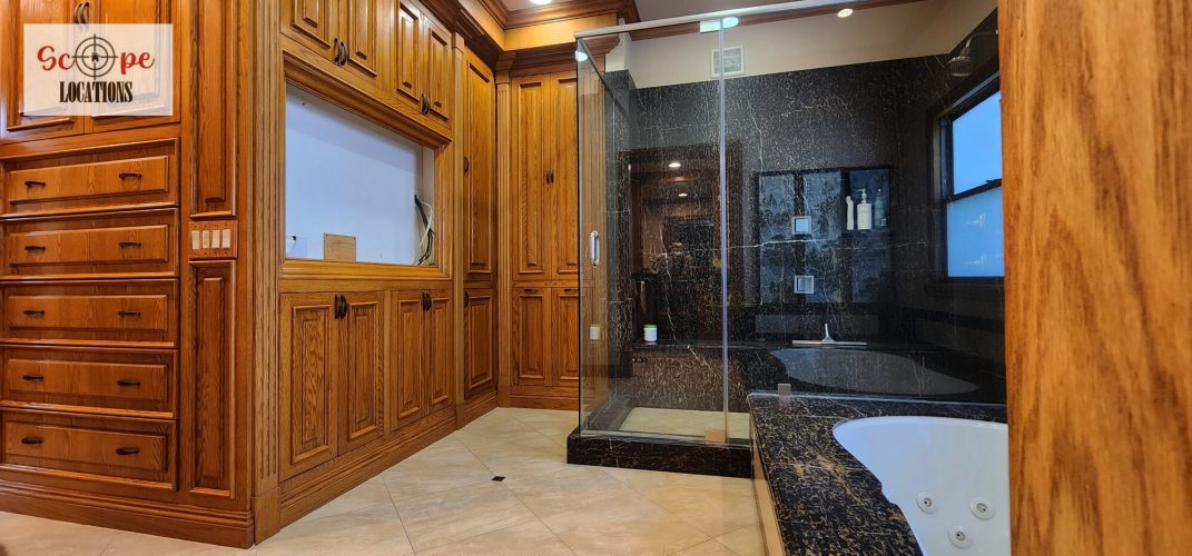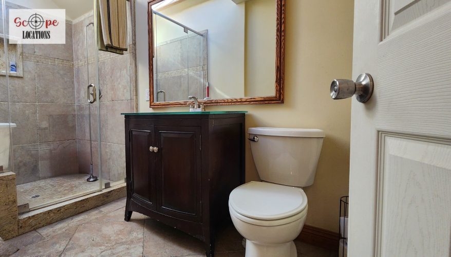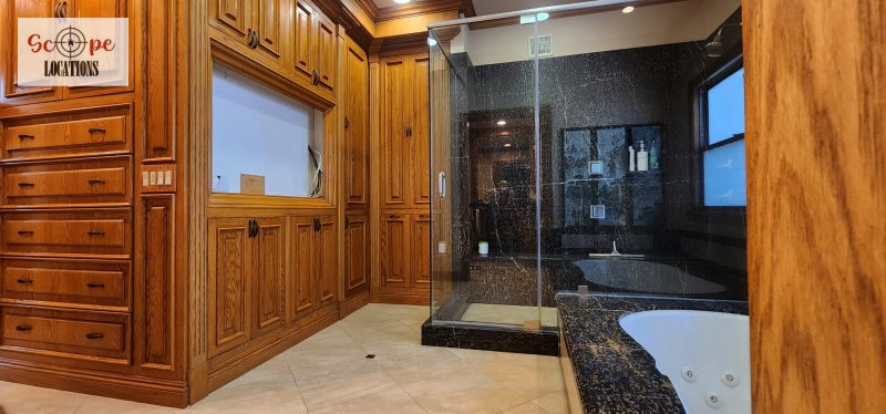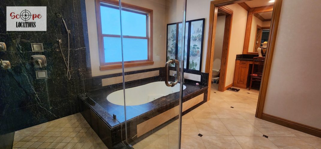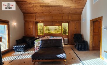 The main floor hosts four bedrooms and four bathrooms, including the spacious master bedroom with built-in natural wood cabinets, a fireplace, pitched wooden ceilings, an accent light-up wall, and a master bathroom with black marble shower walls and tub surround, adorned with natural wood paneling. Two walk-in closets with glass doors add to the luxurious feel. Upstairs, a loft-like additional large bedroom awaits, featuring pitched ceilings and skylights. The ensuite bathroom includes a glass shower enclosure and skylights for added charm.